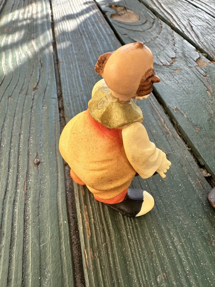 Add a touch of whimsy to your home decor with this charming lot of two ANRI wood handcrafted clown figurines. Each figurine stands at 4.5 inches tall and features a unique asymmetrical shape with intricate carvings and hand-painted details. The clowns are holding yellow balloons and are perfect for any room, including the office, living room, dining room, and even the hallway. These limited edition and special edition figurines are perfect for collectors and those who appreciate handcrafted art. The clowns are made of high-quality wood and are suitable for display on furniture and windows. This lot is an excellent addition to any collection and will surely bring a smile to your face. One missing the ball
