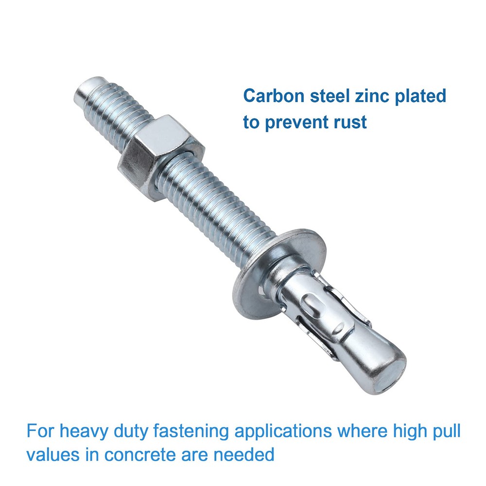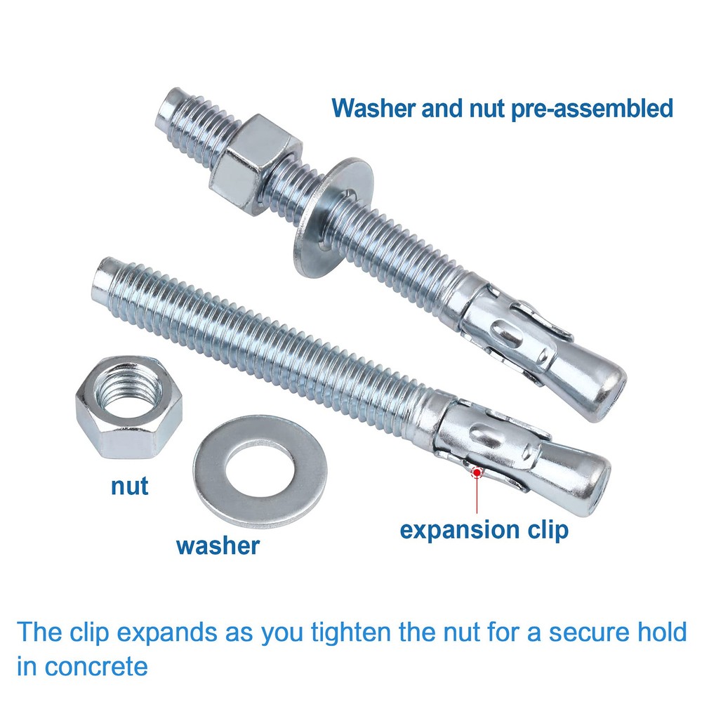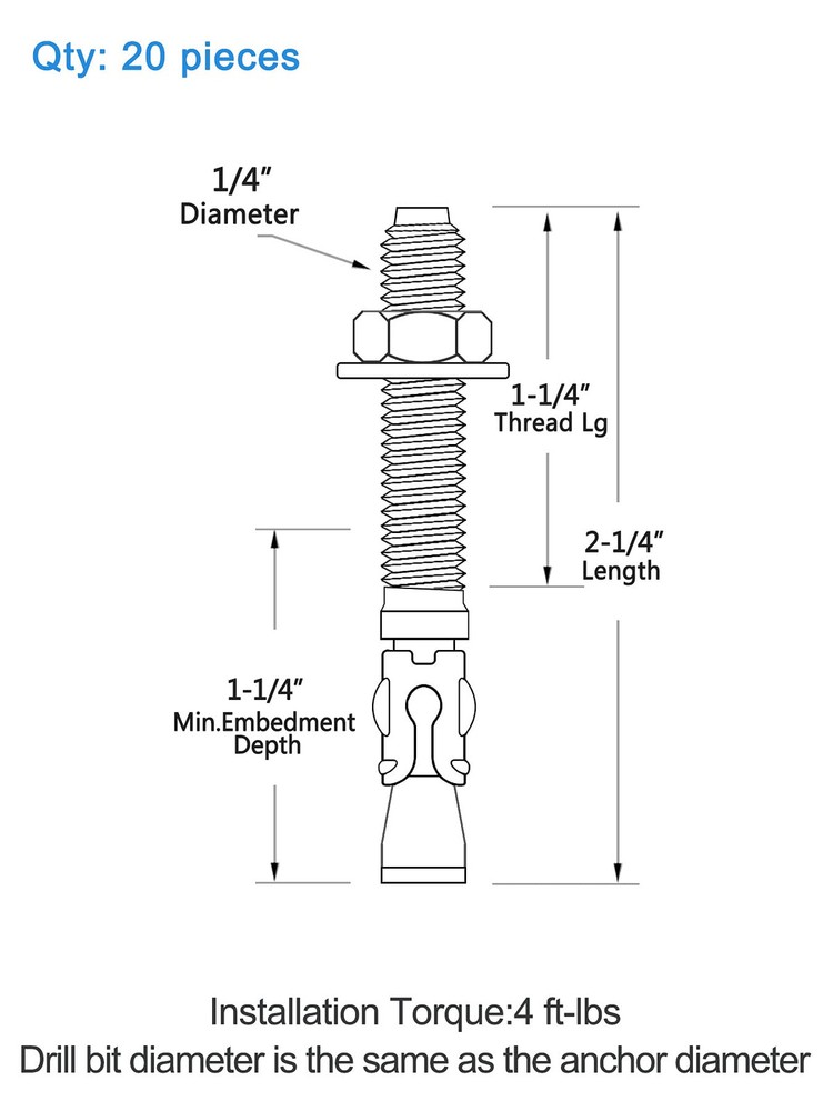 Application The Anrik wedge anchor is made from high quality carbon steel, and is zinc plated. The concrete anchor is a torque-controlled, wedge expansion anchor for heavy duty fastening applications where high pull out values in concrete are needed. It is for Concrete only, not for block or brick base material Diameter of Anchor The diameter of the anchor is 1/4" Length Anchor The length of the anchor is 2-1/4" Quantity: 20 pieces Drill Bit Diameter/Hole Diameter Drill bit diameter is the same as anchor diameter. Use a 1/4" drill bit to drill a hole in the base material (Concrete only) Thread Length The length of the threads on the anchor is 1-1/4" in length Minimum Embedment Depth The minimum embedment depth into the concrete is 1-1/4" Torque Value The required installation torque of the anchor is 4 ft/lbs Maximum fixture thickness The maximum fixture thickness or the maximum thickness of the material being fastened for the anchor is 1". This will ensure that the minimum embedment depth of 1-1/4" will be met Wedge anchor diameter: 1/4" | Length: 2-1/4" | Qty: 20 pieces. Our wedge anchor is made from high quality carbon steel, and is zinc plated to prevent rust Drill bit diameter/Hole diameter is the same as anchor diameter. Use a 1/4" drill bit to drill a hole in the base material (Concrete only) The wedge anchor is a torque-controlled, wedge expansion anchor. The required installation torque of the anchor is 4 ft/lbs. The concrete anchor is for heavy duty fastening applications where high pull out values in concrete are needed. It is for concrete only, not for block or brick base material The wedge anchor is used in fastening sheet metal, steel and aluminum angles, or wood to concrete. The wedge anchor is ideal for structural anchorage, storage racking anchorage, machinery and hand rails installation