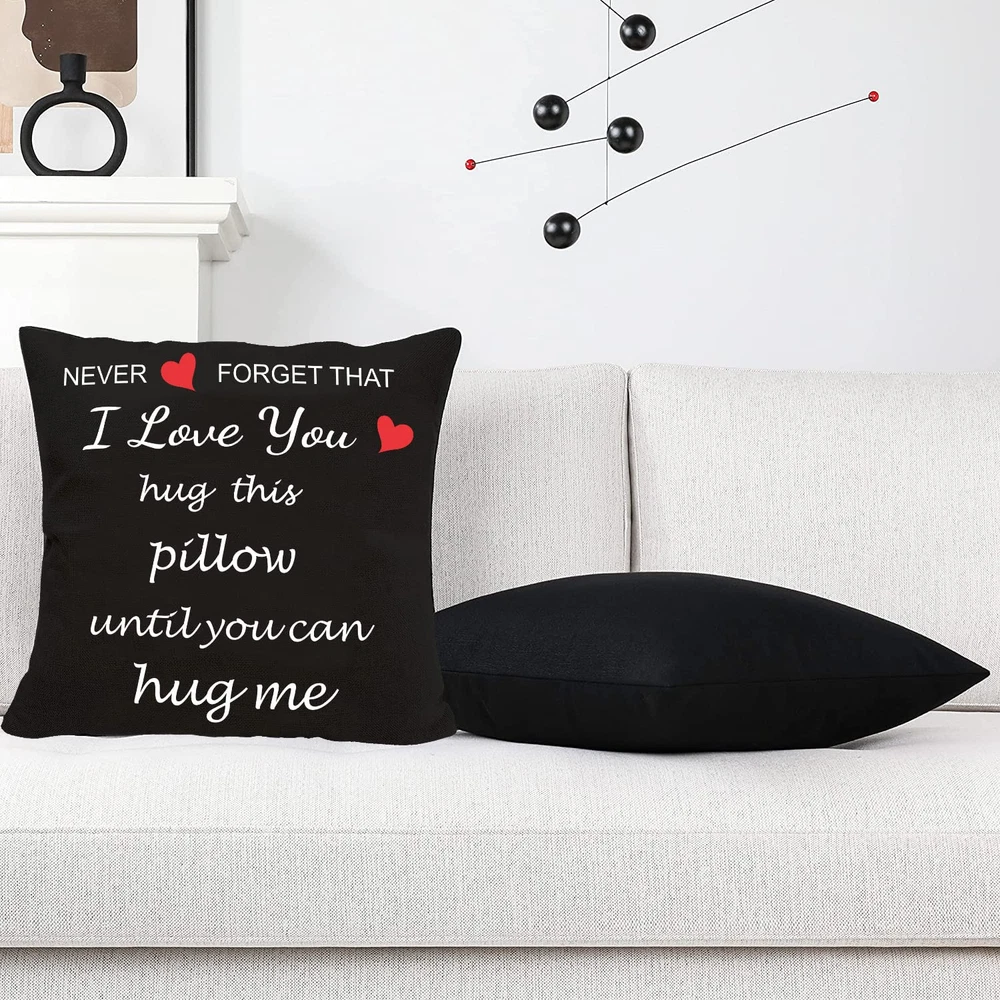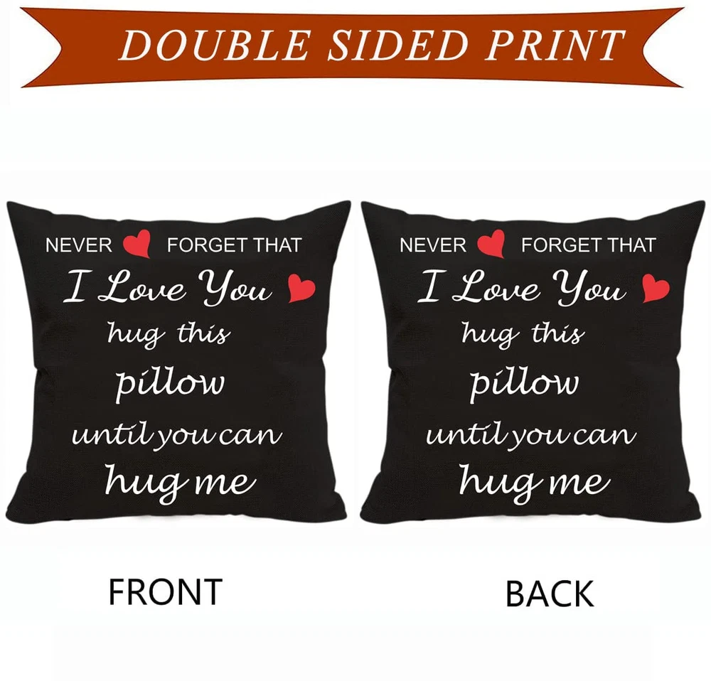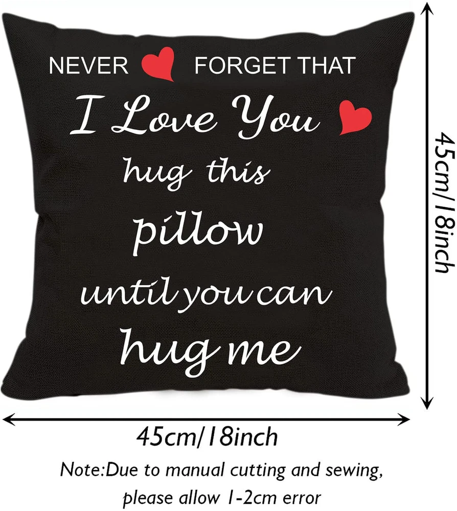 【Double Sided Printing】Tragdro Two sided printing best lover couple sweetheart present sweet sayings never forget that i love you hug this pillow until you can hug me.(NOTE!!! : Not Include Insert or Filler!) 【Invisible Zipper】This i love you cushion cover has an invisible zipper, Hidden zipper closure makes the appearance more elegant and easy to cram your pillow/filler into this cover. 【Comfortable, Durable Material】I love you pillow covers are made of durable high quality cotton linen material, comfortable & soft touch, breathable, durable and stylish. Measures 18''x18'' inches, 45 x 45 cm. 【Wide Application】Pillow cases attractive pattern printed on two side, decorate your home with this attractive linen cushion cover, add a touch of graceful color to your bedroom or living room. Modern fashion style design, easy to match your sofa & other pillows, suitable for every season. 【Perfect Gift Idea】This delicate pillow case is a great gift for her/him on birthdays, anniversaries, Valentine's Day, Thanksgiving, Christmas or other special occasions.
