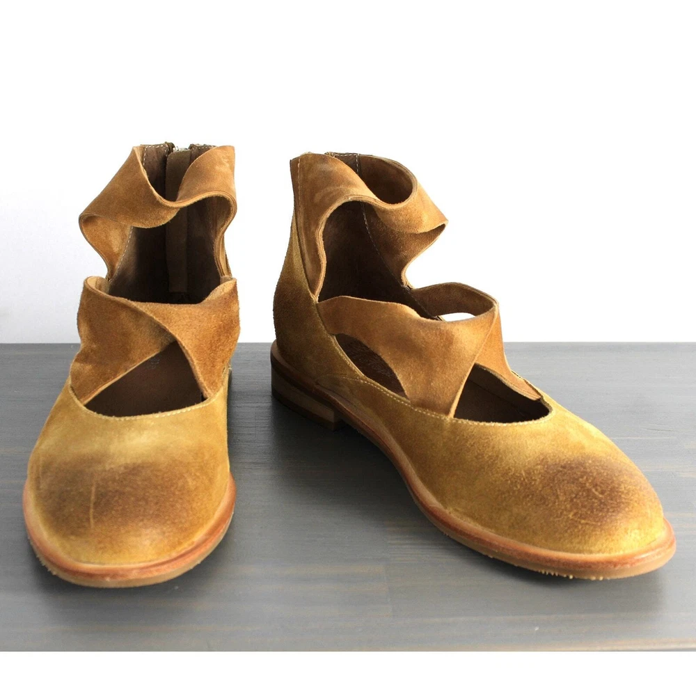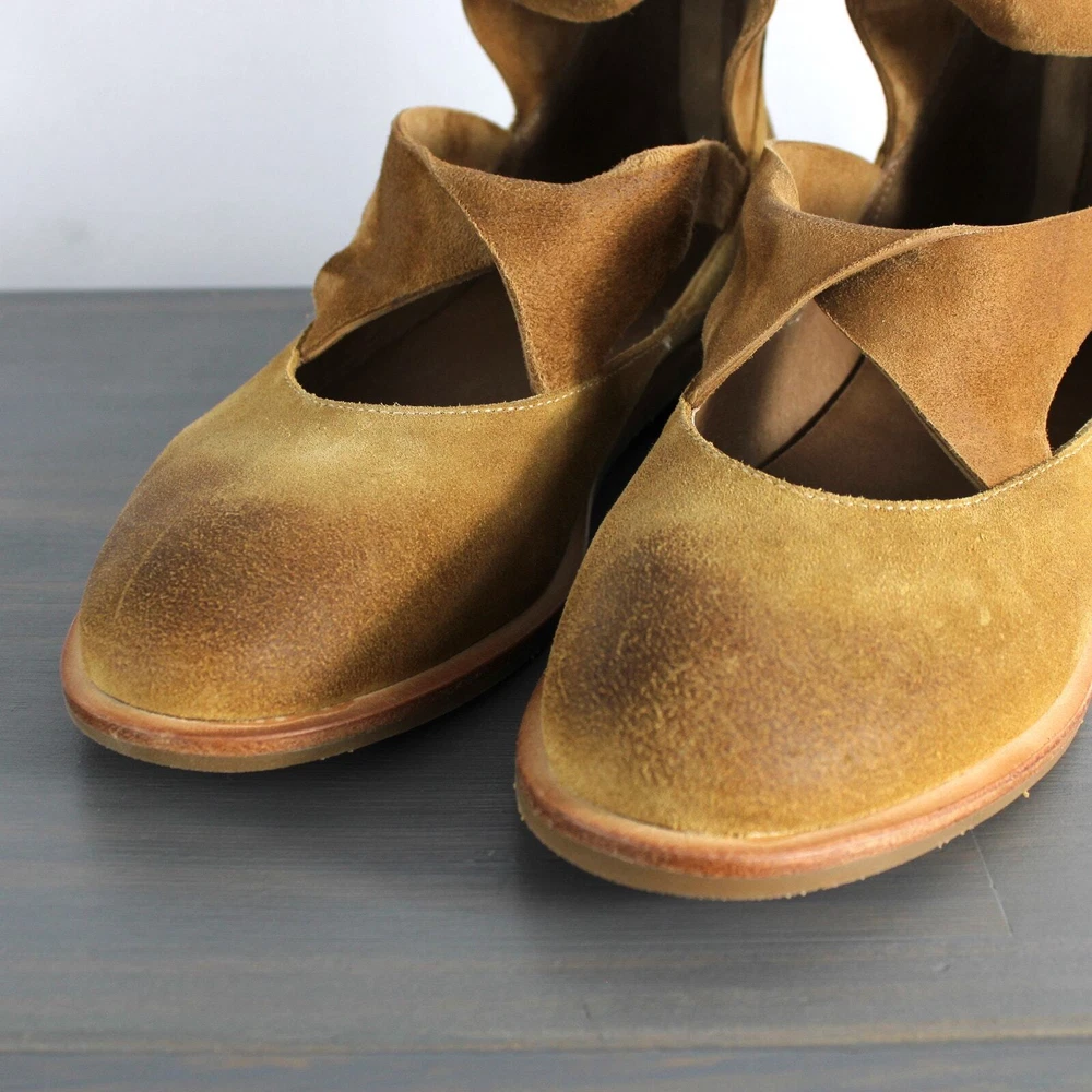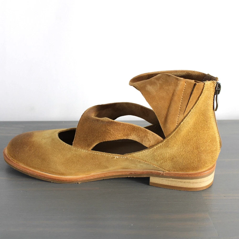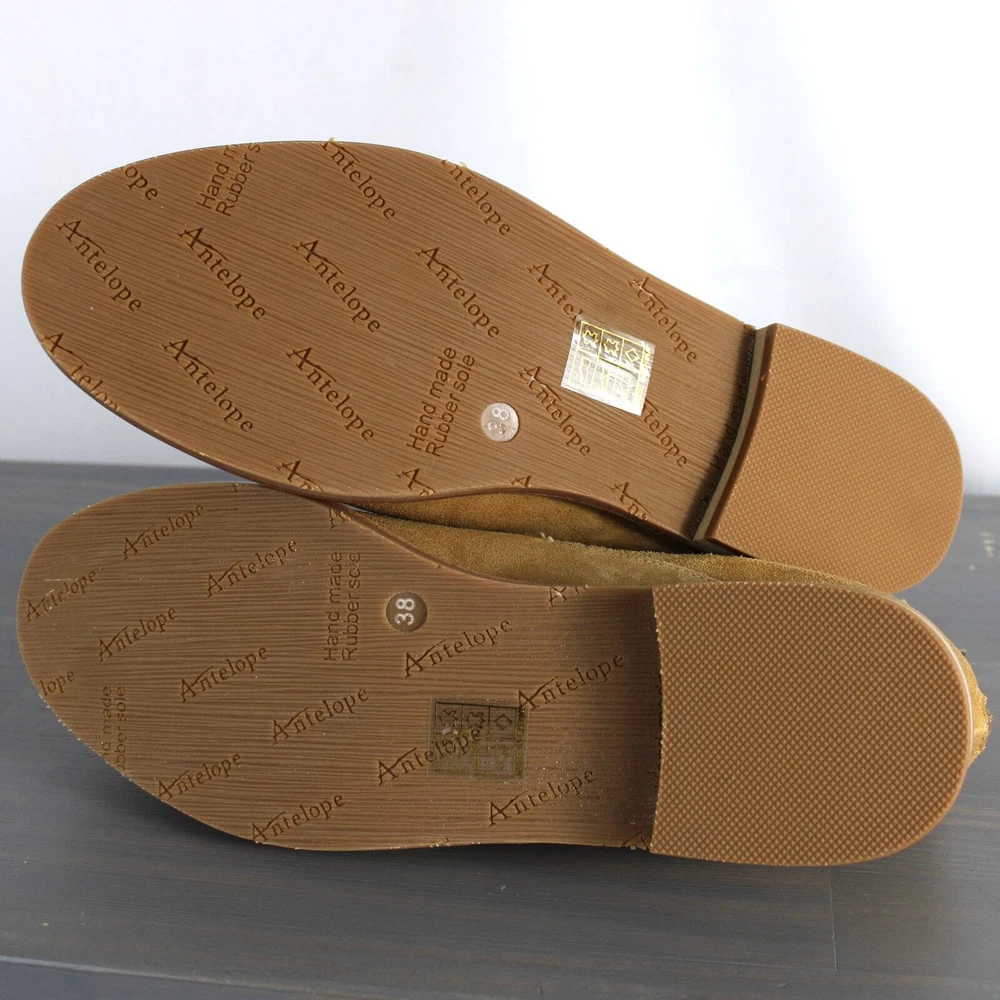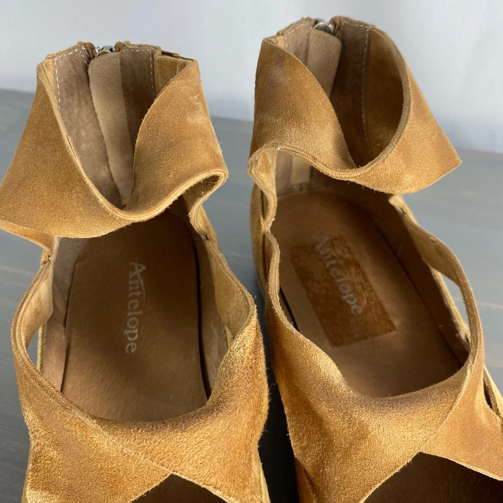 Antelope Lalana Women's Strappy Flat Suede Shoes Soft camel tan suede with twisted strap design and a touch of distress look. Ankle strap with zipper pull closure Round toe Leather upper and lining/rubber sole New without box with signs of store's try on - some blemishes on the interior side and a price sticker residue on one shoe Boho - bohemian - casual women's shoes - versatile - mary jane style - minimalist