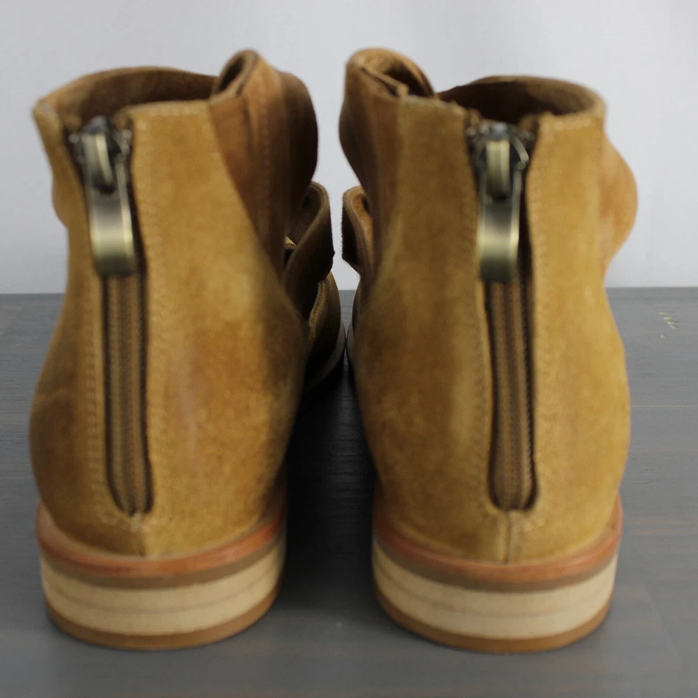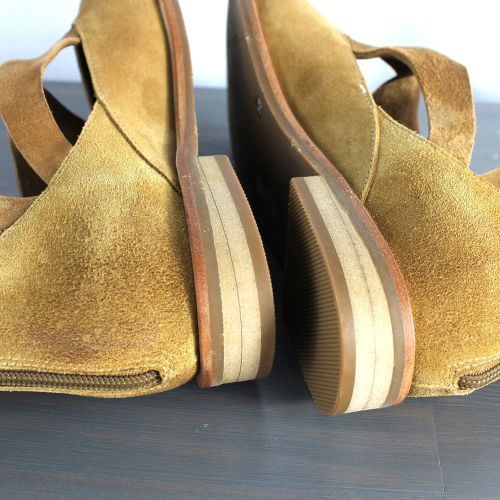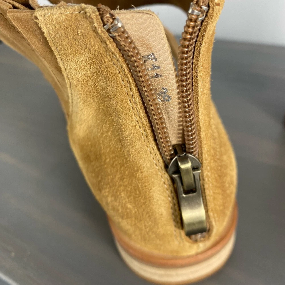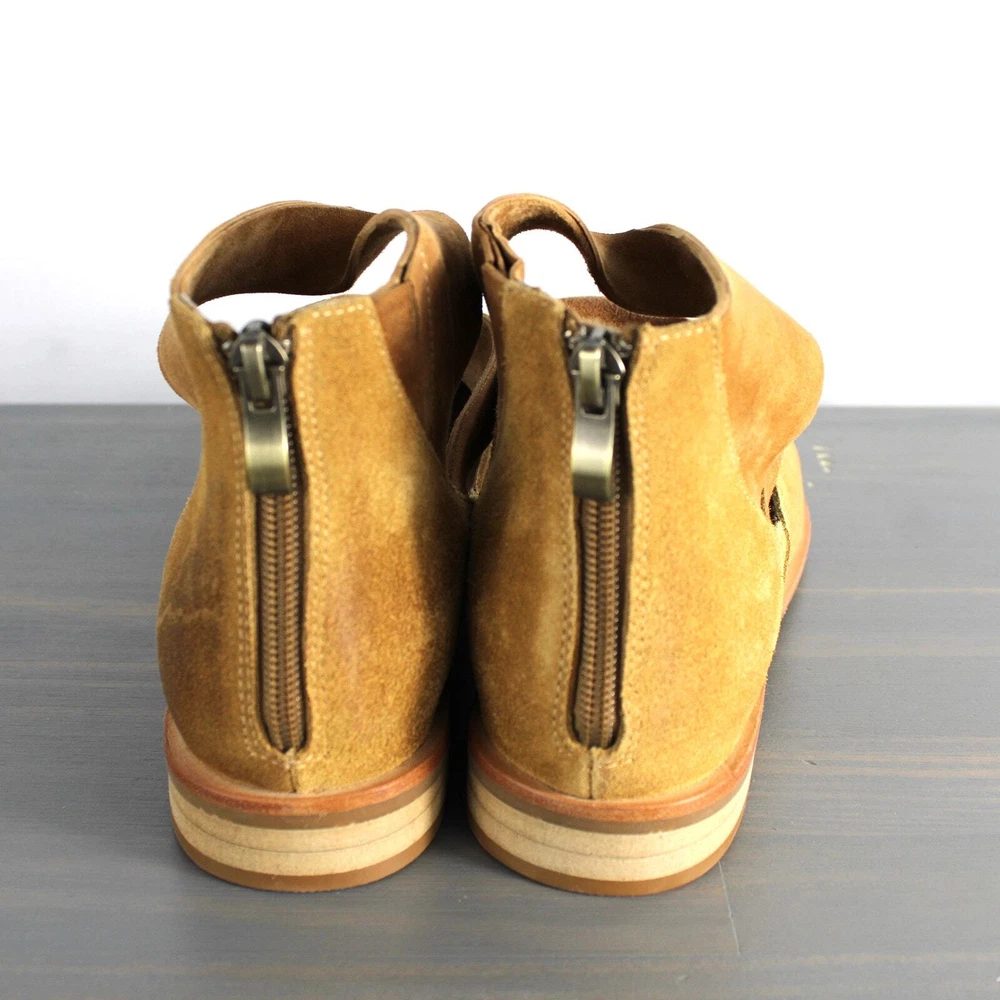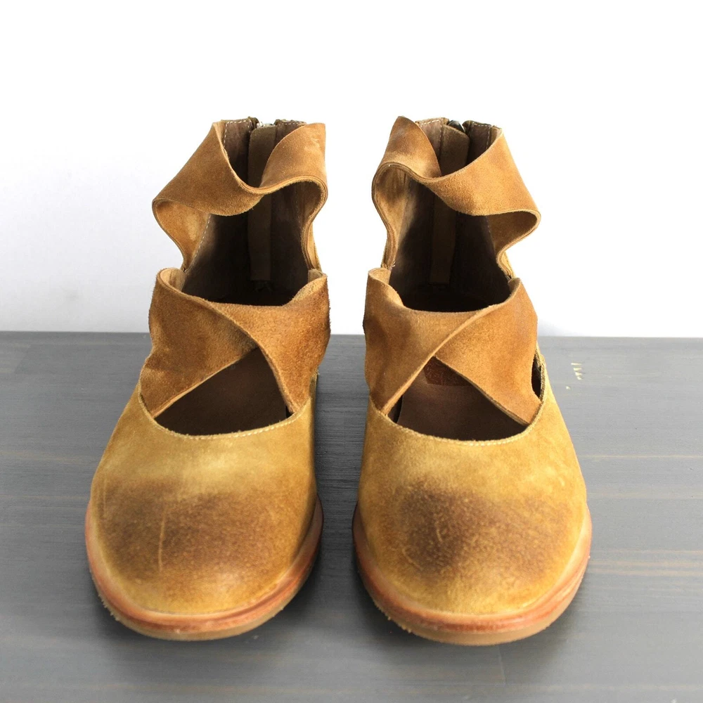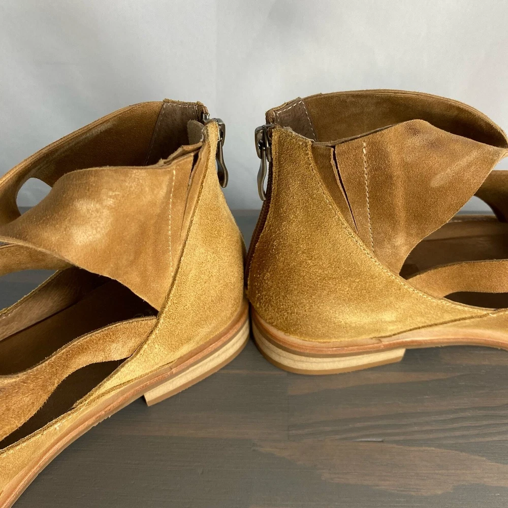 Antelope Lalana Women's Strappy Flat Suede Shoes Soft camel tan suede with twisted strap design and a touch of distress look. Ankle strap with zipper pull closure Round toe Leather upper and lining/rubber sole New without box with signs of store's try on - some blemishes on the interior side and a price sticker residue on one shoe Boho - bohemian - casual women's shoes - versatile - mary jane style - minimalist