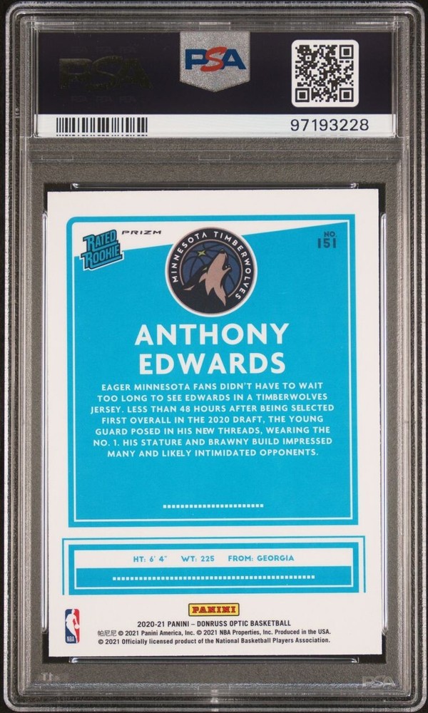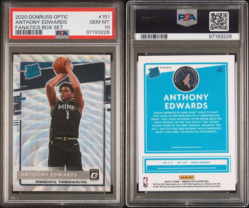 This is a rare and highly sought-after Anthony Edwards 2022 Panini Prizm sports trading card. The card features a stunning wave design and is a limited edition parallel variety. It is an original, not a licensed reprint, and has been graded a perfect GEM-MINT 10 by PSA. The card is from the National Basketball Association (NBA) and features Anthony Edwards, a rookie player for the Orlando Magic team. It is made of high-quality card stock material and has the card number #151. The card is in English language and manufactured in the United States by Panini. This card is a great addition to any sports trading card collection and is a must-have for fans of the NBA Finals.