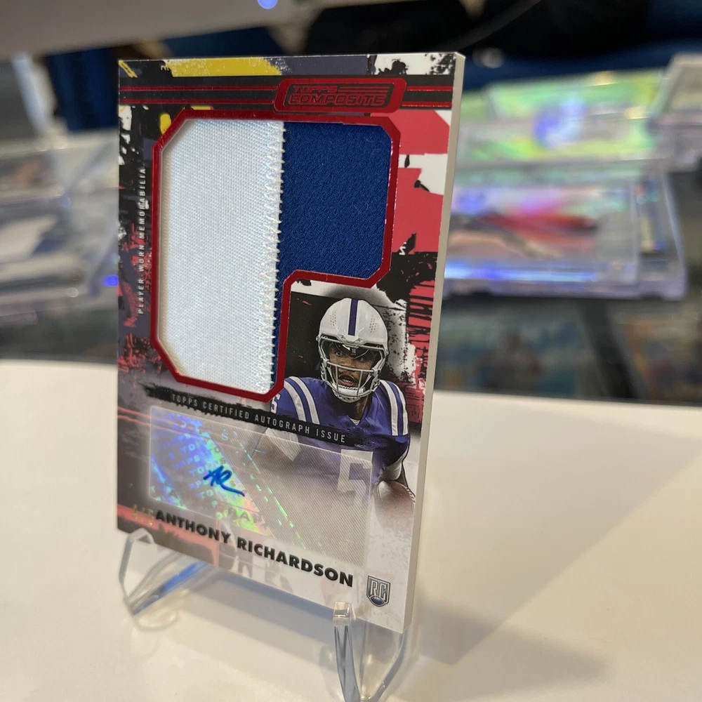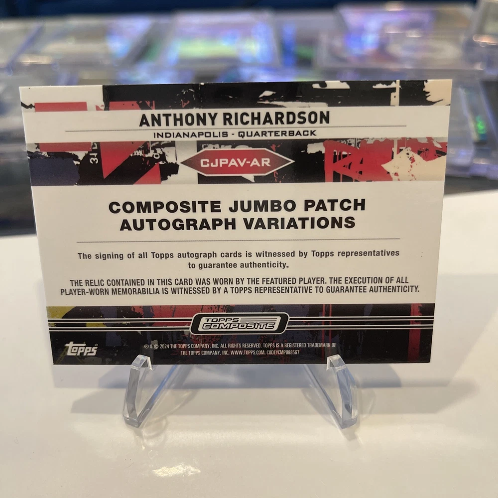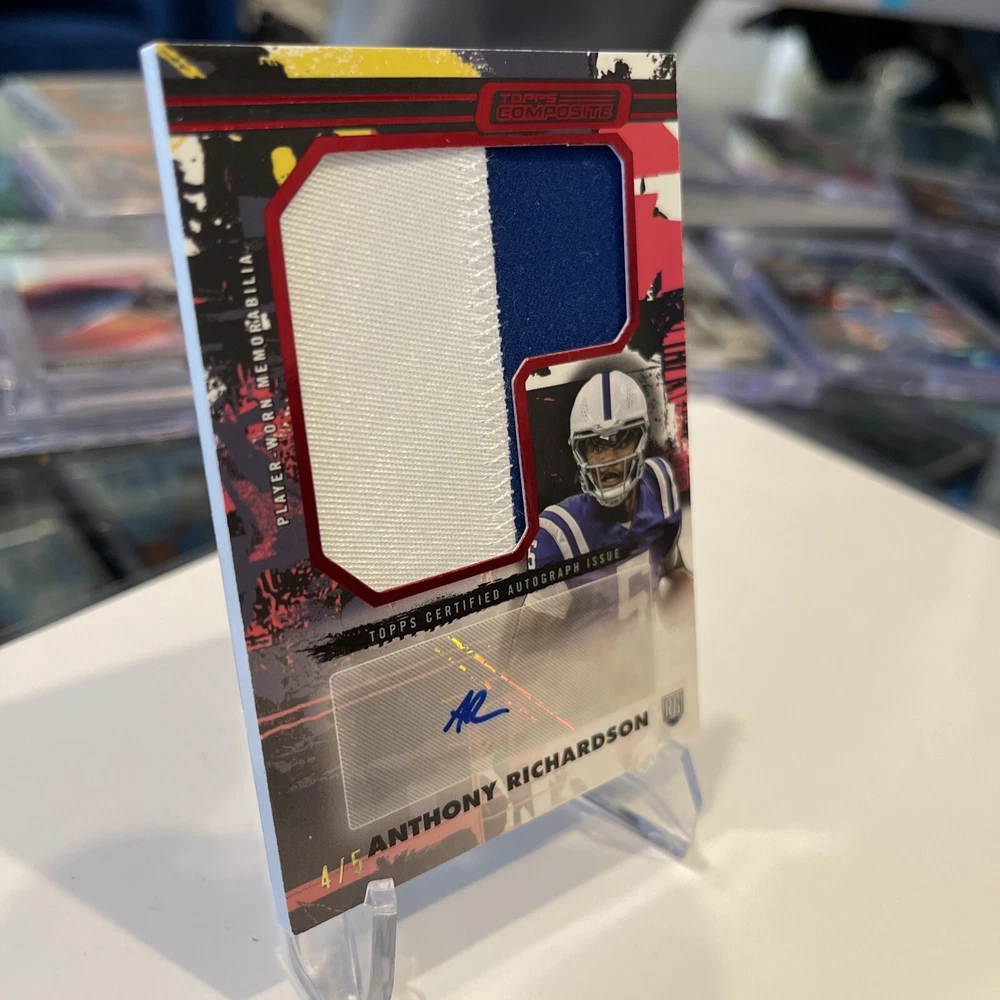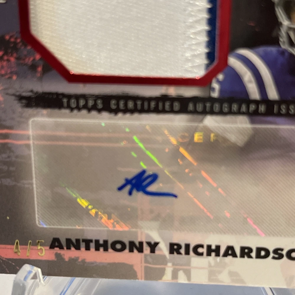 The product is a 2023 Topps trading card featuring Anthony Richardson, a rookie player for the Indianapolis Colts in the National Football League (NFL). This rare card is autographed by Richardson and includes a red patch from his jersey, with only 5 copies produced. It is a serial numbered parallel variety card, denoted by the CJPAV-AR card number, making it a highly sought-after collectible for fans and collectors.