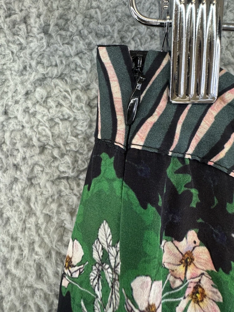 The Anthropologie Bhanuni by Jyoti Colorful Tiered Floral Maxi Skirt in size 8 features a vibrant multicolor floral pattern with ruffle accents, perfect for a casual bohemian look. Made of lightweight viscose fabric, this long skirt with a mid-rise and zip closure is ideal for summer, fall, or spring occasions. Woven in India, this Anthropologie skirt adds a touch of bohemian charm to your wardrobe with its colorful and layered design.