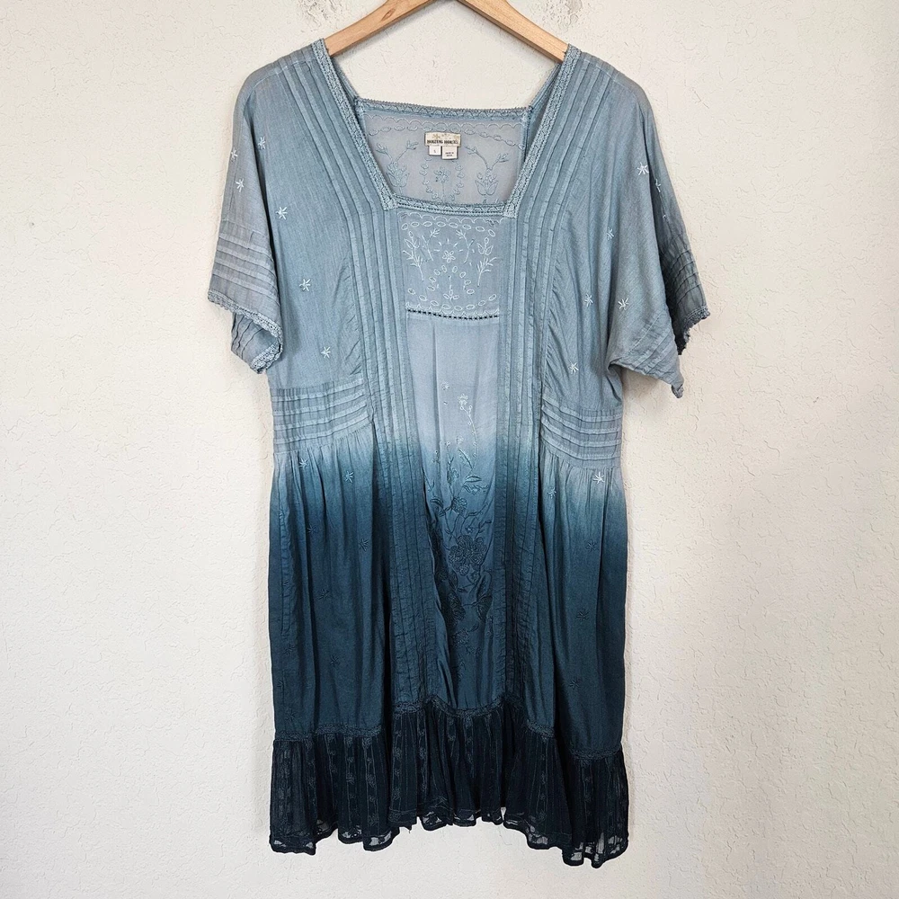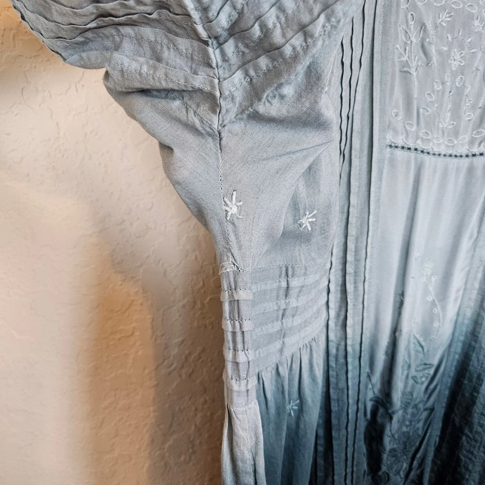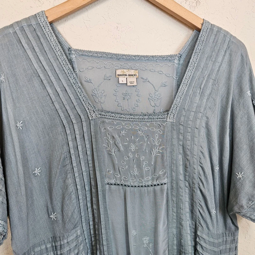 Anthropologie Holding Horses Ocean Dipped Tunic Dress Women's Small Boho Summer •Blue dipped ombré in color. •Woven, gauzy cotton. •Relaxed tunic silhouette. •Embroidered detail. •Pullover styling. •Square neckline. •Pockets. •Lace trim with sheer panels & embroidery. • Pintuck detail •Ruffle Hem • Ombre coloring with Teal Blue green into a sea foam blue Pastel that is muted. Size S Small Approximate Measurements: pit to pit - 18" across waist - 17.5" hips - 20" length - 35" Excellent pre-owned condition, no rips, tears or stains. Does not come with a slip. Smoke free, dog friendly home. casual everyday classy spring summer flowy chic western Yellowstone boho bohemian farmhouse cottage faerie