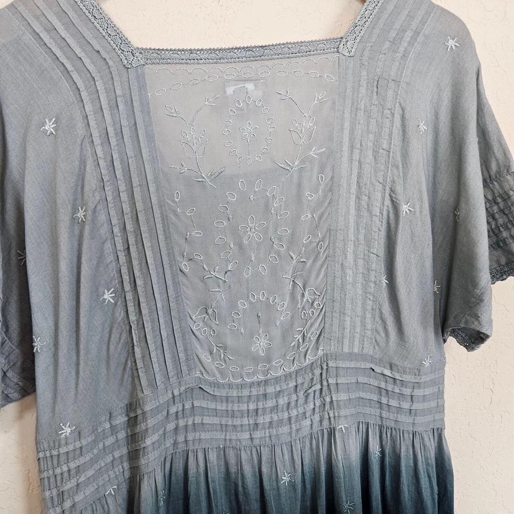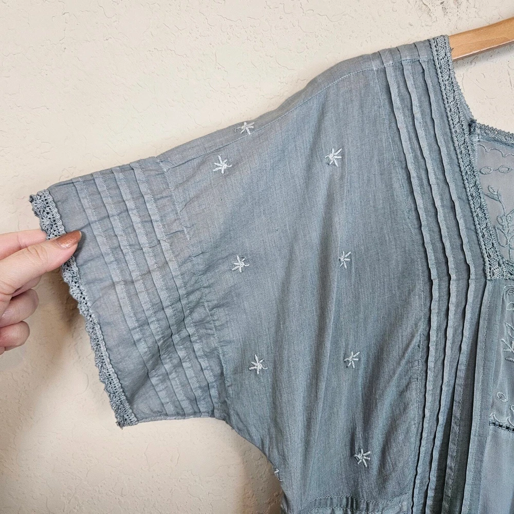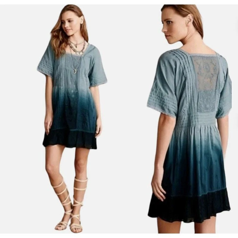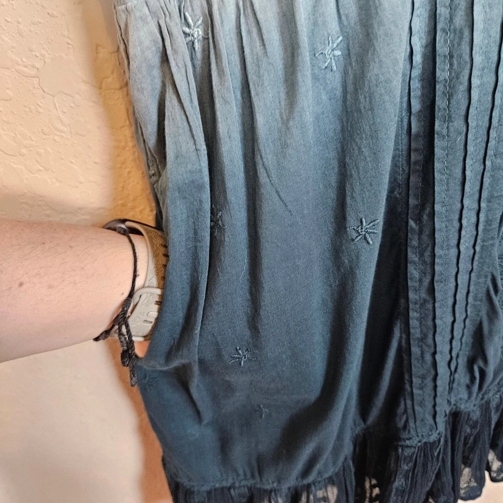 Anthropologie Holding Horses Ocean Dipped Tunic Dress Women's Small Boho Summer •Blue dipped ombré in color. •Woven, gauzy cotton. •Relaxed tunic silhouette. •Embroidered detail. •Pullover styling. •Square neckline. •Pockets. •Lace trim with sheer panels & embroidery. • Pintuck detail •Ruffle Hem • Ombre coloring with Teal Blue green into a sea foam blue Pastel that is muted. Size S Small Approximate Measurements: pit to pit - 18" across waist - 17.5" hips - 20" length - 35" Excellent pre-owned condition, no rips, tears or stains. Does not come with a slip. Smoke free, dog friendly home. casual everyday classy spring summer flowy chic western Yellowstone boho bohemian farmhouse cottage faerie