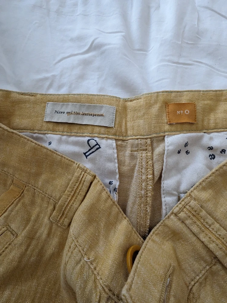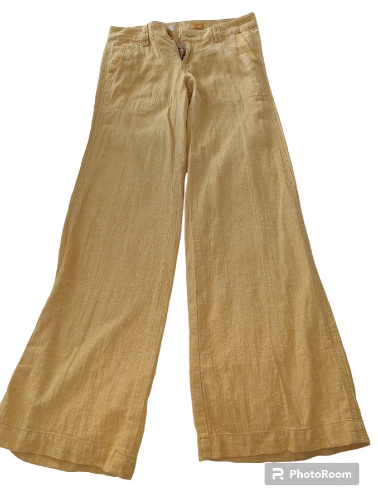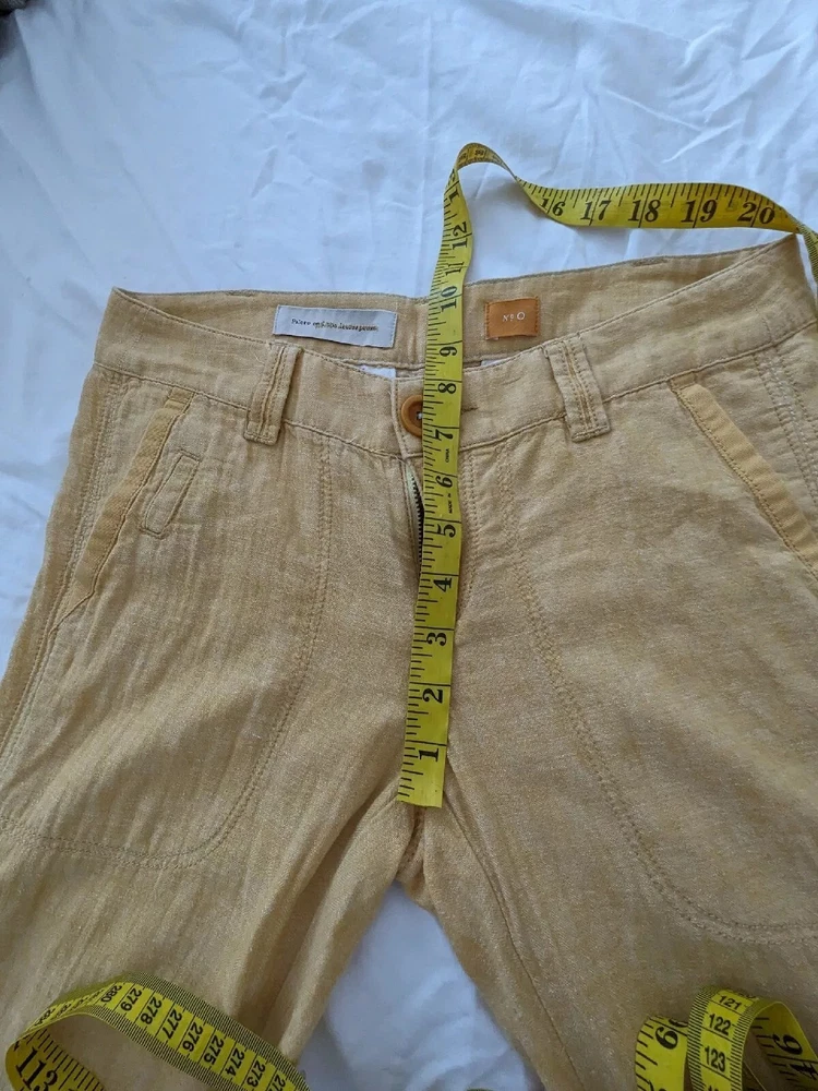 These Anthropologie Pilcro pants are a must-have for any wardrobe. The pants are made of a comfortable blend of linen and cotton, and the ocher yellow color adds a pop of brightness to any outfit. The pants feature a flat front and a slight flare at the leg, with a zip closure for easy wear. Perfect for any occasion, these pants can be dressed up for work or dressed down for a casual day out. The pants are machine washable, making them easy to care for. The woven fabric type gives the pants a durable and stylish look. These pants are a great addition to any wardrobe, and they are sure to become a favorite. Measurements in photos