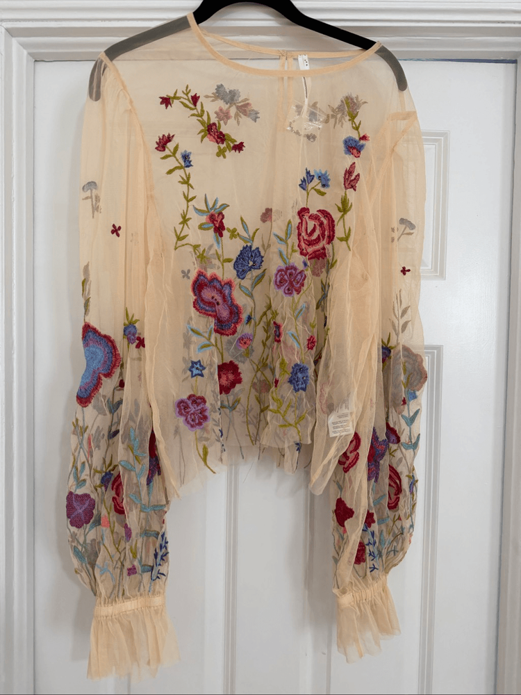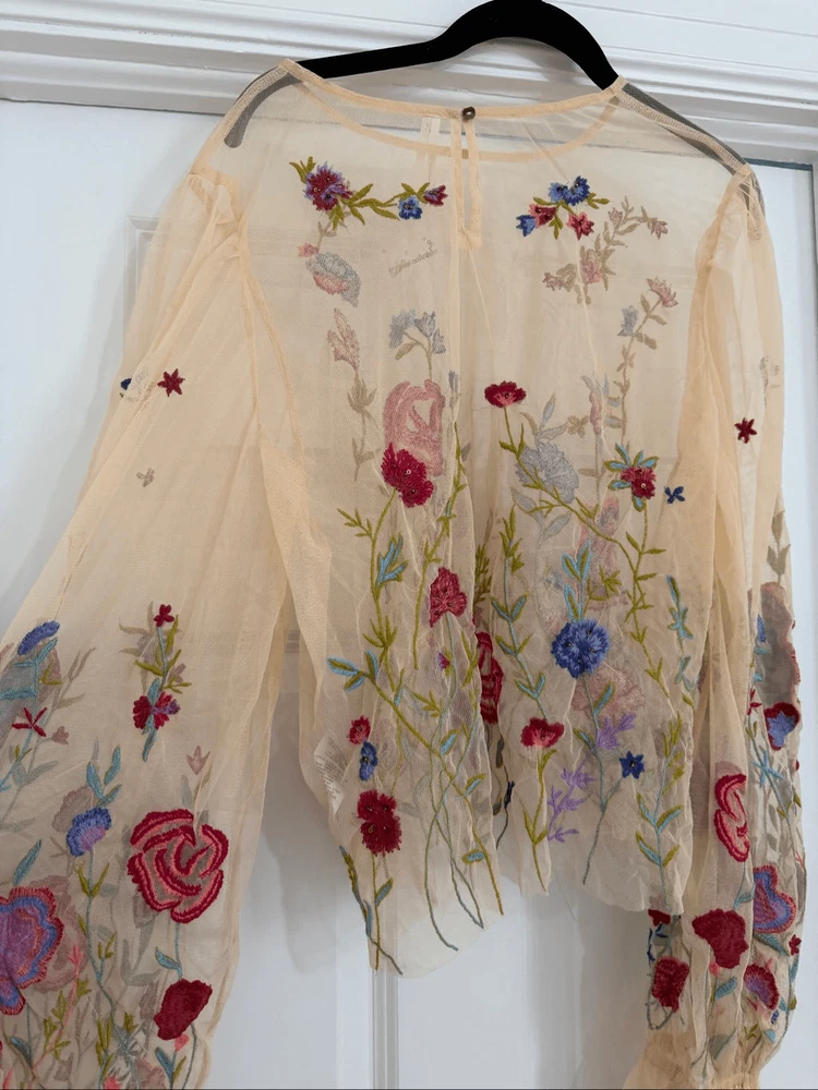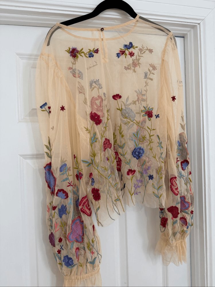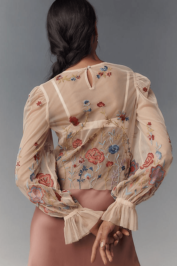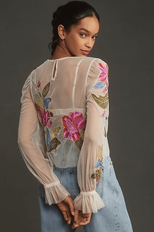 The Layla Blouse from By Anthropologie features allover appliqués outlined with beading, subtly puffed shoulders and ruffle cuffs. The blouse has long sleeves and is made of polyester, metal, and tulle. Material Polyester; Polyester, Metallic Embroidery Care Instructions Hand Wash Origin Imported Closure Pullover