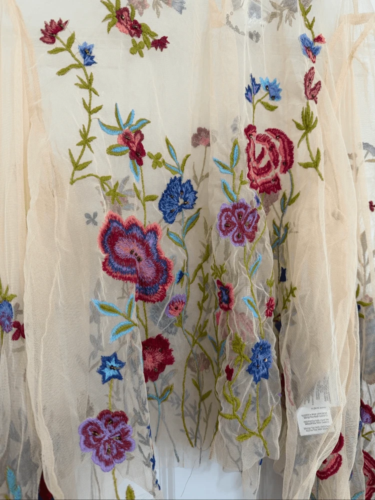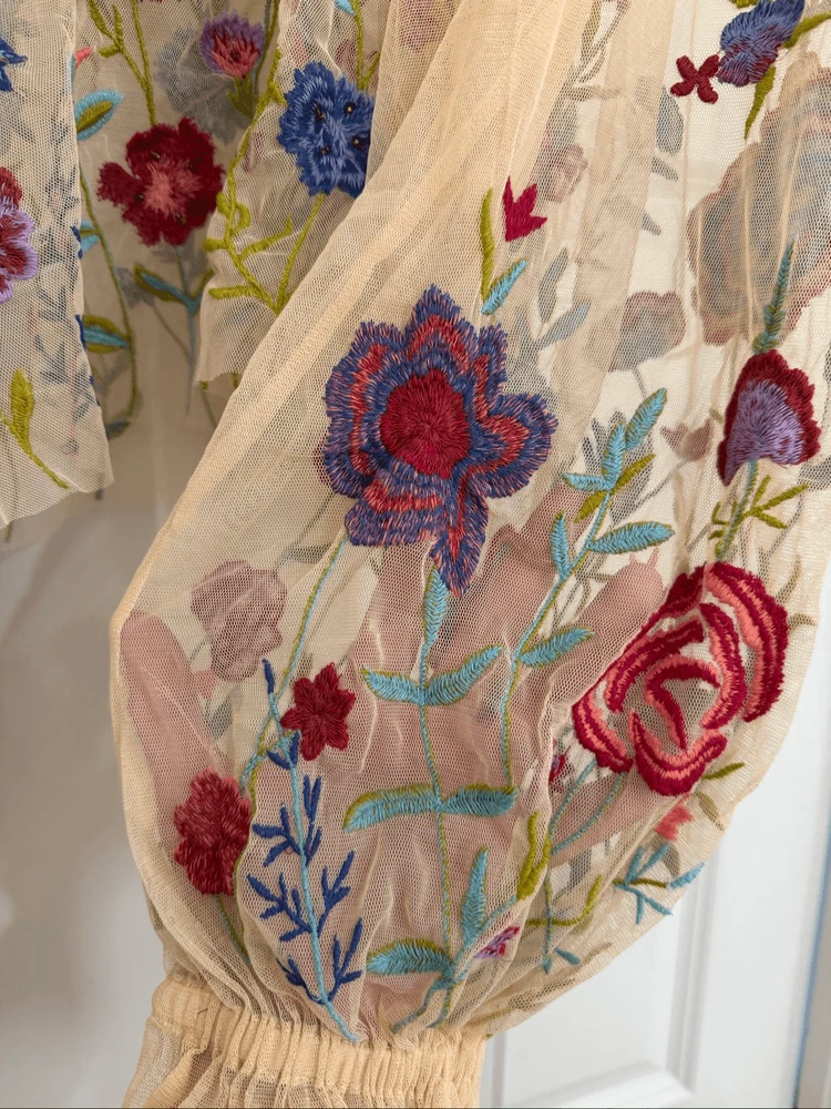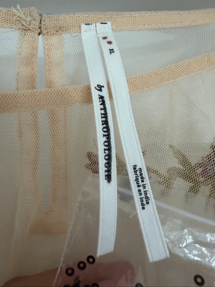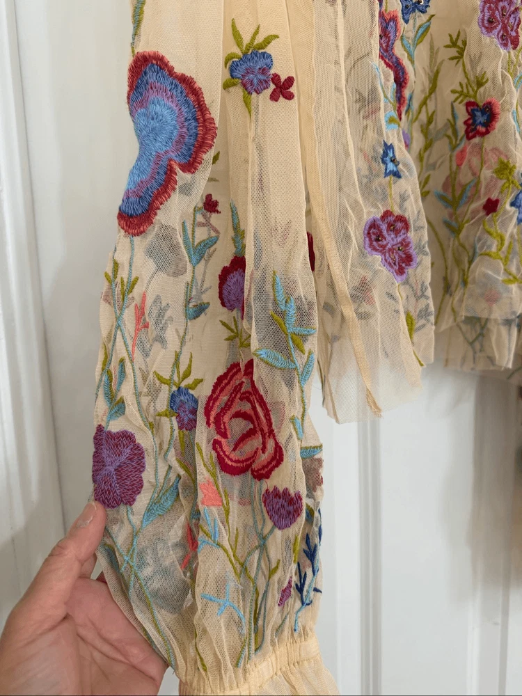 The Layla Blouse from By Anthropologie features allover appliqués outlined with beading, subtly puffed shoulders and ruffle cuffs. The blouse has long sleeves and is made of polyester, metal, and tulle. Material Polyester; Polyester, Metallic Embroidery Care Instructions Hand Wash Origin Imported Closure Pullover