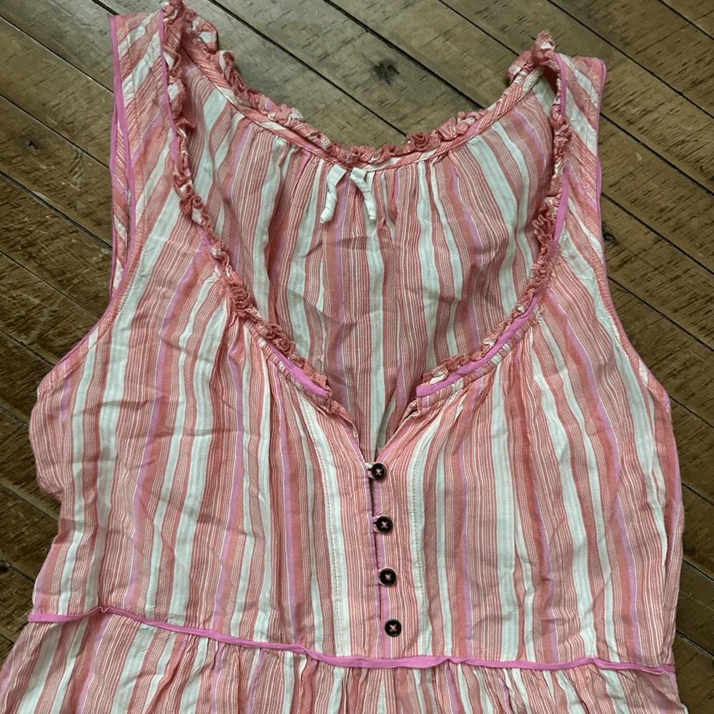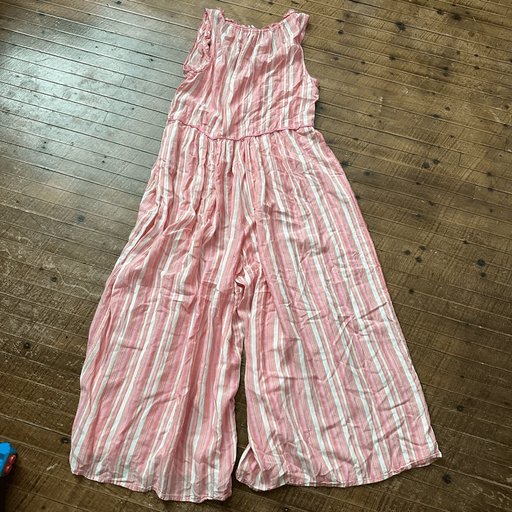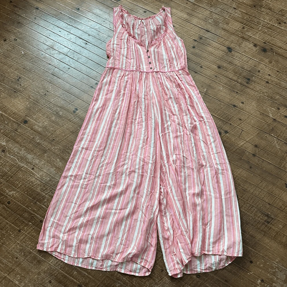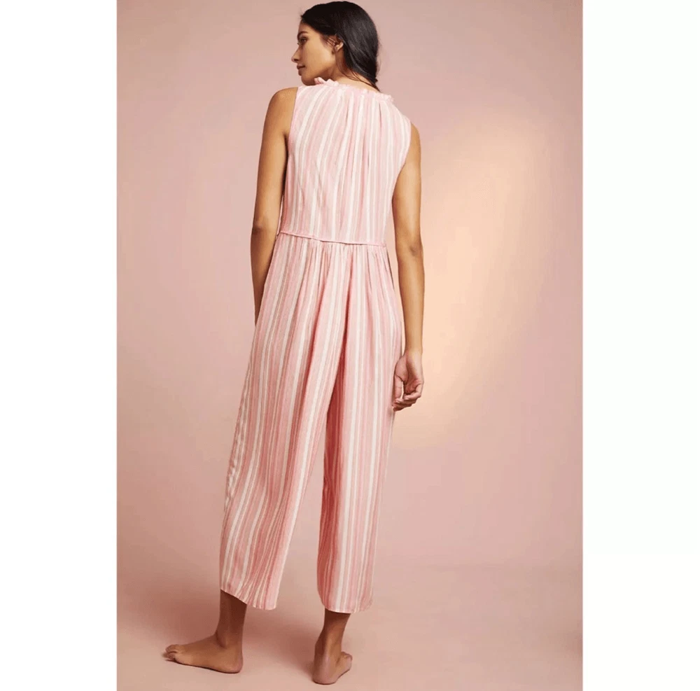 Anthropologie wide leg, pink striped, lightweight, small ruffled, tie neck, button front, sleeveless jumpsuit. In good condition. Approximately 18 inches from armpit to armpit, 17 inches across the waist, 15.5 inch inseam, 21 inch inseam. In good, gently used condition. From a pet and smoke free house.