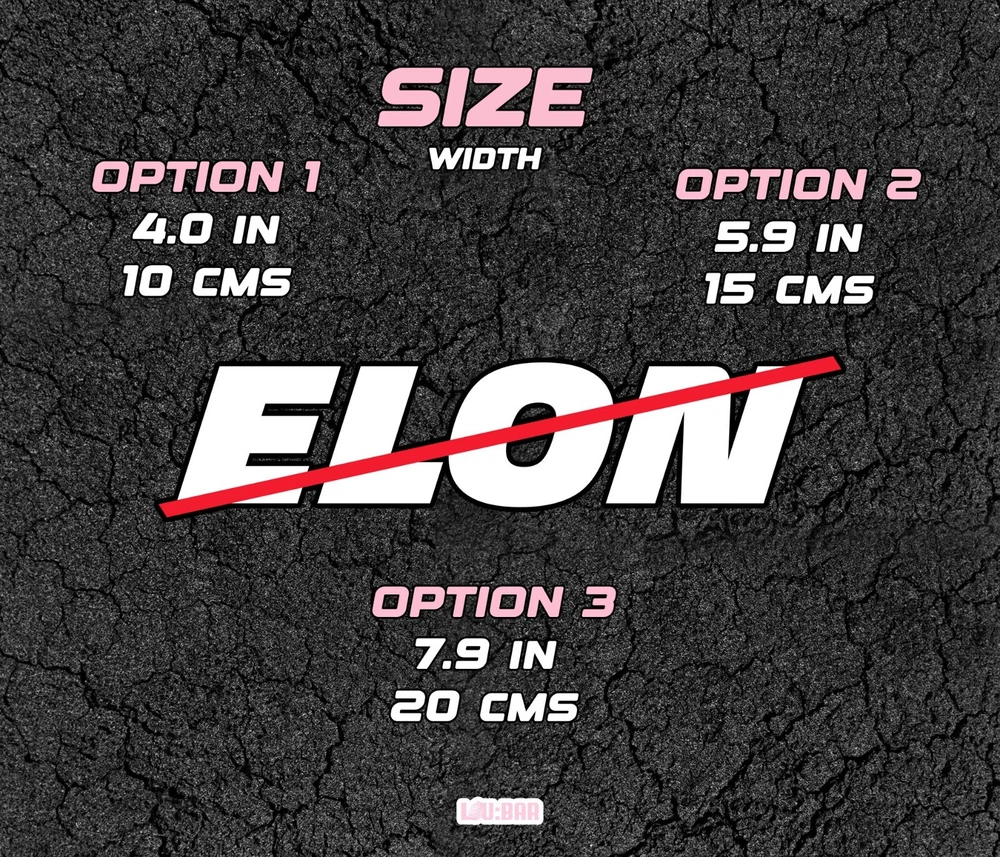 ANTI ELON MUSK DECAL You bought your Tesla before Elon Musk went crazy? LuBar Club has the perfect decal for your car's bumper, window or any other smooth surfaces. You will receive: - 1x ELON Decal - 1x Red Ligne Decal Available in various sizes and colors. All our decals are high quality and will last long in time as they are weather resistant. They are delivered with transfer paper and instructions. 100% handmade in Switzerland: from the design, the printing, the cutting to the shipping. ----------------------------------------------------- SIZE ----------------------------------------------------- Option 1 3.92 inches or 10.0 cms Option 2 5.9 inches or 15.0 cms Option 3 7.9 inches or 20.0 cms ----------------------------------------------------- M A T E R I A L S ----------------------------------------------------- PVC Weather Resistant: Yes ----------------------------------------------------- SHIPPING INFORMATION ----------------------------------------------------- Shipping within 48-72 hours. ----------------------------------------------------- N O T E S ----------------------------------------------------- The colors may vary depending on your screen settings. If you have any hesitations or questions, don?t hesitate to message us.