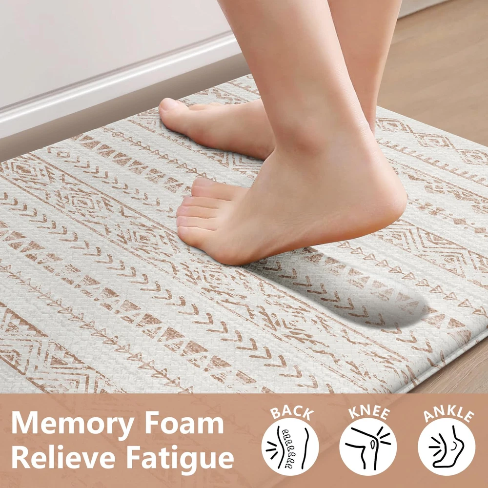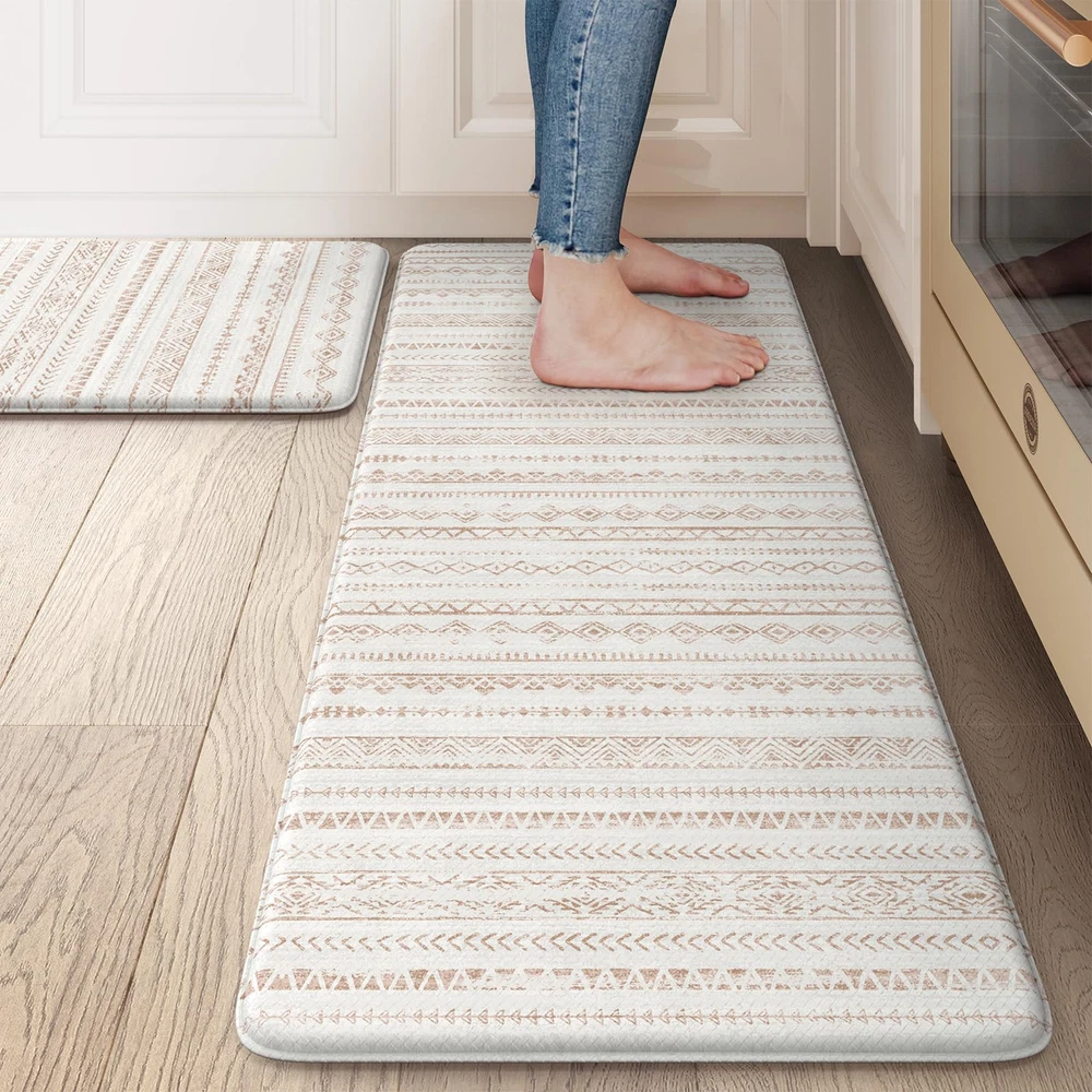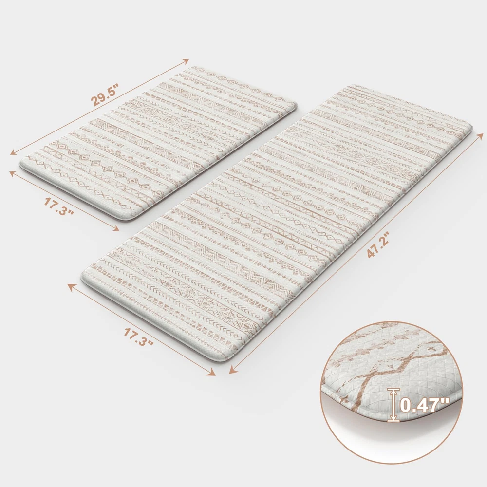 Anti Fatigue & Comfort: The 0.47 inch (12 mm) thick kitchen anti fatigue mat is ergonomically engineered, helps reduce stress on your feet, joints and waist.Standing on it feels like walking on a soft cloud, providing a comfortable touch for your feet Non-Slip & Safety: Our heavy duty rubber backing ensures maximum grip to keep it in place, no need to worry about slipping or tripping on the cushion kitchen mats for floor, which is important for the safety of pregnant women, elderly, children at home Easy to Clean & Waterproof: Whether it's water, wine or drinks dripping on the anti fatigue mats, simply wipe off it with a cloth, saving time and effort. You can also clean with a handheld vacuum to remove debris from the surface of soft kitchen rugs Classic & Versatile: The memory foam kitchen mat is crafted in a minimalist beautiful tribal pattern design, bringing warmth to your home and serving as a perfect accent to any kitchen decor.It's suitable for kitchen, office, laundry, sink and so on Perfect Size & Sturdy Material: The set includes 2 mats(17.3"x 47"+17.3"x 29.5"), you can put them in front of the sink and the cooking. Our padded kitchen floor mats are made of premium PVC material, sturdy edge to ensure that it will be long term used