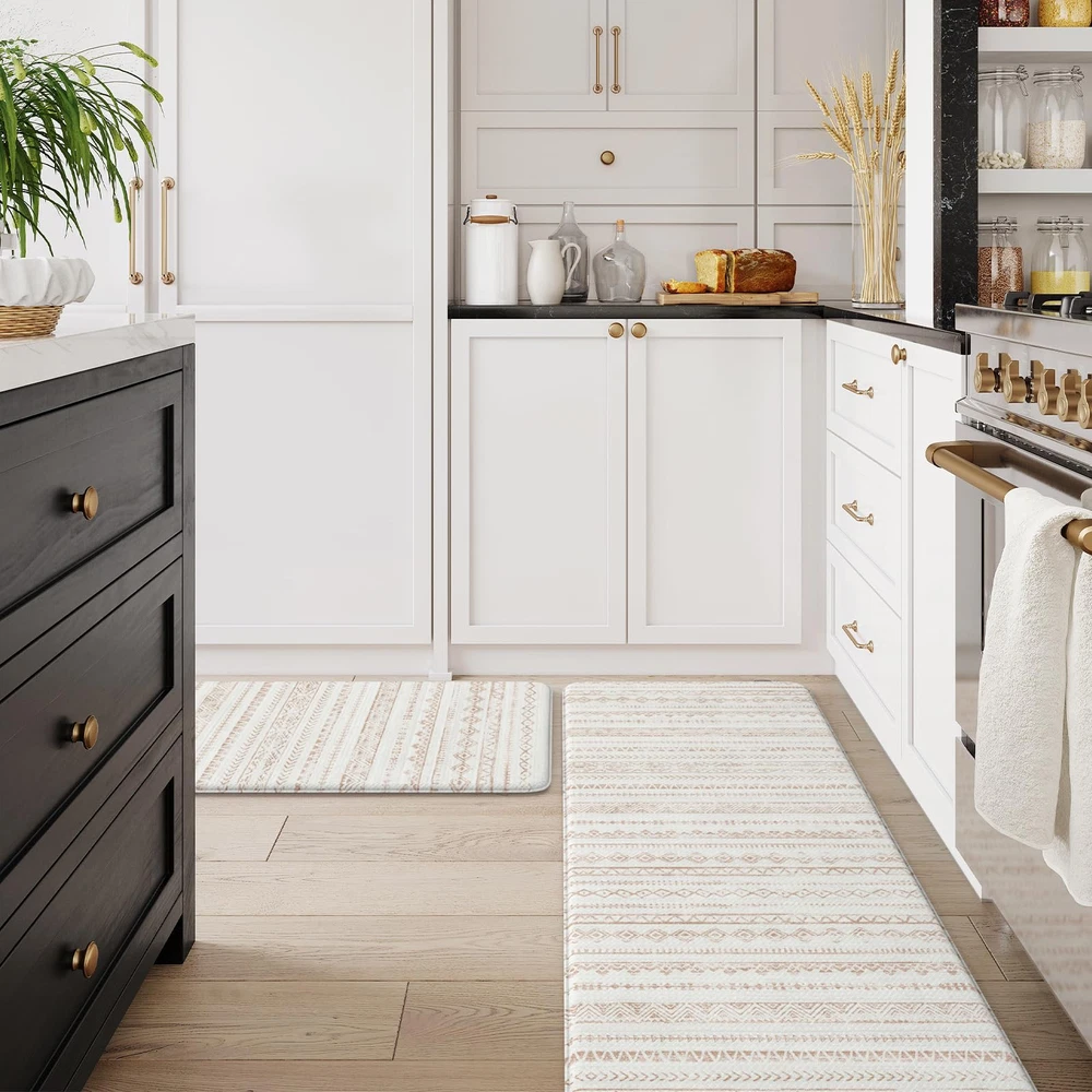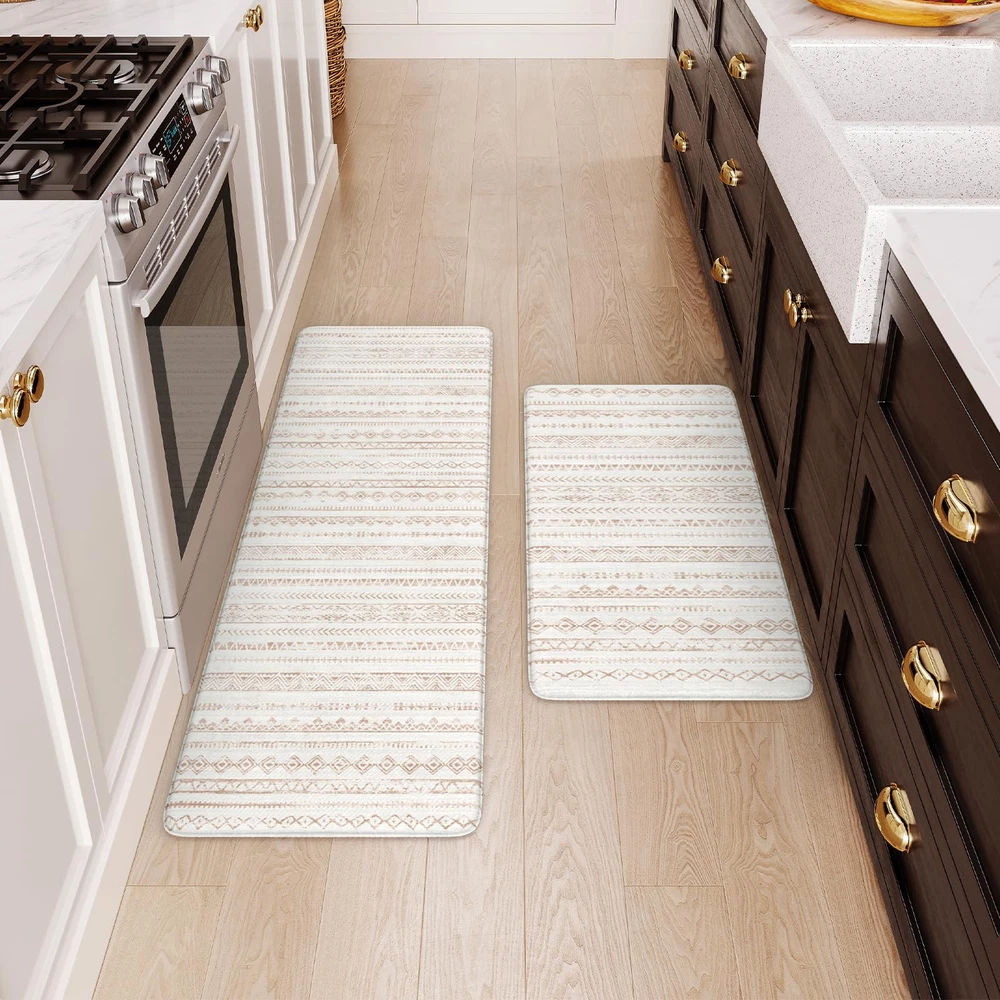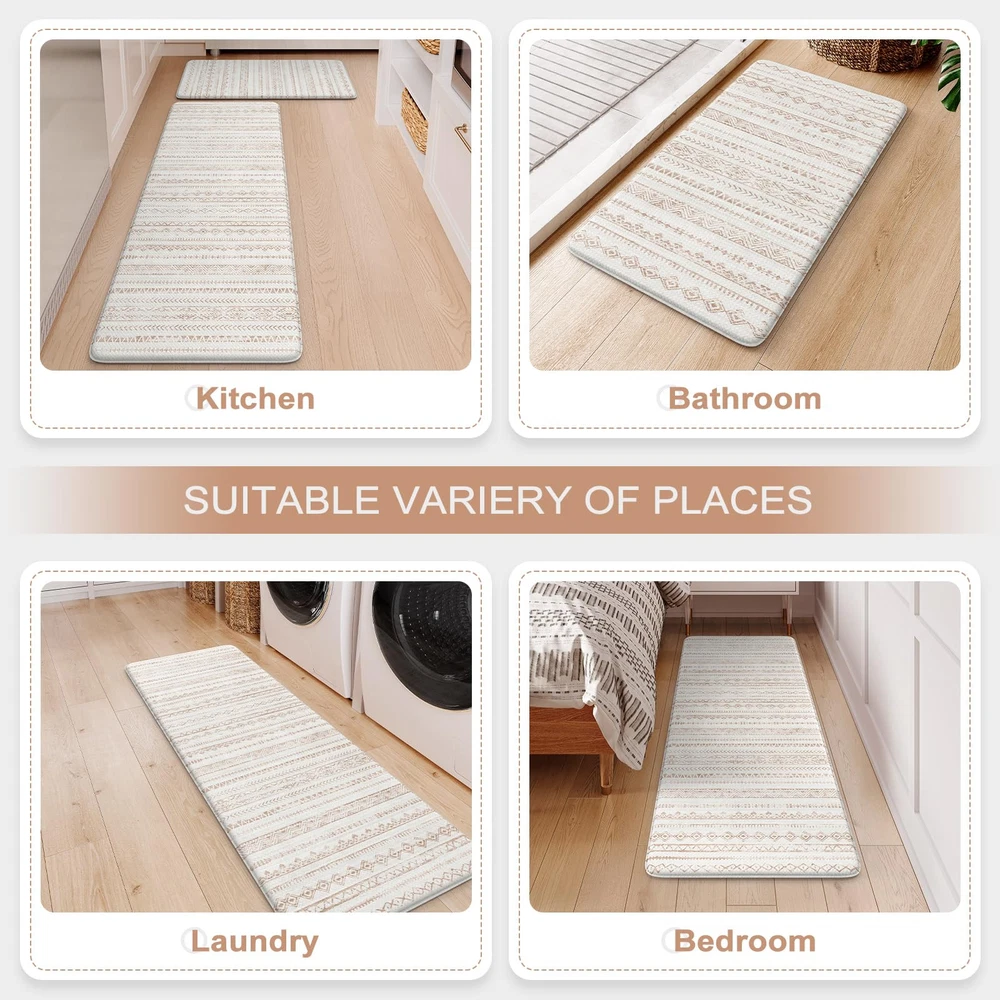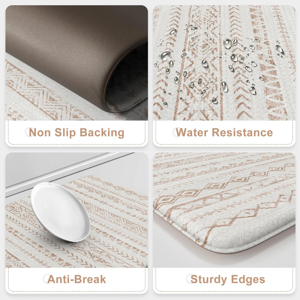 Anti Fatigue & Comfort: The 0.47 inch (12 mm) thick kitchen anti fatigue mat is ergonomically engineered, helps reduce stress on your feet, joints and waist.Standing on it feels like walking on a soft cloud, providing a comfortable touch for your feet Non-Slip & Safety: Our heavy duty rubber backing ensures maximum grip to keep it in place, no need to worry about slipping or tripping on the cushion kitchen mats for floor, which is important for the safety of pregnant women, elderly, children at home Easy to Clean & Waterproof: Whether it's water, wine or drinks dripping on the anti fatigue mats, simply wipe off it with a cloth, saving time and effort. You can also clean with a handheld vacuum to remove debris from the surface of soft kitchen rugs Classic & Versatile: The memory foam kitchen mat is crafted in a minimalist beautiful tribal pattern design, bringing warmth to your home and serving as a perfect accent to any kitchen decor.It's suitable for kitchen, office, laundry, sink and so on Perfect Size & Sturdy Material: The set includes 2 mats(17.3"x 47"+17.3"x 29.5"), you can put them in front of the sink and the cooking. Our padded kitchen floor mats are made of premium PVC material, sturdy edge to ensure that it will be long term used