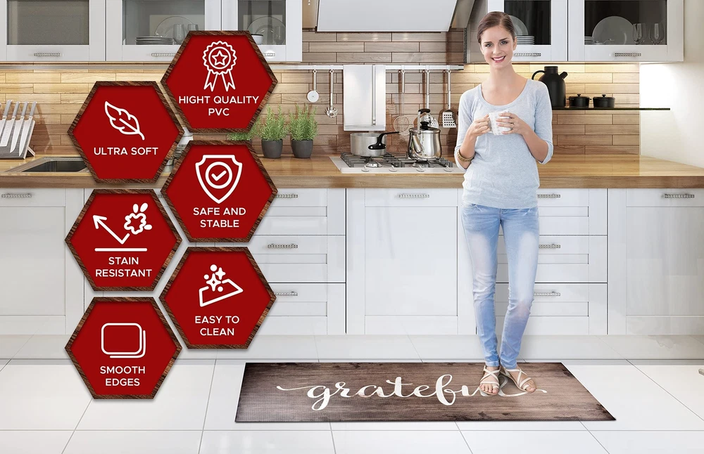 All day support - For anyone who spends a lot of time on their feet at work or at home, this anti-fatigue kitchen floor mat is a life changer! Like walking on clouds - This anti-fatigue mat is ridiculously comfortable! The standing desk mat - which is most likely made of marshmallows, sunshine and cotton candy clouds - will make you feel lighter on your feet and more energized to work Improves balance & posture - Because of the ergonomic design, the antifatigue kitchen sink mats relieve spinal pressure, reducing lower back pain while promoting subtle muscle movement that increase blood flow to keep you standing alert and strong Commercial - With a non-slip bottom, these kitchen mats are the same kind used by businesses (eg, restaurants) to absorb shock in high foot-traffic areas. Also, the layout has an anti-curl edge that prevents it from becoming a tripping hazard