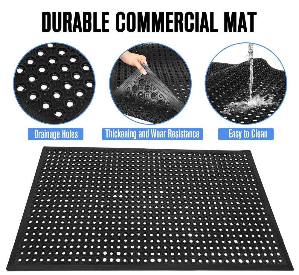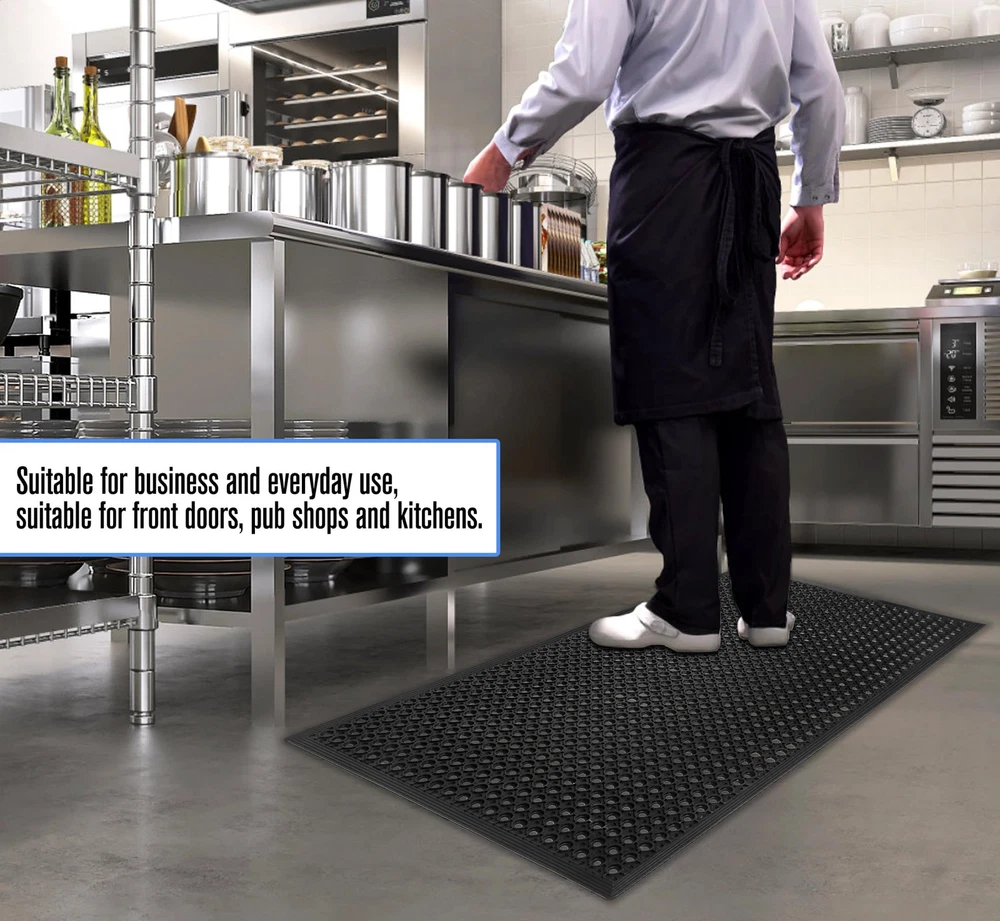 【Non-slip Drainage Mat】Anti-slip drainage mat design – engineered with large hexagonal holes, this rubber drainage mat effectively captures and drains liquids, preventing dangerous puddles from forming. This makes it ideal for use as a commercial kitchen mat where grease and water can cause hazardous slipping. Its anti-slip surface keeps the mat securely in place, ensuring safety in bustling environments. 【Drains and Dries out Outside Mat】 Designed for tough conditions, this mat excels as a bar mat for floor or as an outdoor drainage mat for patios, decks, or entrances. Its large drainage holes promote rapid drying, preventing standing water from causing damage or slippery surfaces. 【Multi-Functional 】The rubber floor mat perfect for both indoor and outdoor settings such as shops, restaurants, patios, boats, bars, and homes. This 36"x60" heavy-duty mat offers comfort and protection, while being easy to clean and ideal for high-traffic areas. 【Heavy Duty Rubber Floor Mat】Made of high-grade rubber, this drainage mat provides superior durability and long lasting performance. Weighing 14.3 LB, Size: 60 x 36 x 0.4 in. 【Easy to Clean】Wipe or hose clean with soap and water. This mat is sustainable, durable, and resistant to water. Its easy to clean surface ensures that dirt, grease, and liquids can be quickly washed away.