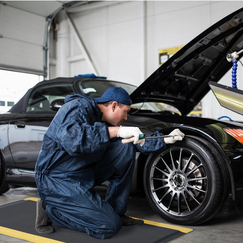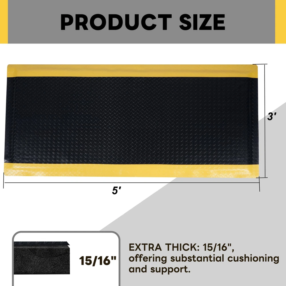 Anti Fatigue Standing Mat: Antistatic anti-fatigue ground upper layer made of anti-static rubber material, the middle layer is composed of EPDM foam cotton, the bottom layer is conductive rubber, 15/16 inch thick, dimensions is 3 x 5 FT. Non-slip surface: The textured surface and smooth beveled edge design help prevent slipping and tripping. The yellow border strip design provides a warning effect. The rubber surface is bonded to the cushion, ensuring it remains firmly attached for increased longevity. Versatile Comfort Floor Mat: Extra thick sponge mat comfortable feet, effective in reducing stress and pressure on feet, knees and lower back over long standing periods, greatly reducing the fatigue of standing for a long time. Protect products or tools dropped during work from damage, thus reducing production costs. Border Safety Mat: Heavy duty Industrial floor mat Beveled edges design, more close to the ground seamless, which provides a better grip for the mat and is not easy to move. prevent tripping, fit the ground without warping, not open glue, not collapsing. Versatile: Whether you are repairing the car in the garage, working in the factory, standing at the desk, cooking in the kitchen, or washing in the laundry, you can use this kitchen mat.