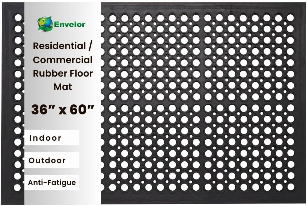 Anti Fatigue Rubber Floor Mat Non-Slip Restaurant Mat for Floors Bar Drainage Mat Doormat Utility Garage Home Slip Pool Entry 36 x 60 Inches Heavy Duty Rubber Floor Mat - Designed to be tough and durable with drainage holes for water, snow, salt, and slush, this well-built rubber mat can be used as a restaurant mat, kitchen mat, safety mat, gym mat and even a bar mat; the best thing about this commercial floor mat is it is made from all-natural and recycled rubber Anti-Fatigue Mat - The drainage holes in these rubber floor mats make them well-suited to keep work areas clean, with grip and traction to offer anti-slip protection; the thick indoor outdoor mat offers cushioning and prevents fatigue for people who stand for extended time periods in stores, workshops, garages, bars and restaurants Non Slip Mat - All purpose rubber mat for commercial and residential use in homes, kitchen floors, offices, garages, bars, bathrooms or any place that experiences a lot of spills; durable rubber helps keep the entrance mat in place, especially when used in high-traffic areas, making it a great outdoor doormat Indoor Outdoor Rubber Mat - The rubber utility mat is great for any type of flooring in the entryway, the garage, laundry room, on the patio, workshop, kitchens, offices and anywhere there is high traffic from outside, clean off shoes and trap dirt and debris in the perforated hole design of this all purpose entrance doormat; simply hose the mat with water to clean Customer Satisfaction SATISFACTION GUARANTEEd - is trusted by many happy customers around the world; your satisfaction is our top priority; if you’re not 100% satisfied, we offer a or SATISFACTION GUARANTEE, no questions asked
