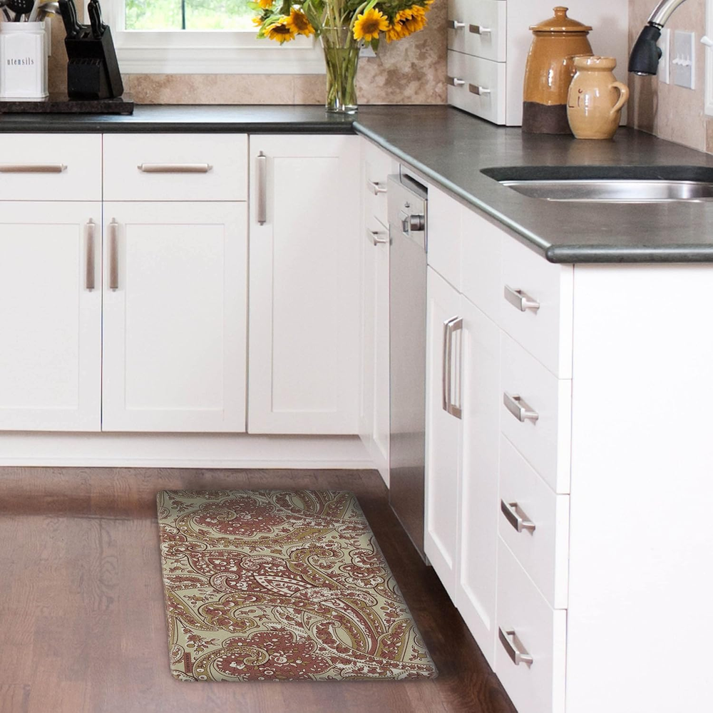 This kitchen mat is a game-changer! The cushioned support makes long cooking sessions so much easier on my feet, and the non-slip backing keeps it securely in place. Love the stylish rust/green color—it wipes clean effortlessly and hasn’t faded even after months of use. Perfect for anyone who spends time in the kitchen!
