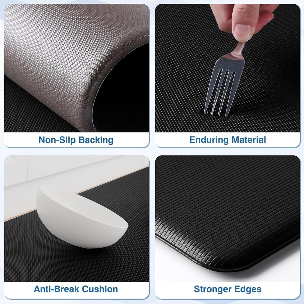 Anti-Fatigue Comfort: StepRite’s 0.4 inch thick kitchen mat offers supportive cushioning that eases strain on your feet and joints, allowing you to stand comfortably for longer periods in the kitchen Stain Resistant: Our kitchen mats have a stain-resistant texture that makes cleaning simple. Whether it’s water, wine, or other spills, you can easily wipe the mat clean with a damp cloth or rag Non-Slip Design: This standing mat features non-slip backing to keep it securely in place on various surfaces like tile, wood, ceramic, and marble. For optimal safety, always place the kitchen mat on dry, flat surfaces Reliable Material: StepRite kitchen rugs are crafted from premium material that maintains its shape and support over time, ensuring long-lasting performance without deterioration Versatility: This anti-fatigue mat is perfect for multiple areas, including the kitchen, laundry room, office desk, doorways, and balconies. It provides a spacious standing area, making it a practical addition for various tasks at home or in the office Product Description