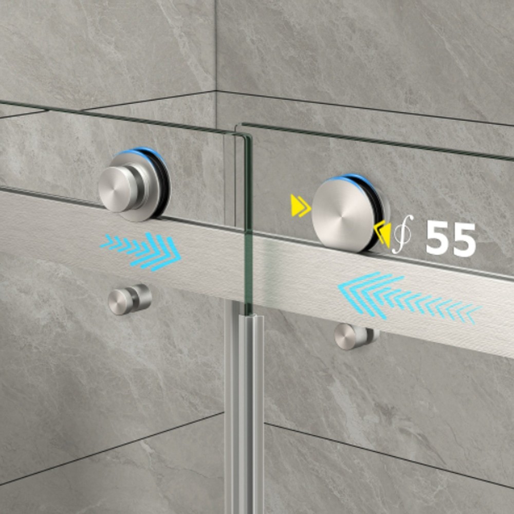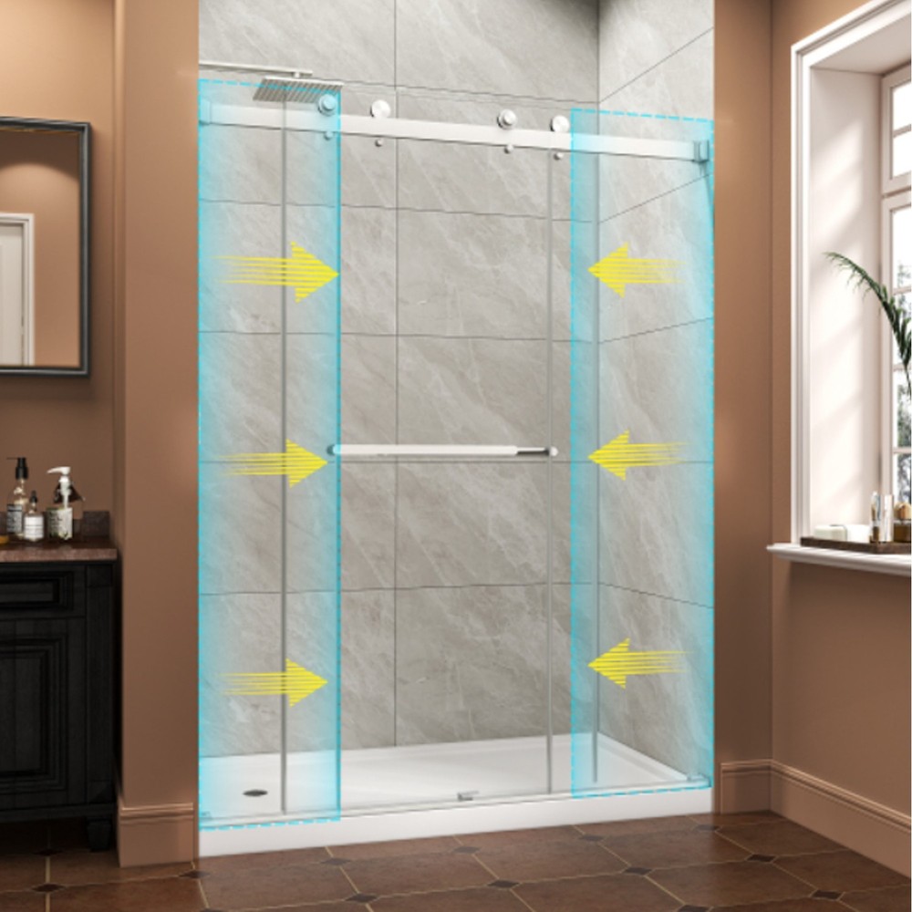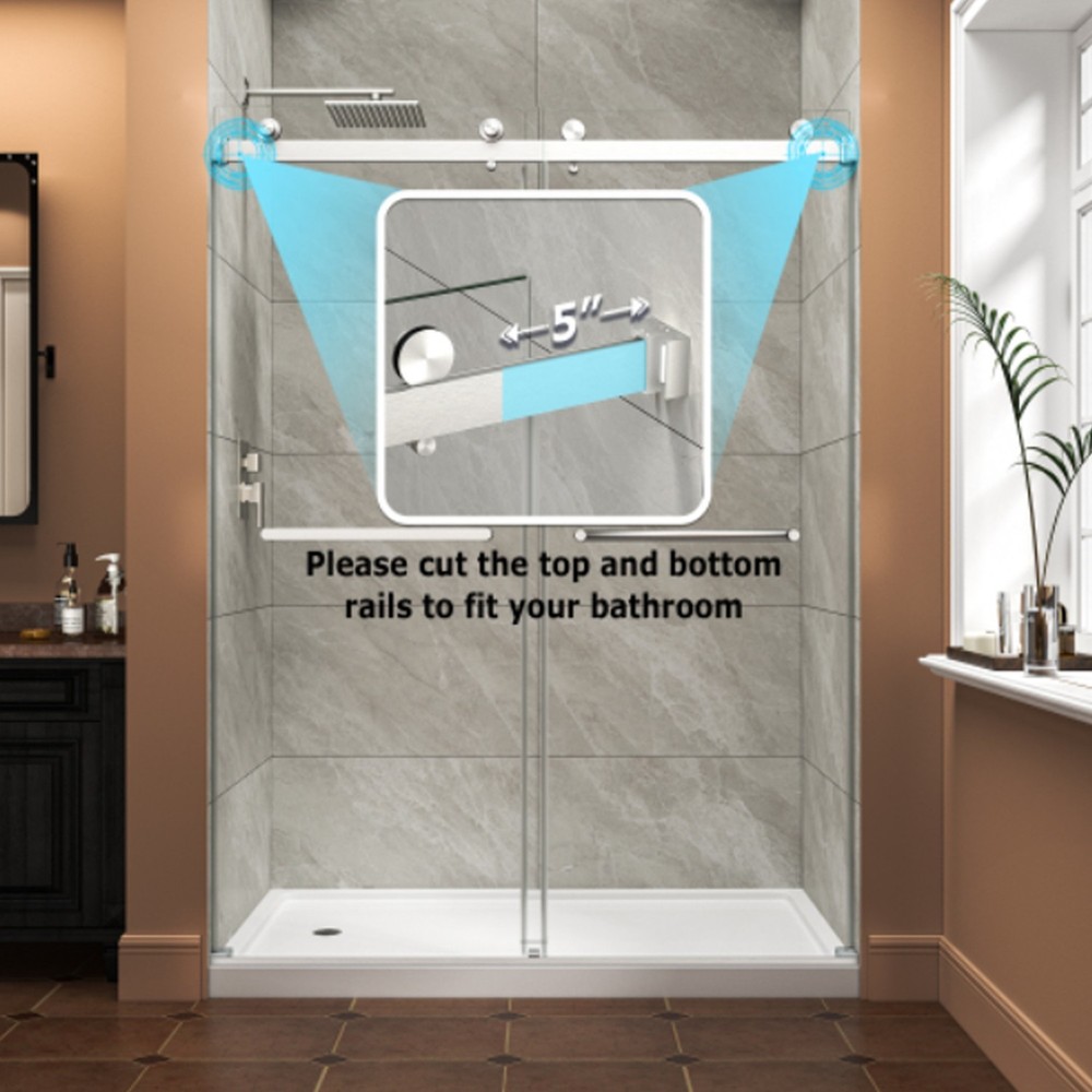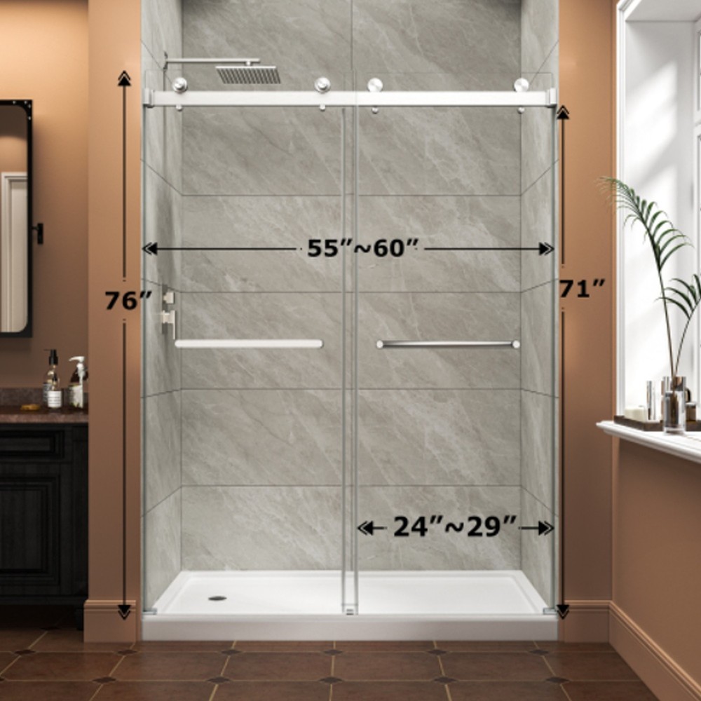 Custom Frameless Fit The deminsion of this frameless shower door is 55"-60" x 76" frameless design suits various shower door sizes; The rails of this walk in shower door can be cut for personalized installation, offering great adaptability to different bathroom spaces. Durable Rustproof Hardware This bathroom door glass is built with high-quality top rail and smooth rollers; All hardware of this frameless shower door is rust-resistant, making it highly suitable for long-term use in wet bathroom environments. Anti-Water & Stable Structure L-shaped bottom rail with integrated waterproof strip effectively blocks water splashing to keep floors dry; side sliders on both sides reduce glass door shaking for enhanced stability. Safe Tempered Glass This walk in shower door is features 5/16" (8MM) SGCC-certified tempered glass (ANSI Z97.1-2015 tested) with chamfered safe corners; This bathroom door glass is coated with NANO explosion-proof film to reduce damage risks from accidental impact. Convenient Design & Safe Delivery Dual-integrated handles for hanging towels and clothes; This frameless shower door can adjustable 5" width range, reversible left/right opening, easy single-person installation with manual and video; splash-proof, drop-tested packaging ensures damage-free shipping. ANTI-WATER STRUCTURE SHOWER DOOR STAINLESS STEEL HANDLES 8 MM SAFETY TEMPERED GLASS HIGH-QUALITY SHOWER DOOR As a professional bathroom product manufacturer, we always provide you with better products and more efficient services, but the following service terms need to be known to you: 1: If you find some problems with the product after receiving the goods, please do not discard the product, because we need you to provide pictures or videos of the relevant faults to better serve you. 2: Please note that we do not bear the installation/assembly costs. If you find a fault during the installation of the product, we will not bear or reimburse this cost because we stipulate that all parts must be checked before booking. 3: Delivery within the United States only, excluding Alaska/Hawaii, Puerto Rico, Guam, Saipan, APO/FPO, US Protectorates and PP Box. Usually the delivery time is 1 to 7 business days. If you still have not received the goods after 7 business days, please contact us immediately and we will track the order for you. 4: If your goods are damaged when delivered, you must refuse the order and describe the damage on the receipt. Just fill in "the goods are damaged". If you accept the goods and the damage is not noted on the receipt, we reserve the right not to refund or replace your goods. If you are not satisfied with your purchase, please contact us within 7 days. Please note that there is a 20% restocking fee and all shipping and handling charges are the responsibility of the buyer.