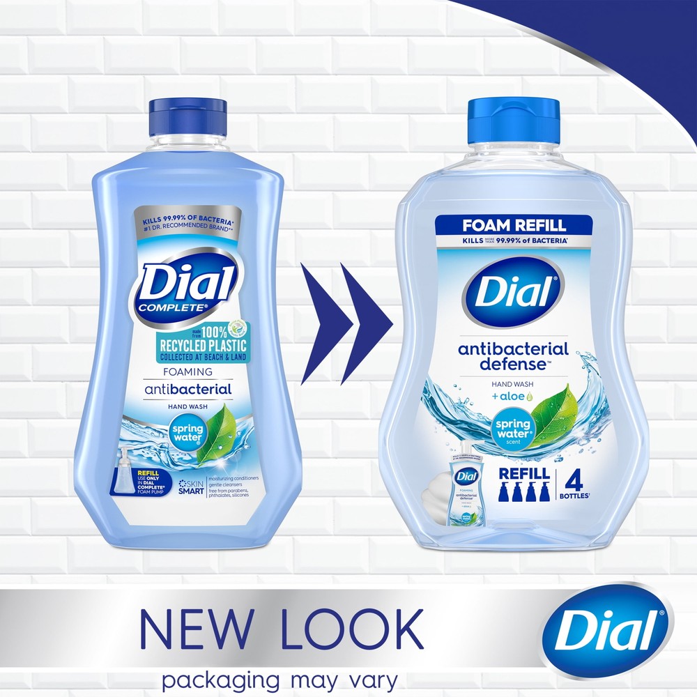 Enjoy the fresh scent of Dial Antibacterial Defense Spring Water foaming hand wash refill. Includes enough product to refill 4 Dial foaming hand wash bottles†. This formula contains aloe vera and kills more than 99.99% of bacteria* while being gentle on skin, leaving it feeling soft, smooth, & healthy. The #1 Doctor recommended antibacterial hand soap brand is dermatologist tested & approved as cruelty free under the Leaping Bunny program. This package contains 30 fluid ounces of Dial hand wash. *Encountered in household settings †Refills 4 Dial Foaming Hand Wash 7.5 fl oz Bottles Kills more than 99.99% of bacteria encountered in household settings. This foaming hand wash refill includes enough product to refill 4 Dial foaming hand wash bottles†. †Refills 4 Dial Foaming Hand Wash #1 Doctor Recommended antibacterial hand soap brand. This gentle pH balanced formula contains aloe vera and is dermatologist tested and cruelty free approved under the Leaping Bunny program. FREE FROM: -Sodium lauryl sulfate/Sodium laureth sulfate -Parabens -Phthalates -Silicones