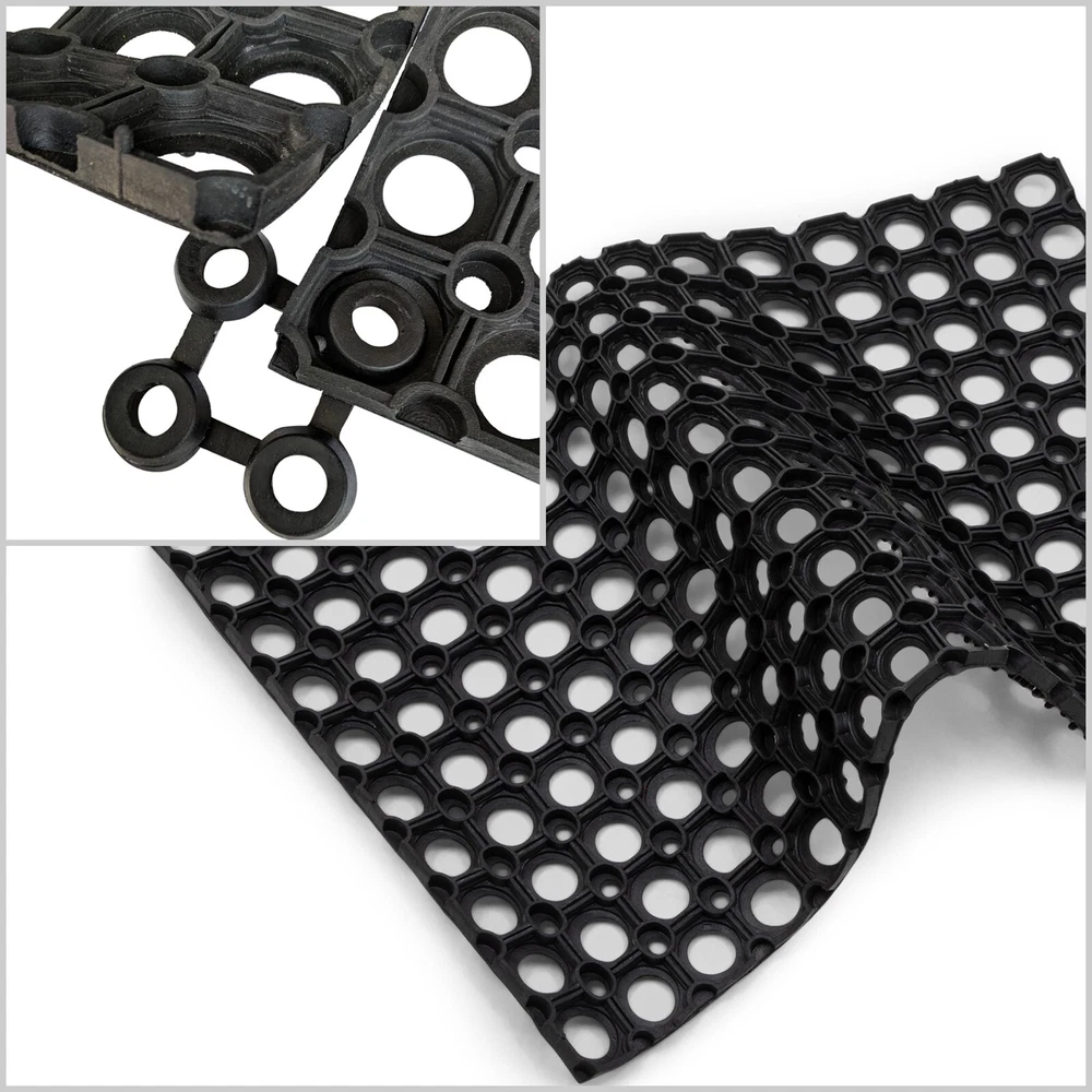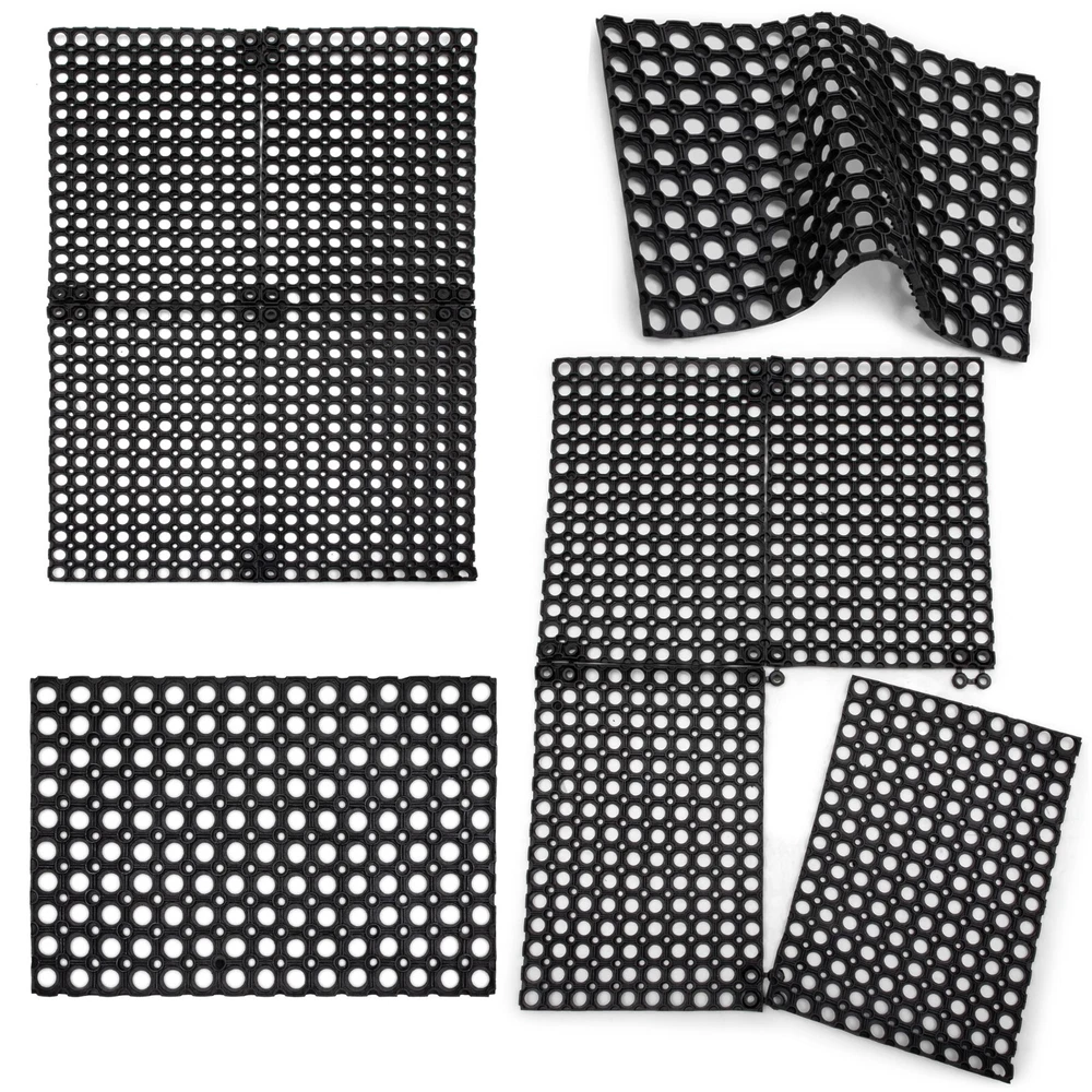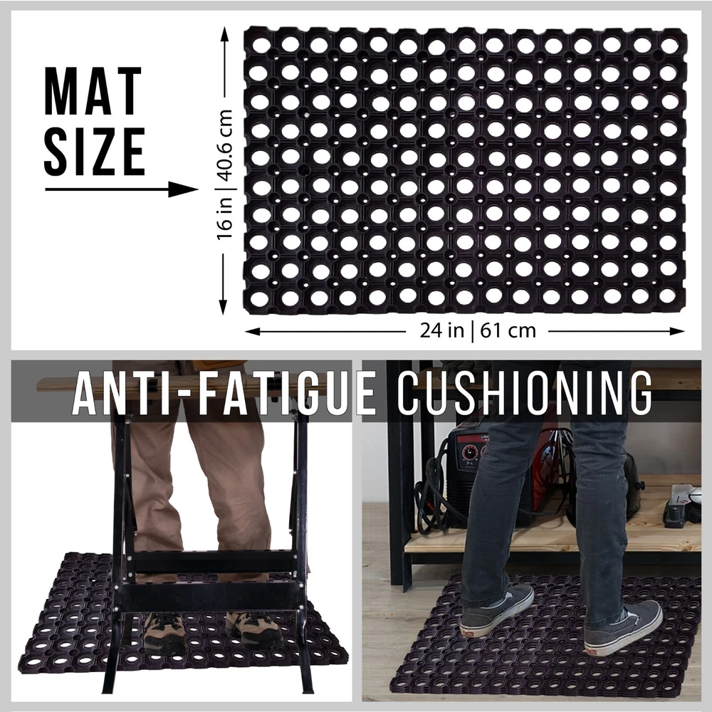 Rubber Mat With Drain Holes: The drainage holes allow liquid and waste to pass through, making this rubber matting easy to clean and stain resistant, providing a clean, dry, and safe work area Anti-Fatigue Mat: Anti-fatigue properties provide all-day comfort when standing for long periods. Perfect for in-plant applications including workstations, assembly lines, and more Home, Industrial, Commercial Use: Ideal for kitchens, food service environments like restaurants and bars, auto body shops, mechanic garages, as well as industrial applications Size/Design: Measuring 24 x 16 inches (61 x 40.6 cm). Low-profile design, 5/8 inch thick (16 mm), for indoor or outdoor use. Small pins on the bottom keep the mat up off the floor so water can drain beneath Includes: 2 interlocking drainage mats and 3 connectors