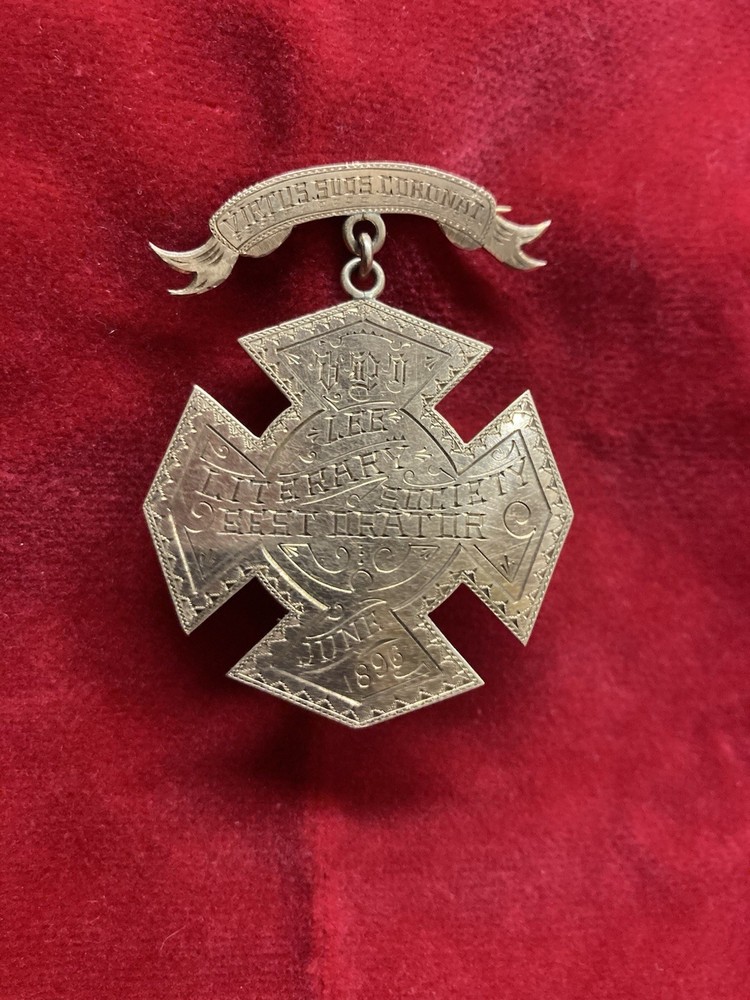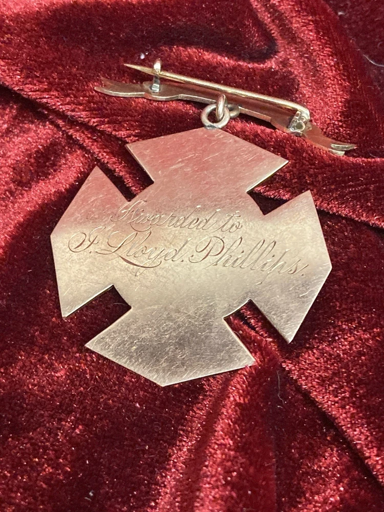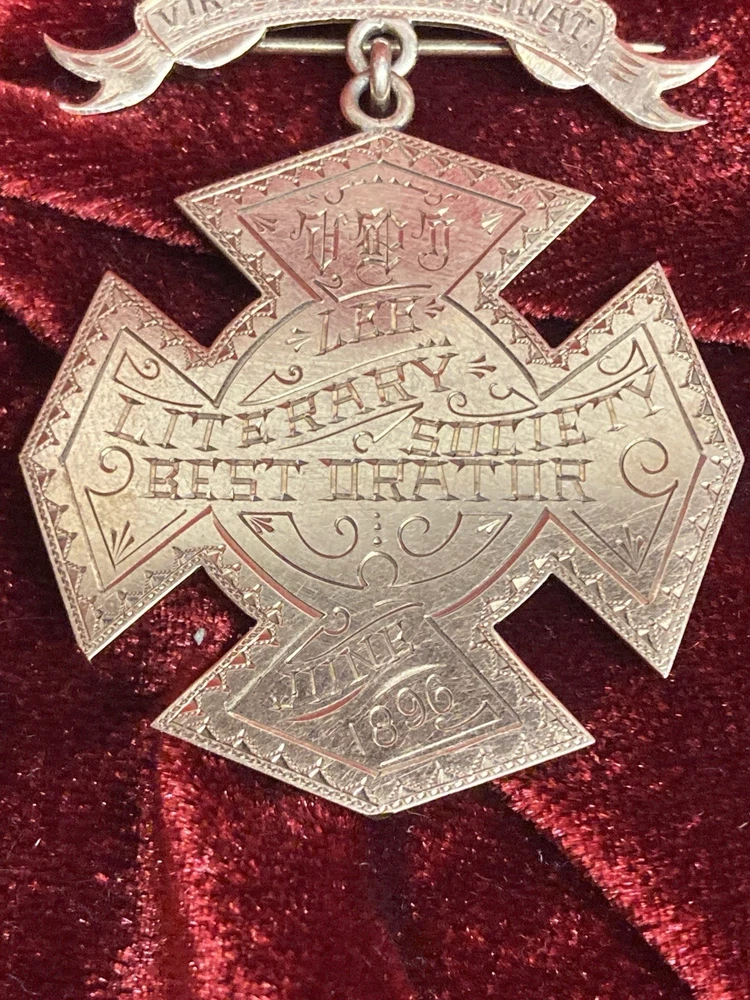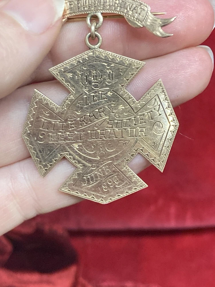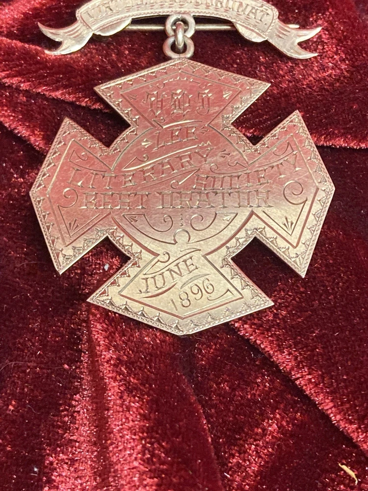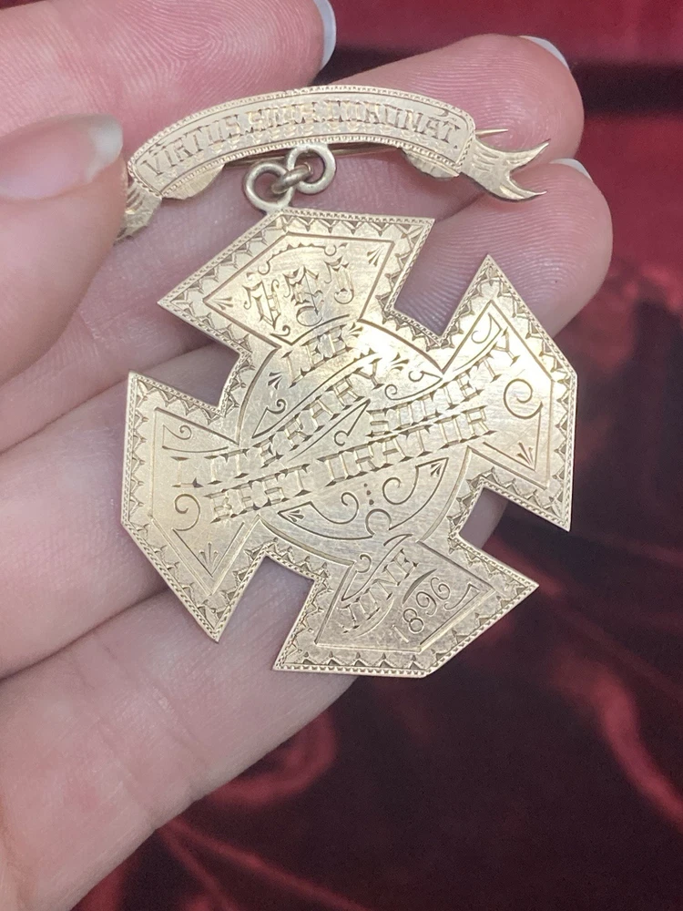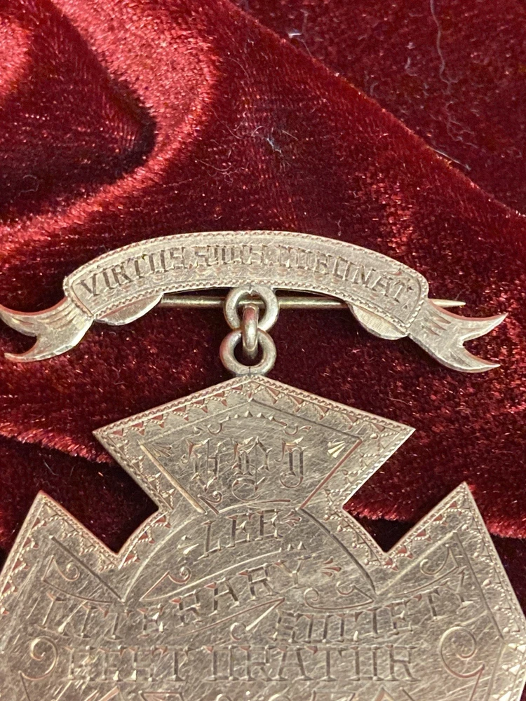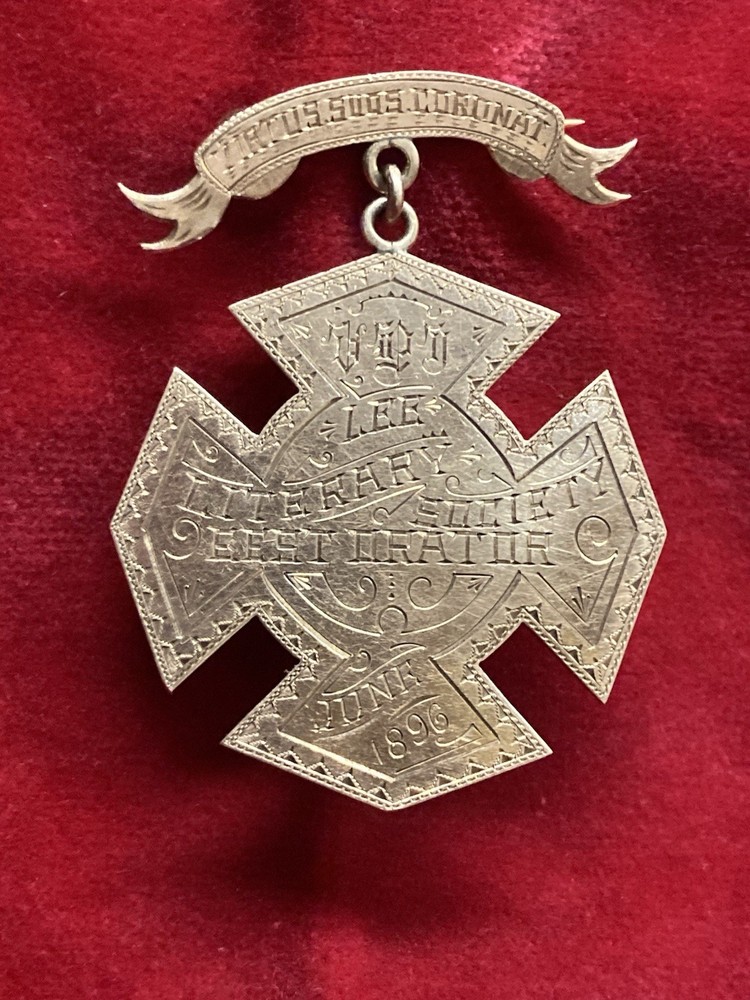 Rare 1896 Lee Literary Society Gold Oratory Medal Named to John Lloyd Phillips – Virginia Agricultural & Mechanical College Offered is a rare late-19th-century Lee Literary Society presentation medal dated June 1896, awarded for “Merit – Best Orator.” The medal bears the Latin motto: VIRTUS SUOS CORONAT (“Virtue crowns her own”) and the reverse is engraved: “Awarded to J. Lloyd Phillips.” The Lee Literary Society was one of the principal student literary and debating societies at the Virginia Agricultural & Mechanical College (later Virginia Polytechnic Institute, now Virginia Tech). These societies held formal competitions in debate and oratory, awarding medals to the best speakers during annual celebrations. ⸻ Hand Engraved Craftsmanship One of the most striking features of this medal is the craftsmanship. The entire design and lettering are masterfully hand engraved, including: • the decorative cross design • all lettering on the face • the Latin motto banner • the inscription on the reverse The engraving shows the confident line variation and depth characteristic of late-19th-century professional engraving, with crisp lettering and finely cut ornamental detail. Unlike later stamped medals, this piece was individually engraved by hand, making each example unique. ⸻ Identified Recipient Research assistance from Virginia Tech Special Collections and University Archives identifies the recipient as: John Lloyd Phillips (Class of 1900) Phillips later became an important figure in Virginia agricultural science: • Instructor in Entomology at Virginia Polytechnic Institute (1899–1901) • Assistant State Entomologist (1901–1903) • State Entomologist and Pathologist (1903–1906) • State Entomologist (1906–1910) Virginia Tech archivists also located a contemporary 1896 Virginia newspaper mention confirming Phillips received the Lee Literary Society oratory award. ⸻ Gold Content Weight: approximately 12 grams The medal has been twice independently scratch-tested using acid and confirmed to be at least 10 karat gold. The alloy shows a warm reddish tone typical of late-19th-century American gold alloys, suggesting the purity may fall between 10K and 12k, though does not hold up to 14 karat testing and no destructive testing has been performed. Again, please note: the alloy shows a warm reddish tone similar to what we know of today as a rosy/coppery colored gold. For some reason it appears as more yellow in the photos than in person. Condition: Very good antique condition. • Crisp engraving • Strong detail throughout • Light age wear consistent with use • Original period pin assembly intact No repairs observed. Please review photographs for details. ⸻ Historical Significance The Lee Literary Society played a central role in the intellectual life of Virginia Agricultural & Mechanical College during the late 19th century. Literary societies were the primary forums for public speaking, debate, and rhetoric, training many future lawyers, professors, and public officials. This medal represents an award given for excellence in oratory during that era. Its recipient later became Virginia’s State Entomologist, linking the object to the early scientific history of Virginia Tech. *** Virginia Tech Virginia Polytechnic Institute VPI Virginia Agricultural & Mechanical College Lee Literary Society Victorian academic medal Oratory medal Debate medal 19th century university award Gold academic medal Hand engraved medal