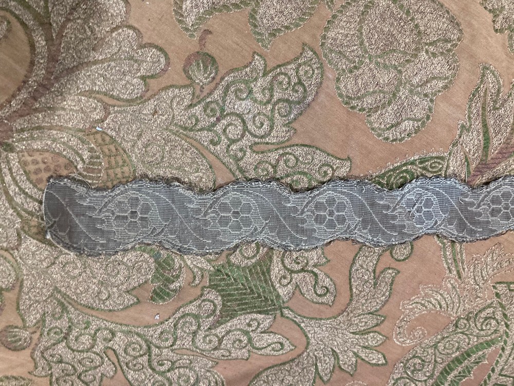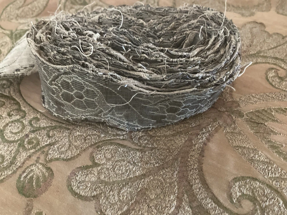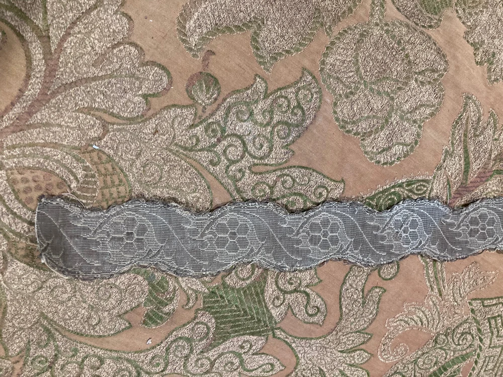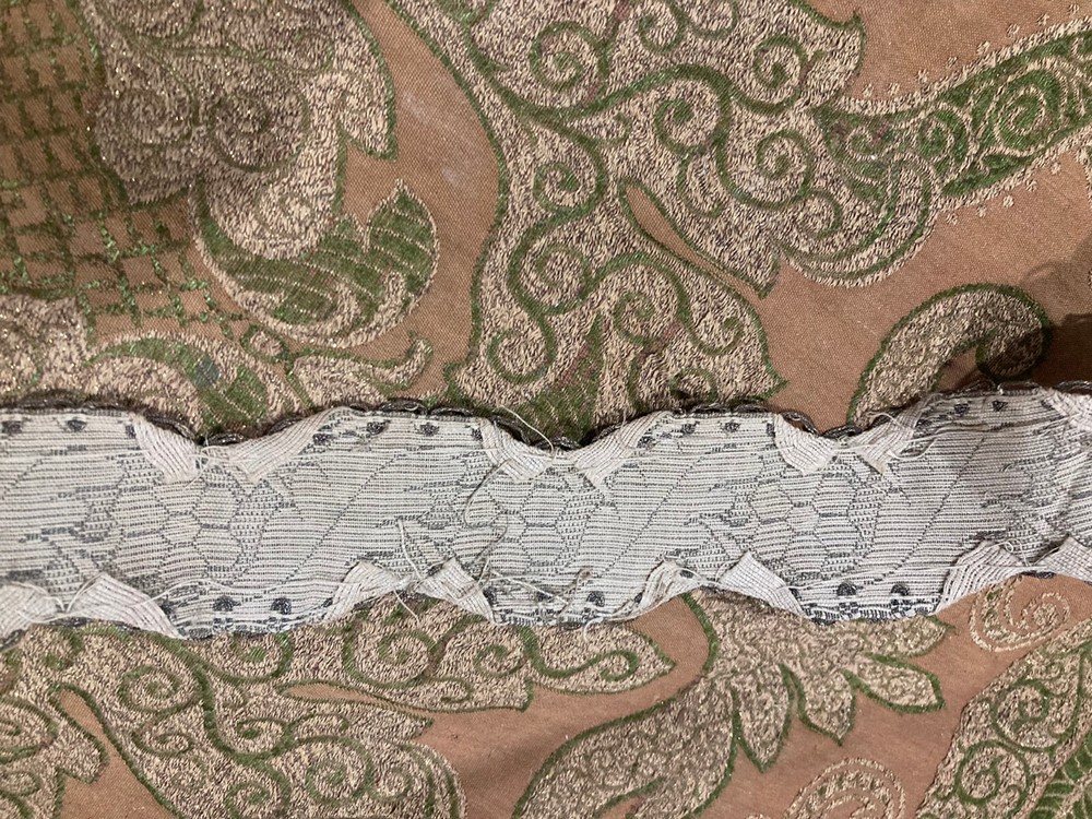 Exquisite and rare antique galloon trim from the 19th century , measuring 183 inches in length and 2 inches wide. This decorative textile features an elegant woven pattern of angular stems, florals, and stylized leaves , enhanced with light metallic silver thread that adds a subtle shimmer. The trim is finished with scalloped edges and fine looped detailing, typical of 19th-century European furnishing trims. Ideal for historical restoration, museum-quality projects, or as a striking accent in fine costume design or textile art. 🪡 Features: Type: Antique Galloon / Furnishing Trim Origin: 19th Century (likely European) Color: Soft sage green with light metallic silver threading Design: Angular florals and leaf motifs with scalloped and looped edges Material: Likely a blend of silk, cotton, and metallic threads Length: Approx. 183″ (15′ 3″ / 4.65 yards) Width: Approx. 2″ 🧵 Condition: Overall in great antique condition , with some loose threads consistent with age. The structure and design remain intact and display beautifully. 💡 Perfect For: Antique textile collectors Historic costume or set designers Restoration of period furnishings Decorative arts and craft projects Museum-quality textile work Please view all photos carefully—they are part of the description. Feel free to message with any questions. Fast and careful shipping !