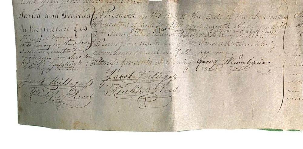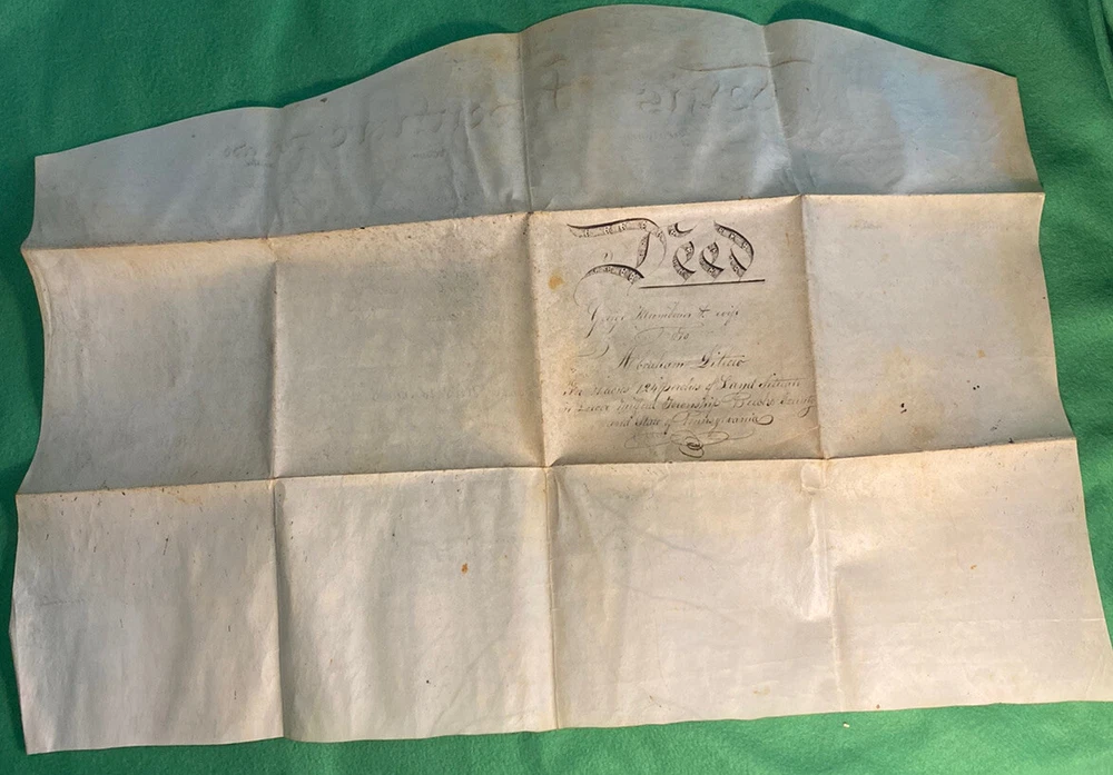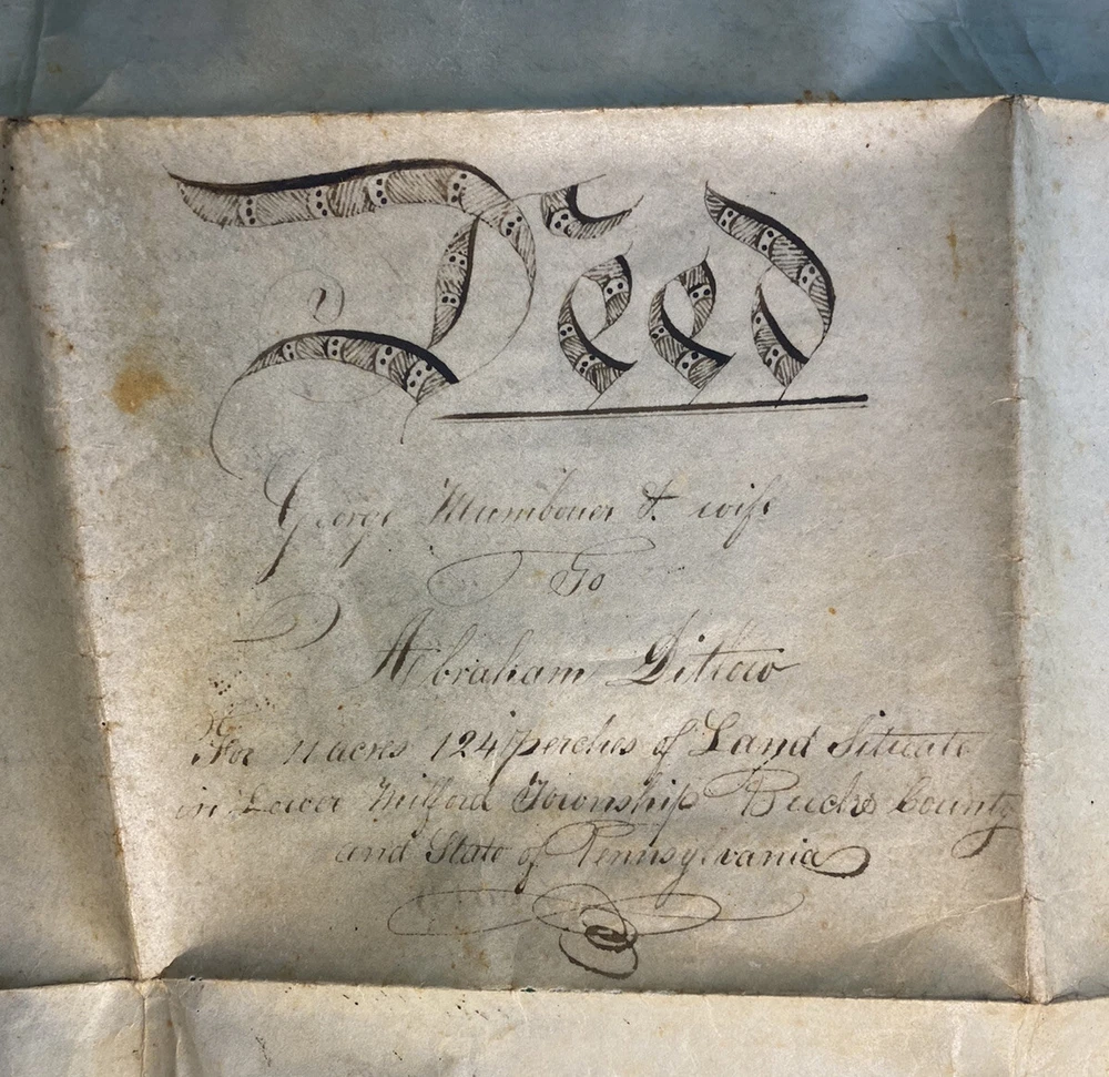 Antique 1838 Milford Township, Bucks County Pennsylvania PA Vellum Indenture ~ 28x19 in George Mumbouer & Wife to Abraham Dittoco 124 perches of land situated in Lower Milford Township Bucks County Pennsylvania Signed & Witnessed by Justice Philip Reed