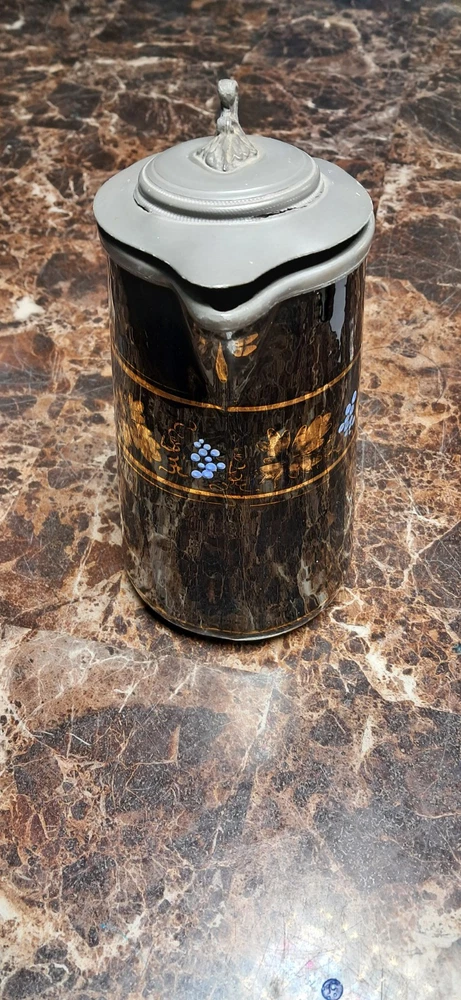 Antique Scottish Fife Pottery by Robert Methven Heron co-creator of Wemyss Ware This piece is clearly marked R. H & S on the base for Robert Heron and Sons and F. P. for Fife Pottery. Some pieces of Staffordshire Jackfield pottery are very similar to Fife Pottery and may actually be Fife Pottery. The style is Rosslyn Jet possibly named after Rosslyn chapel in Roslin because of its gothic mirror jet black glaze which was very popular in the late 1800s. The lid is mounted pewter. Flagon form jug pitcher. Measures approximately 9 inches/22cm high to the top of lid. Weighs 931g / 2 pounds 3/4 oz. Very good condition. No cracks or chips noticed and has a clean glaze on the inside and which is still good to use to this day. The gilt decoration on the outside is still in very good shape and there is relief paint for the grapes that is raised. Robert Heron started making Fife Pottery in 1882