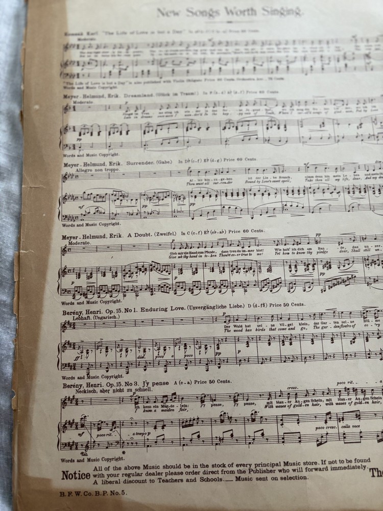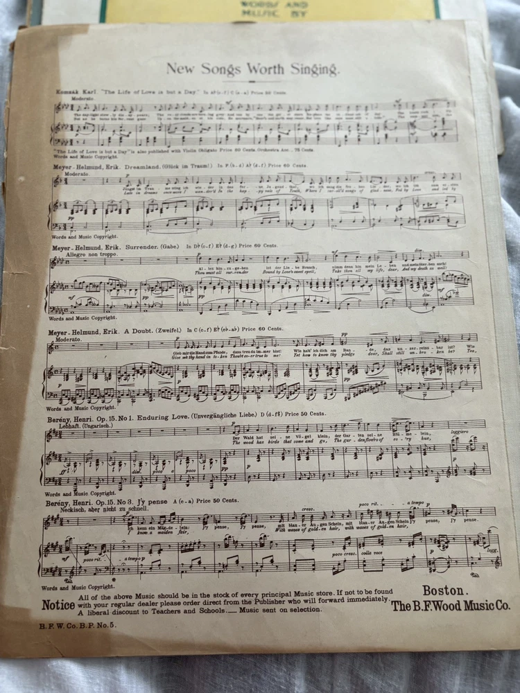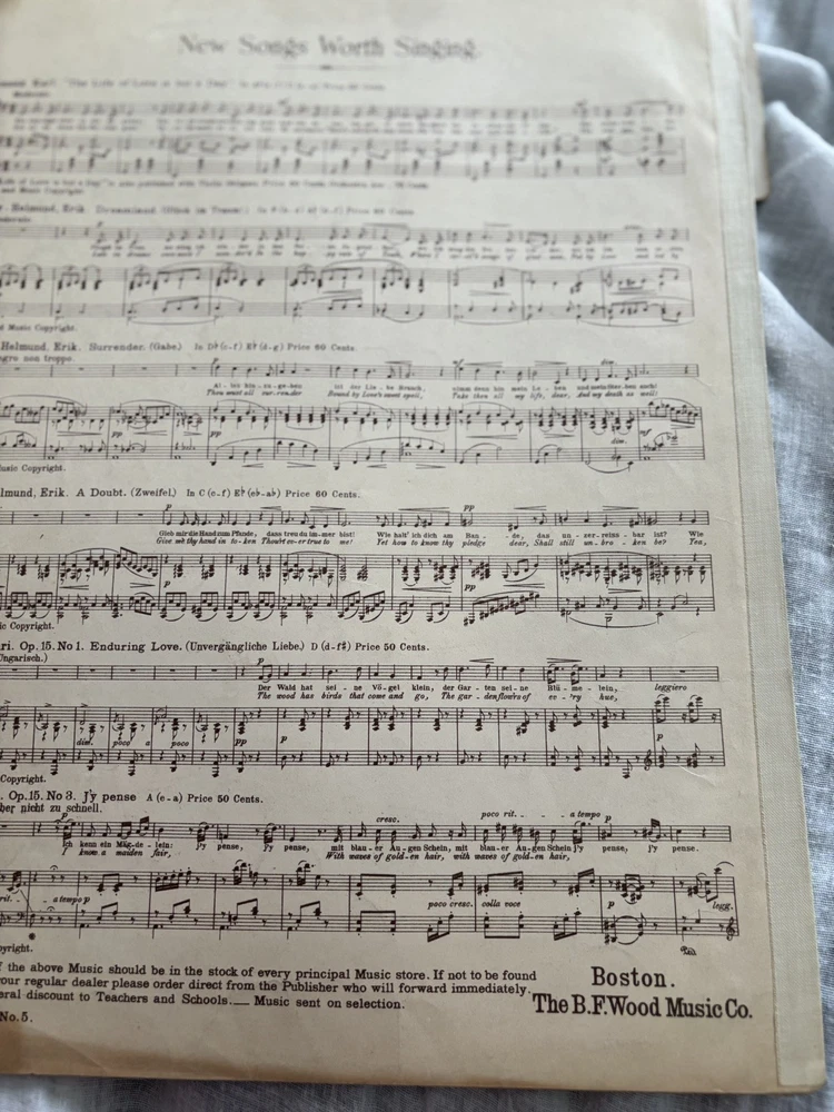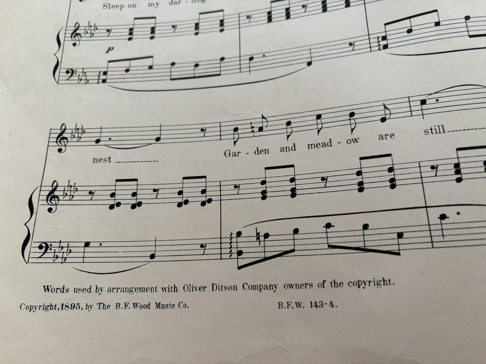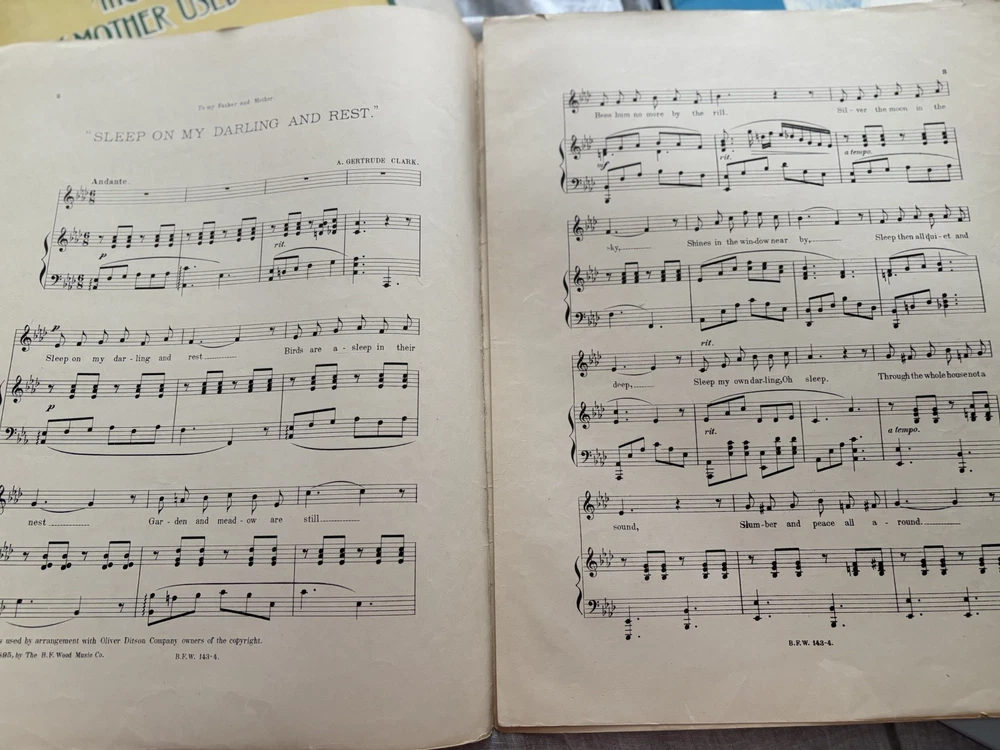Includes: New Songs Worth Singing This product is an antique sheet music from 1895 featuring the songs "Sleep in My Darling" and "Rest" by Gertrude Clark. The sheet music is for piano and is published by B. F. Wood Music in Boston, United States. The materials for this product were sourced from Monaco, blending a touch of international flair into its American roots. Perfect for collectors or enthusiasts of vintage and antique sheet music, this item offers a glimpse into the musical landscape of the late 19th century. The "spine" area is taped. I don't know if that is part of the original distribution or if it was added later