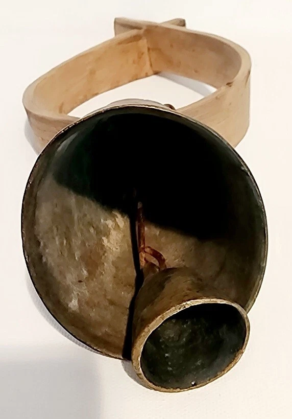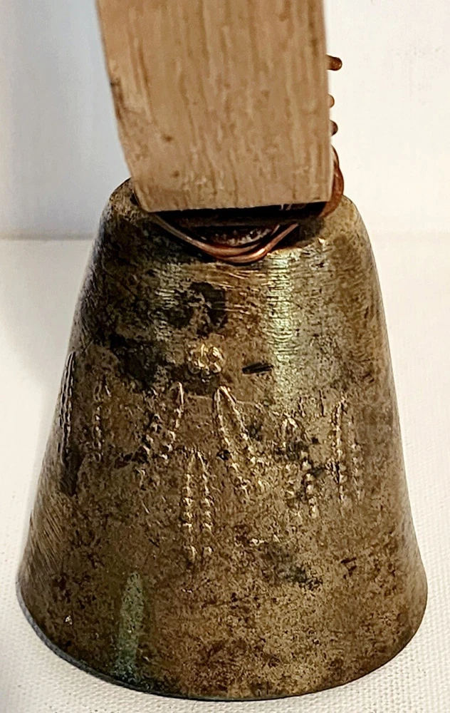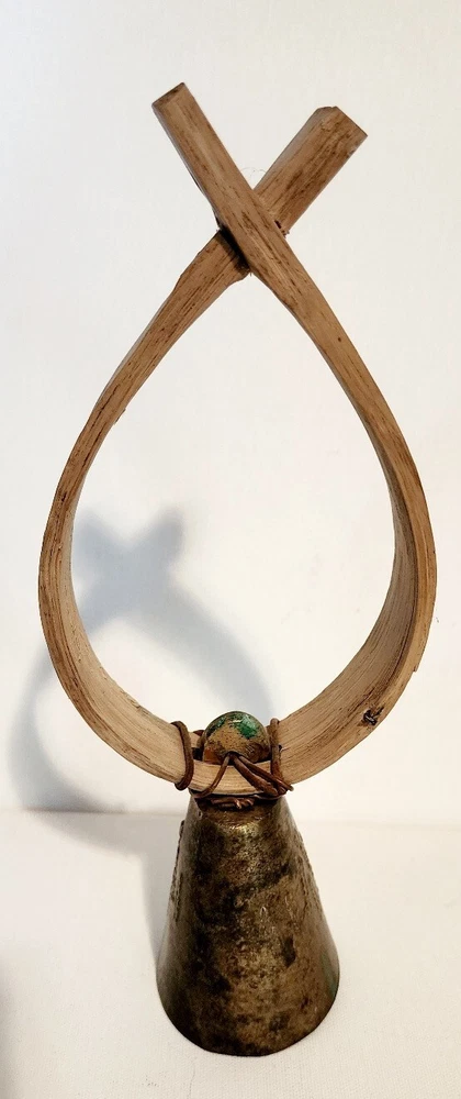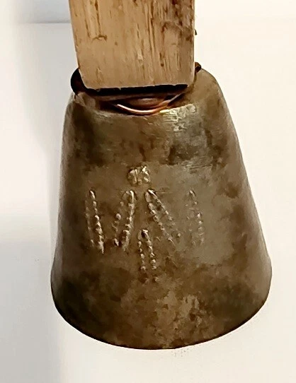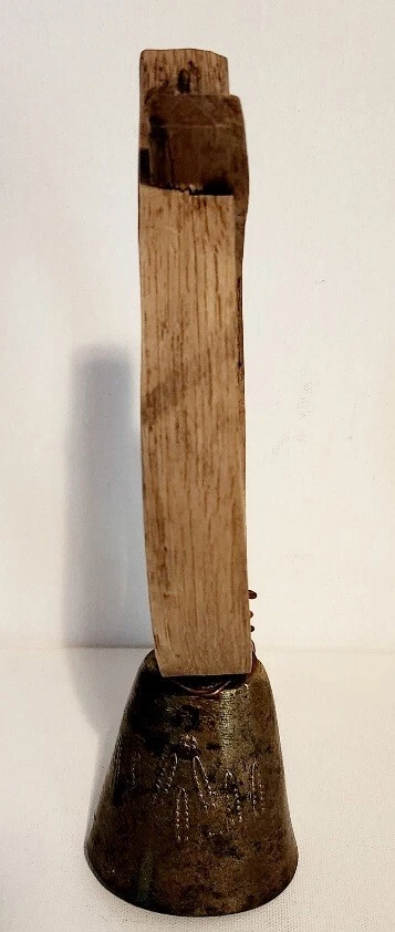 Antique 1900's Primitive Sheep or Goat Bell with a Bent Wood Collar. This is 10.5" tall x 4" wide, bell is about 3" long. Nice relief detail on both sides of the bell, and a nice ring to this!