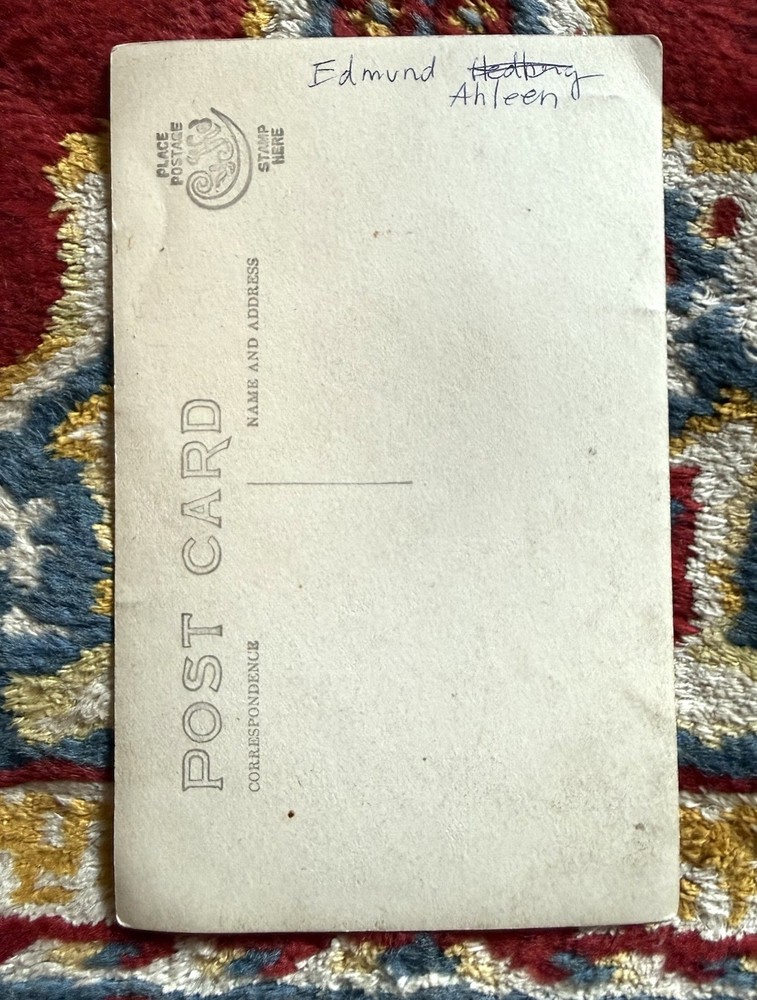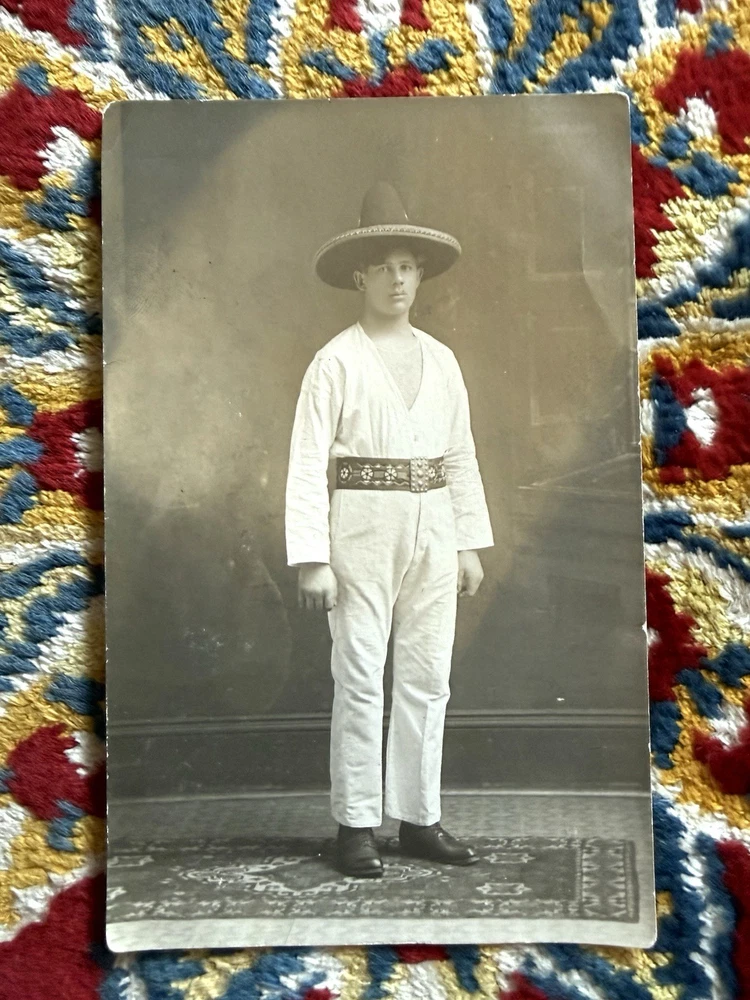 Neat, antique 1910s, man wearing sombrero hat, RPPC photo. It has the subjects name on the back, written in ink. Possibly a souvenir from Mexico. It’s in good, used condition. Offering free USPS Ground Advantage shipping! It measures 3” 3/8 wide by 5” 5/8 long. It does have some paper creasing and curling on the front of the photo and on other places. Selling as is/as found. Makes a wonderful new addition to your antique real photo, postcard/ephemera collection.