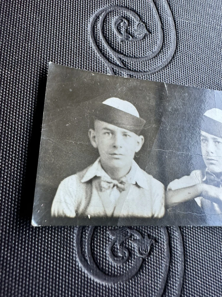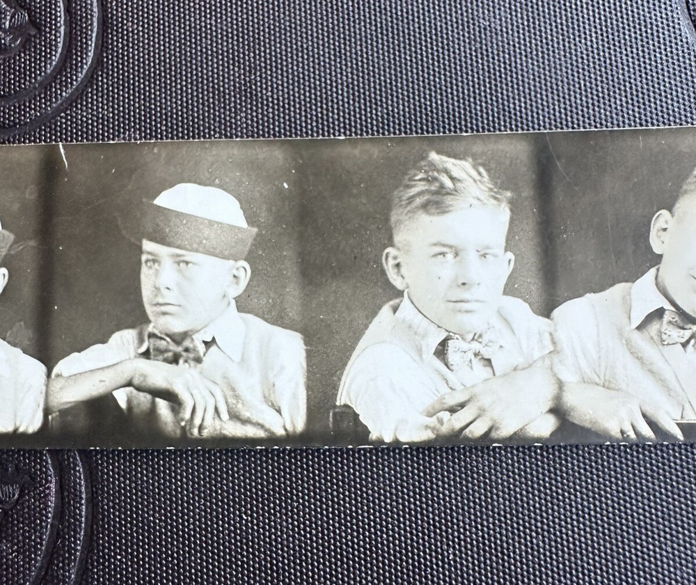Wonderful, antique 1920s or early 1930s Photo Booth coin op photo. Featuring a boy in a hat of that time. The photo measures 5” 1/2 long by 1” 1/4 tall. Unfortunately, the photo has a crease on the front top left photo. As well as in the back right. A must for early coin operated, Photo Booth machine portrait photography. Most likely taken at a fair/carnival/amusement park. Selling as is. Offering free shipping. Thanks for your interest!