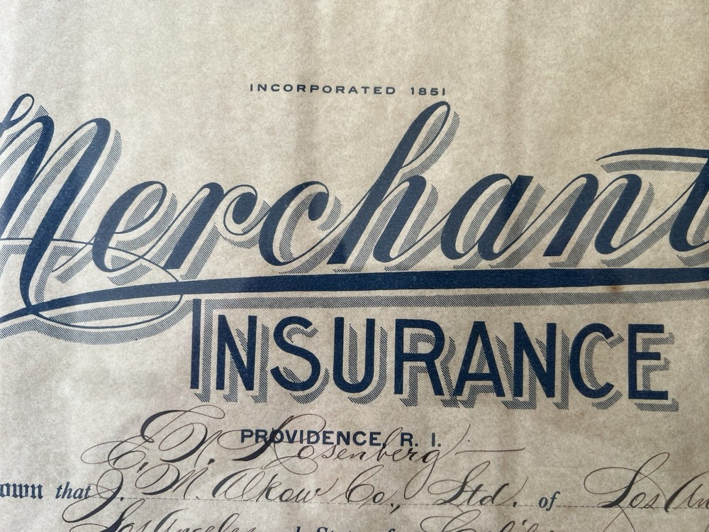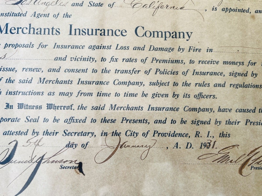 Antique 1931 Merchants Insurance Co Agent Certificate Los Angeles Framed WallArt