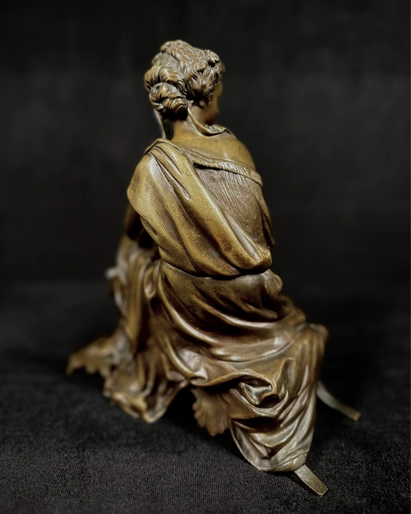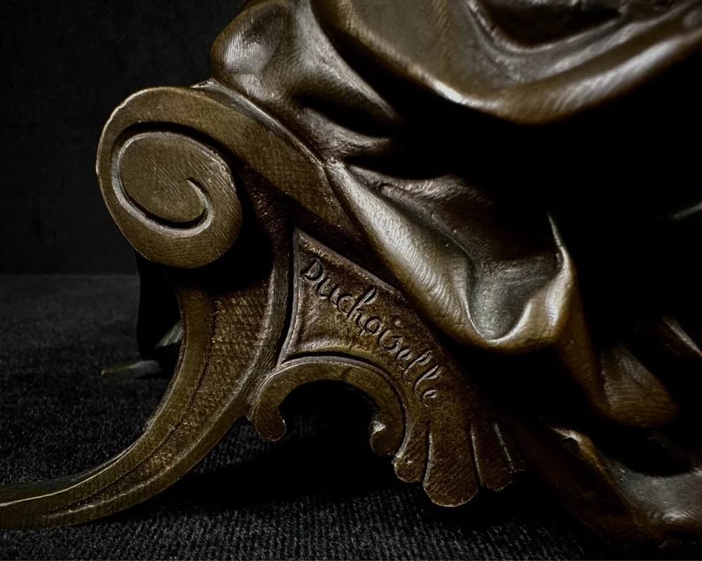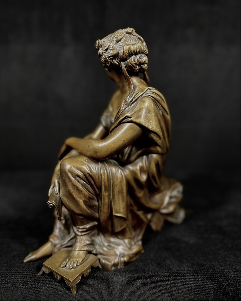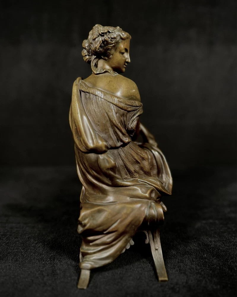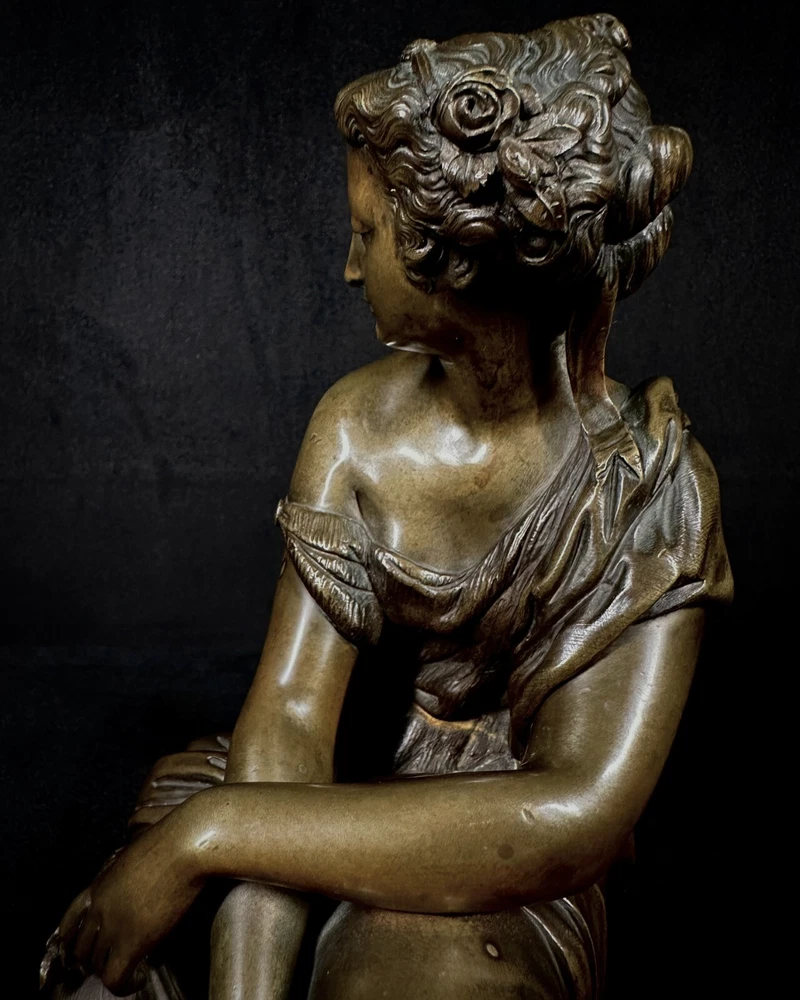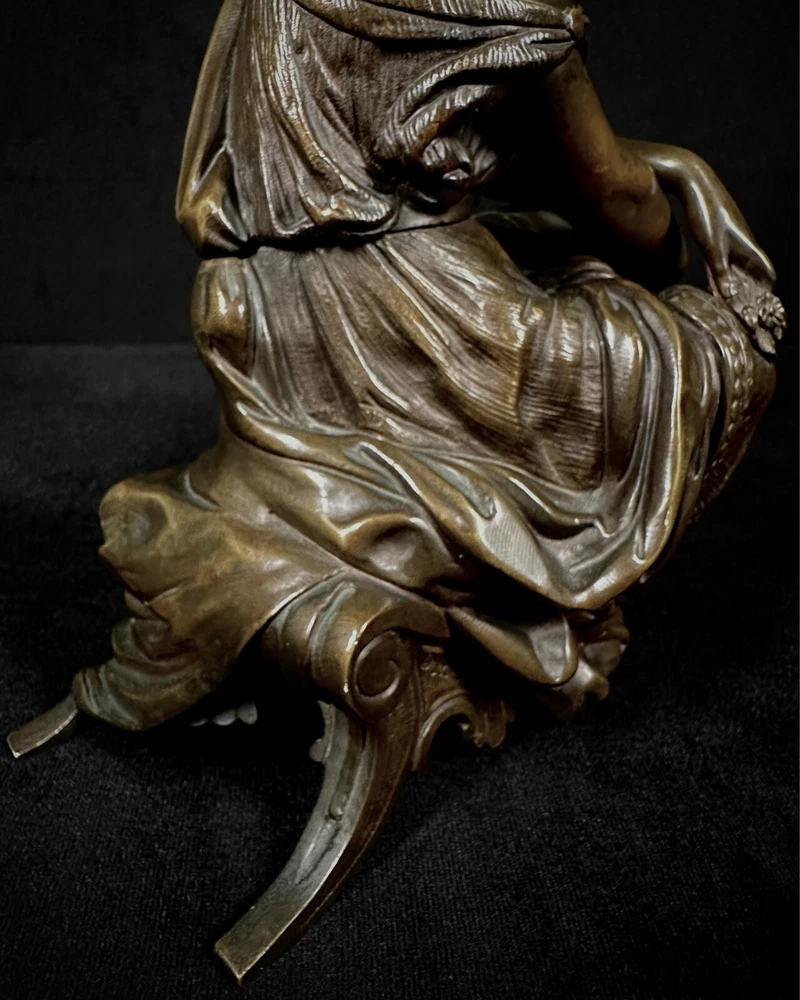 The Antique Late 19th Century ( Circa.1870s ) French Painted Bronze Figure "Femme à l'antique" By Artist Duchoiselle ( French, 19th C. ), Signature in the Left Lower Front Side. This Beautiful Painted Cast Bronze Figure Represents An Ancient Elegant Woman Wearing A Floral Headdress and A Classical Long Dress Sitting Gracefully, Holding A Flower in One Hand and A Scroll in the Other, Look Peacefully at the Side with A Thoughtful Expression. The Proportions of the Figure are Precise, the Figure's Expressions are Vivid and Lifelike, and the Hair, Clothing Folds and Other Details are Delicate and Exquisite. Some Wear on it Consistent with Age, In Good Condition. Title: "Femme à l'antique" Artist: Duchoiselle ( French, 19th C. ) Time Period: 1870s Medium: Bronze Condition: Good Condition Size: 9-1/2" H, 9" L, 5" W Weight: 7lbs. 15oz Available For Domestic Shipping and International Shipping. Thanks!