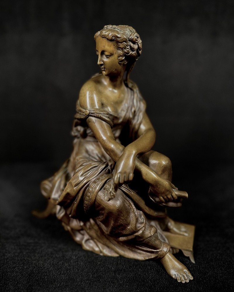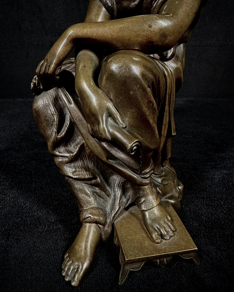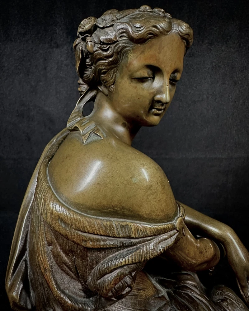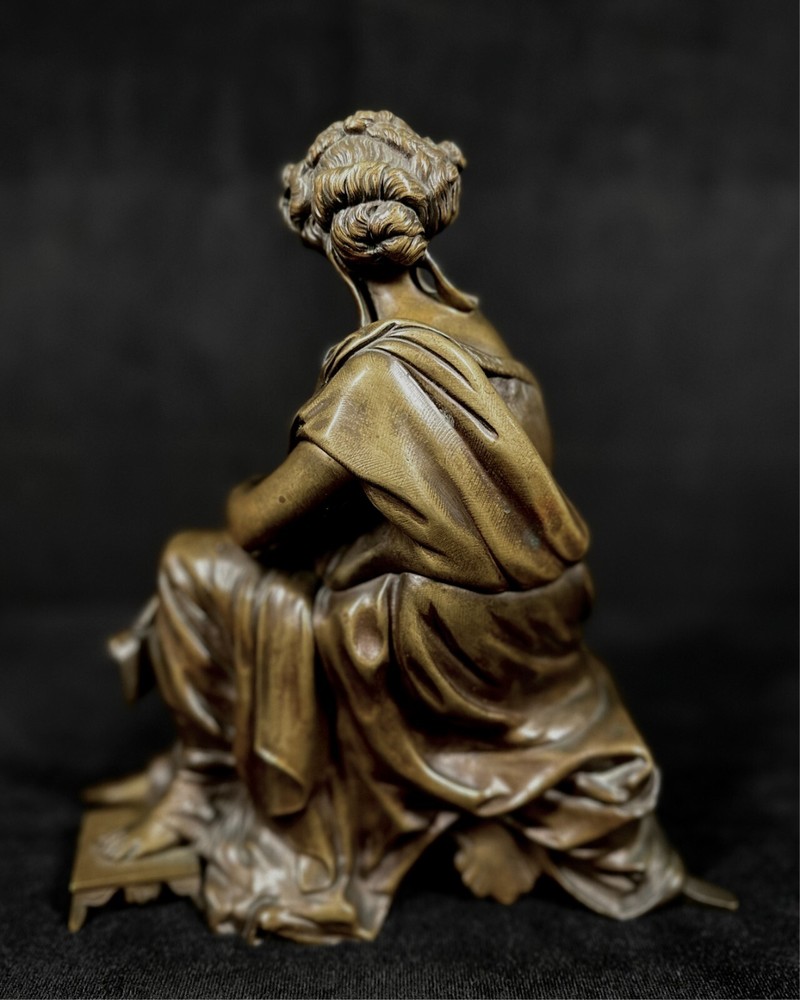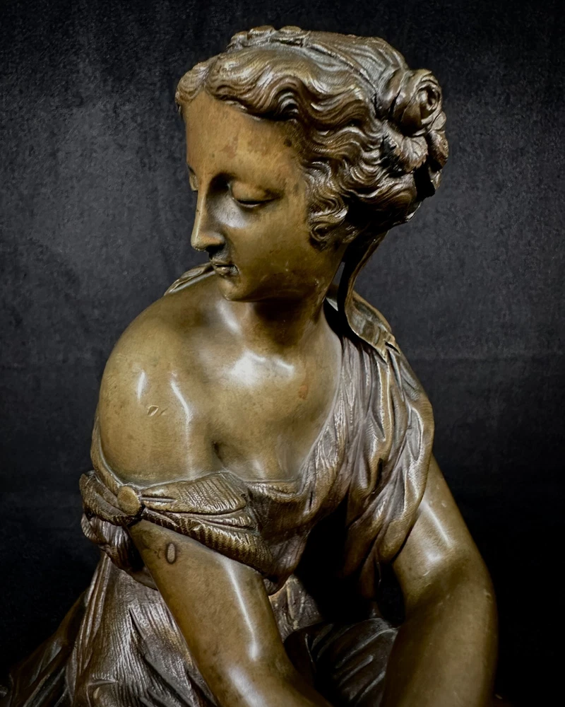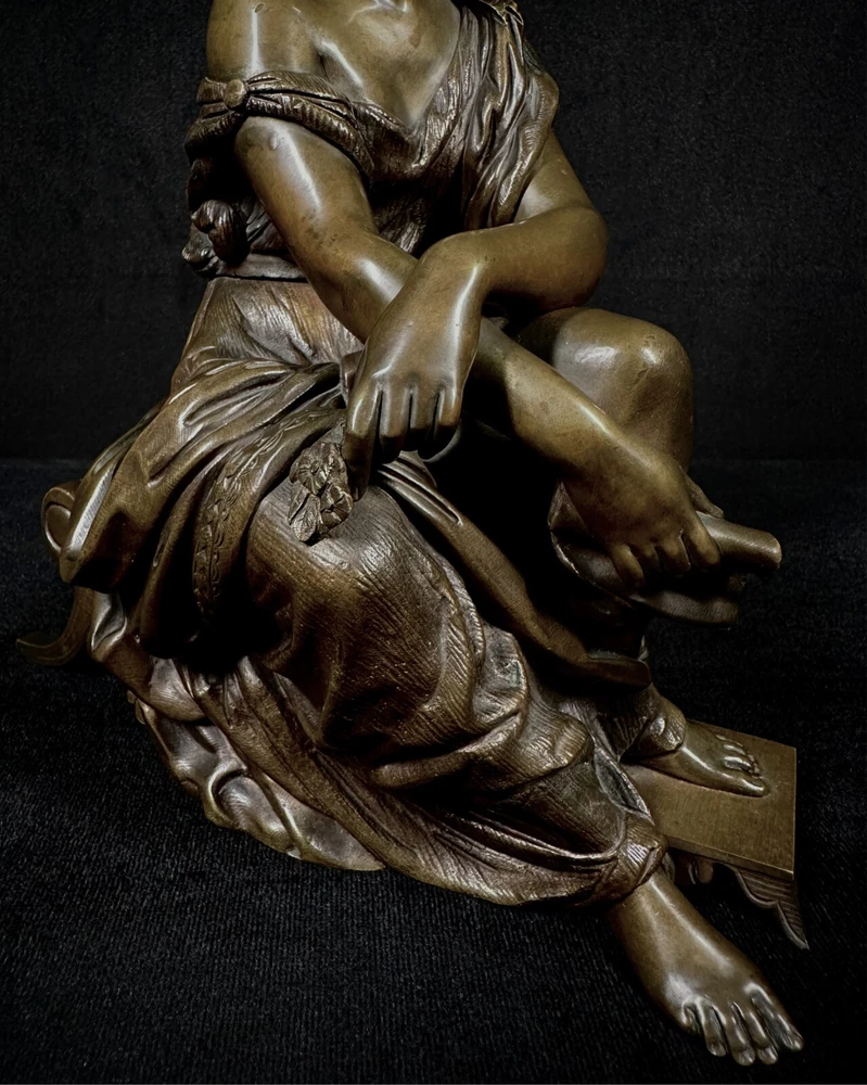 The Antique Late 19th Century ( Circa.1870s ) French Painted Bronze Figure "Femme à l'antique" By Artist Duchoiselle ( French, 19th C. ), Signature in the Left Lower Front Side. This Beautiful Painted Cast Bronze Figure Represents An Ancient Elegant Woman Wearing A Floral Headdress and A Classical Long Dress Sitting Gracefully, Holding A Flower in One Hand and A Scroll in the Other, Look Peacefully at the Side with A Thoughtful Expression. The Proportions of the Figure are Precise, the Figure's Expressions are Vivid and Lifelike, and the Hair, Clothing Folds and Other Details are Delicate and Exquisite. Some Wear on it Consistent with Age, In Good Condition. Title: "Femme à l'antique" Artist: Duchoiselle ( French, 19th C. ) Time Period: 1870s Medium: Bronze Condition: Good Condition Size: 9-1/2" H, 9" L, 5" W Weight: 7lbs. 15oz Available For Domestic Shipping and International Shipping. Thanks!