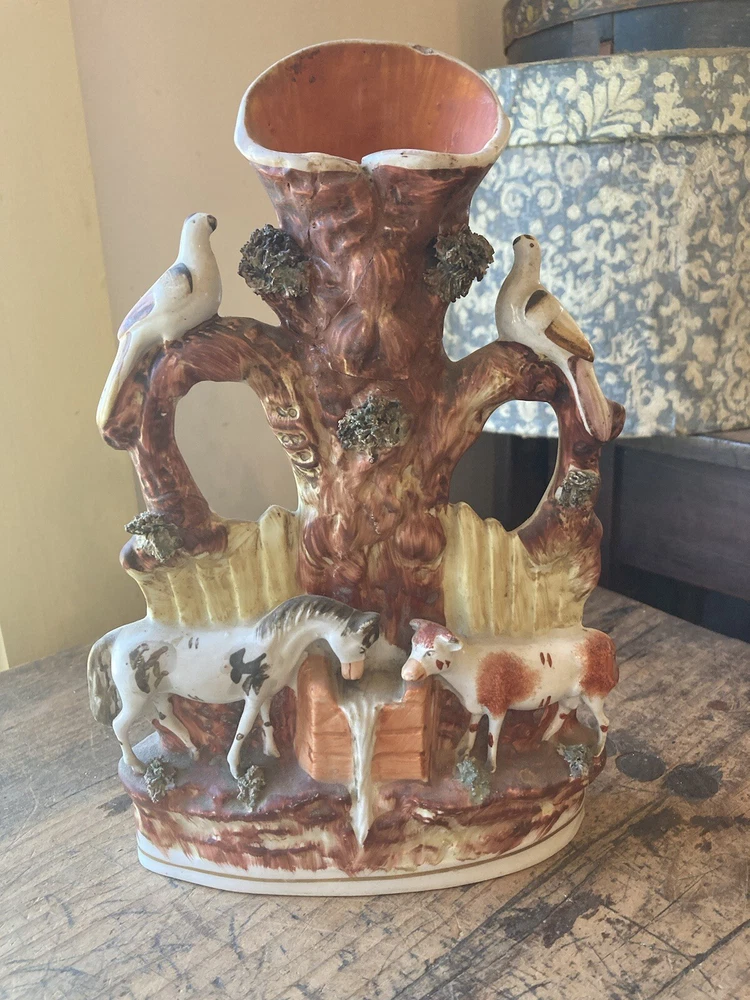 For sale is a nice Antique 19th century victorian era porcelain/ceramic/Staffordshire spill vase used to hold kindling wood shavings. It features a tree with a spring bubbling from beneath and animals around. A nice example of early ceramic work. Each figurine measures 10” tall, 7” wide. It is in restored antique condition on the neck. Not too obvious. See picture. appropriate surface wears and manufacturer imperfections are to be expected. Please check photos from all angles for details. Overall, it is a nice piece of early Victorian era ceramic artwork that would fit well in any antique collectors home. Ship with careful packaging and full insurance. Feel free to check out my other antique and collectible listings. I gladly combine shipping whenever practical.