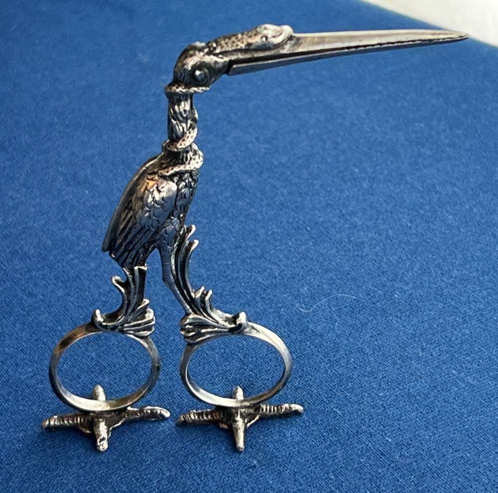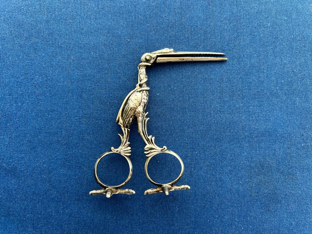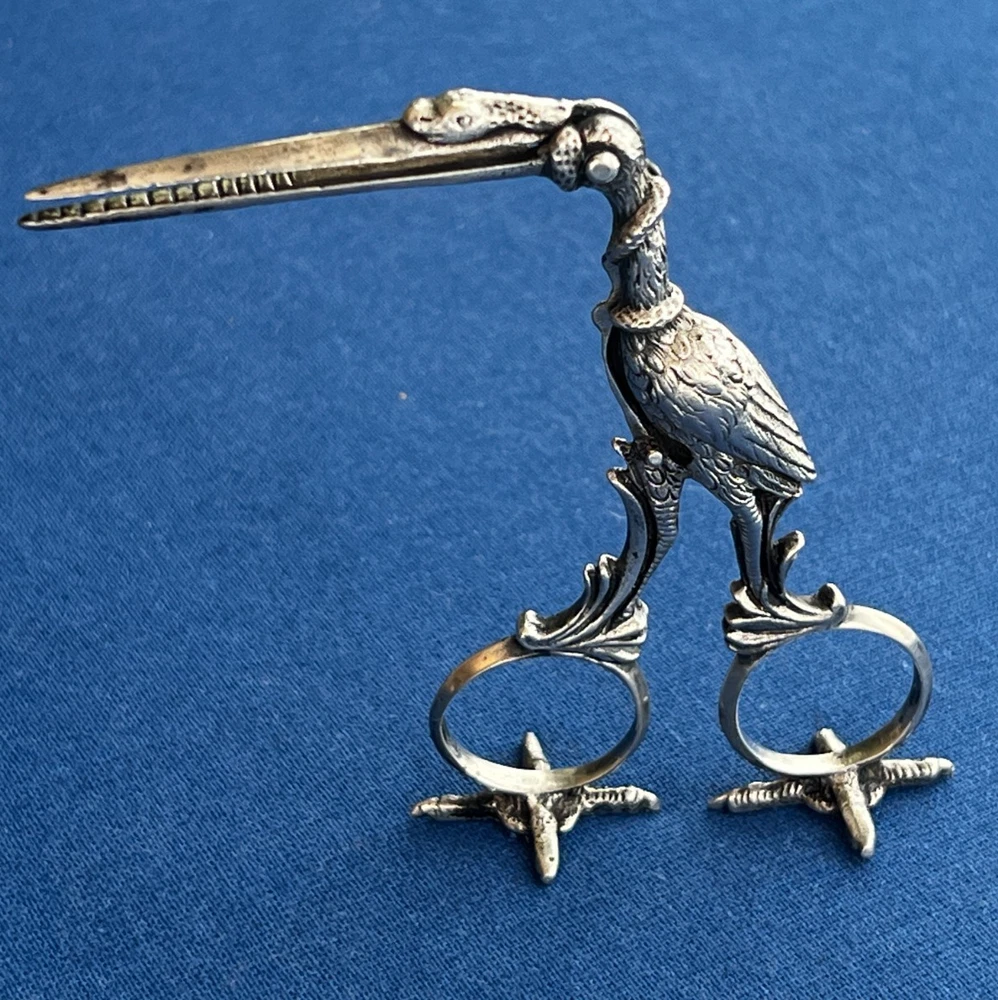 A wonderfully detailed figural stork sewing clamp in solid 800 silver (stamped under the bill), paired with vintage Revlon stork scissors . Packed with symbolism and sculptural detail—display-worthy and collectible. 🧵 Stork Clamp Highlights Material: Solid 800 silver (80% purity), not plated Design: Long stork bill forms the working clamp Hidden motif: Inside the jaws are tiny swaddled babies in relief Symbolism: Coiled snake wraps the neck and beak Freestanding: Detailed stork feet act as a stand —it perches upright (see photos) Markings: “800” purity stamp under bill + maker’s hallmark (unidentified) just below the hinge Size: approx. 4.75" tall (overall) Era/Origin: Late 19th–early 20th c., continental Europe ✂️ Bonus: Revlon Stork Scissors Vintage Revlon embroidery/sewing scissors (marked REVlon / W. Germany ) Good working condition; classic stork form Condition Notes Clamp opens/closes smoothly; lovely age patina from decades of gentle use No breaks or repairs noted Revlon scissors show light surface wear consistent with age Please review all photos for the best representation of condition 📌 Collector Notes Figural stork tools are favorites in antique sewing and medical-curio circles. This example stands out for its babies-in-jaws and serpent details, solid 800 silver construction, and the ability to stand on its own feet for display. 📦 Shipping Carefully packed, boxed with padding, and shipped insured with tracking (USPS Ground Advantage). 👉 Thanks for looking! Check out my shop for more antique sewing and vintage curiosities!! 👈 +++ 🔹 A Note on My Listings: I am not a historian or antique dealer, but I do my best to research and provide accurate information. Please review the details and conduct your own research if needed. I encourage you to ask any questions before purchasing—I’m happy to help! I strive to represent all items accurately, whether they come from my own home or another well-loved source. If you notice anything that seems incorrect or misrepresented, or if you have any concerns after receiving your item, please reach out directly—I’ll gladly assist in resolving any issues.