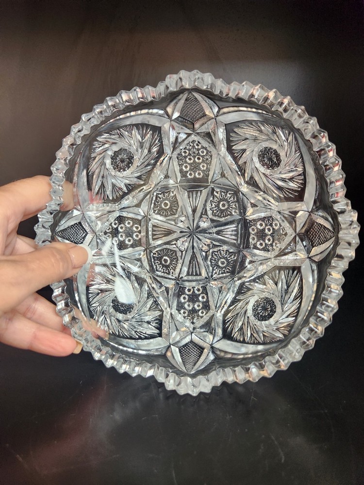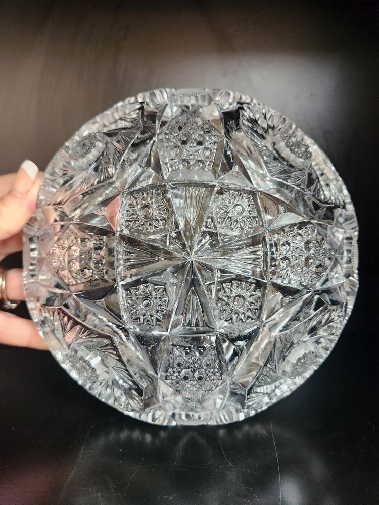 The ABP American Brilliant Period Clear Cut Glass Candy/Nut Dish, dating back to 1876-1915, is a beautiful and collectible decorative piece that exudes elegance and style. Made from glass with a clear color, this original piece reflects the craftsmanship and design of the American Brilliant Period. Perfect for storing candies or nuts, this dish adds a touch of historical charm to any decor with its intricate details and timeless appeal. Size: 7.5" diameter.