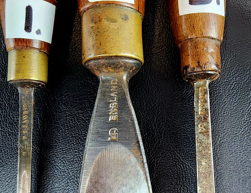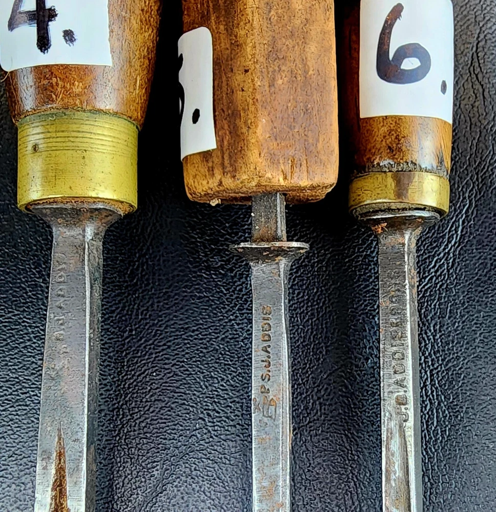 Antique ADDIS Carving Chisels x 10 pieces by mixed family makers. I have 1 x J.B.ADDIS Junior listed also. Combined postage available. Important: SEE POSTAGE DETAILS BELOW Details of each chisel is listed below, I have done my best to describe them, however some markings are hard to read so there is NO guarantee that all information is 100% correct. 1 PS.J ADDIS Gouge Marked 4. L. 210mm 8” Cutting Edge 4mm 3/16 th 2. PS.J ADDIS Gough Marked 5 L.235mm 9” Cutting Edge 26mm 1” NOTE: Handle has damage but is solid and usable. Easy Repair 3. PS. ADDIS Flat cut Marked 3 L 200mm 8” Cutting Edge 5mm ¼” 4. PS.J Addis V cut Marked 39 L210mm 8 ½” 5. PS.J ADDIS V Cut Marked 11 L 150mm ( Needs new Handle) 6. J.B ADDIS & Sons Gouge Marked ?, “Prize Medals” L 200mm 8” width at cutting edge 5mm 7. J.B. Addis Flat Cut Marked 9 “Prize Medals” L 195mm 7 ¾” width at cutting edge 3.5mm. Handle has been repaired, but quite solid 8. ?? ADDIS V Cut Marked 39 L 190mm 7 ½” (Hard to read first initials) 9. S.J ADDIS Tip broken off, handle in VGC. P.S.J ADDIS Small flat cut NO HANDLE Postage: I have a ADDIS Junior chisel listed separately, should you purchase that one, it can be included with this lot at no extra charge saving 1 x shipping fee. Note that Australia Post only insure the parcel for AUD $100 should you require extra insurance it is $4 aud per $100aud