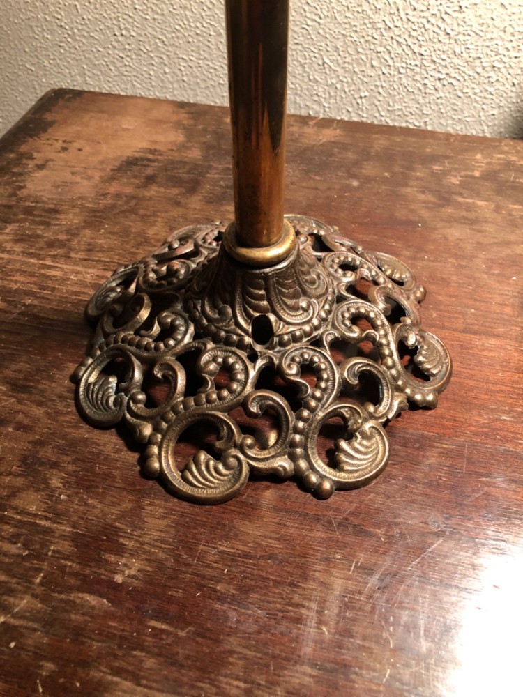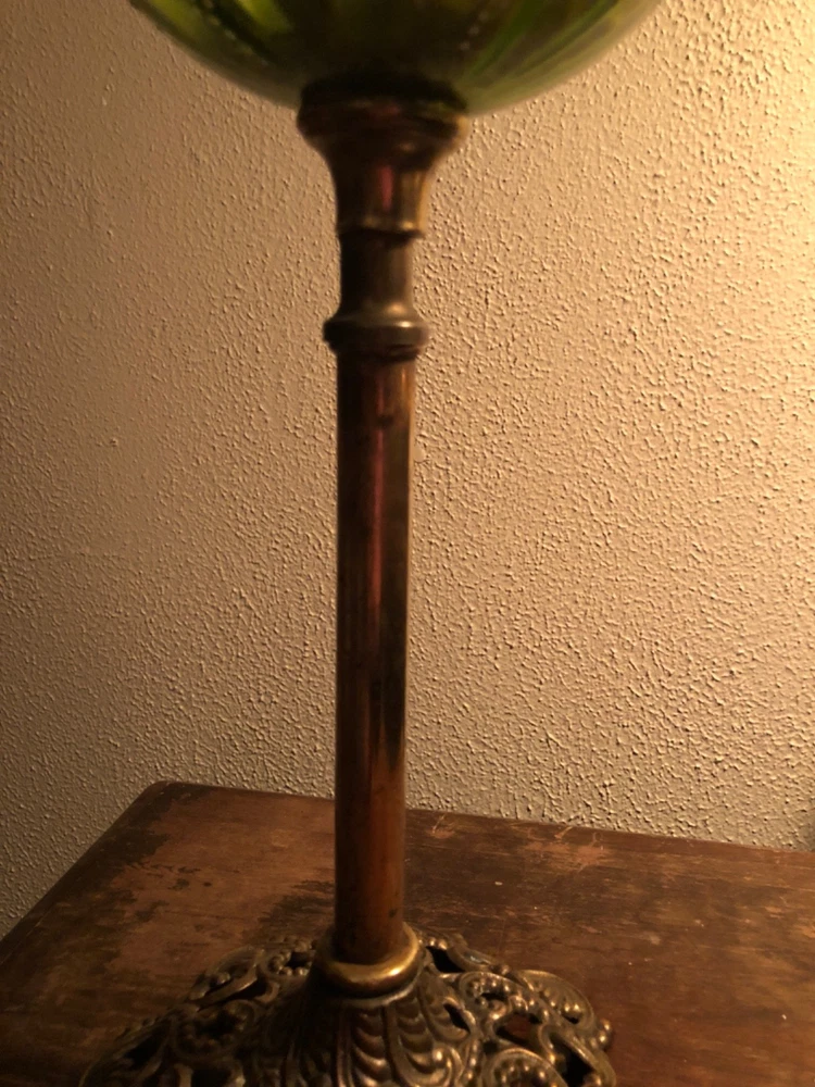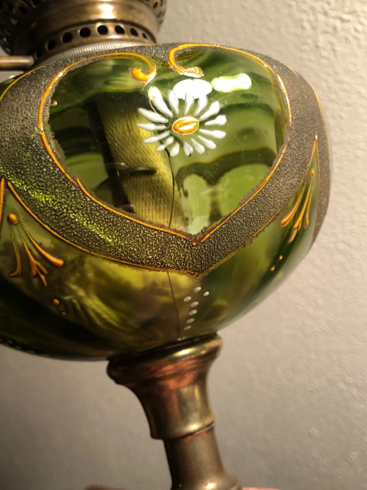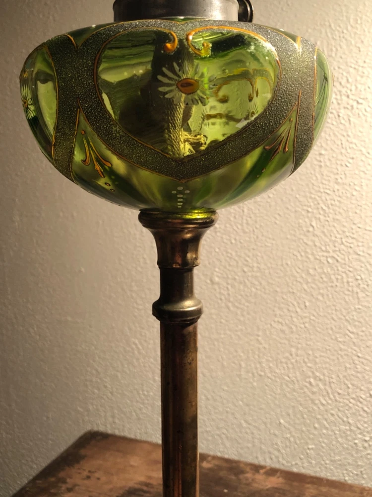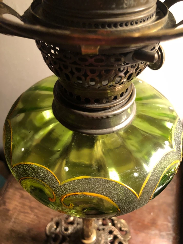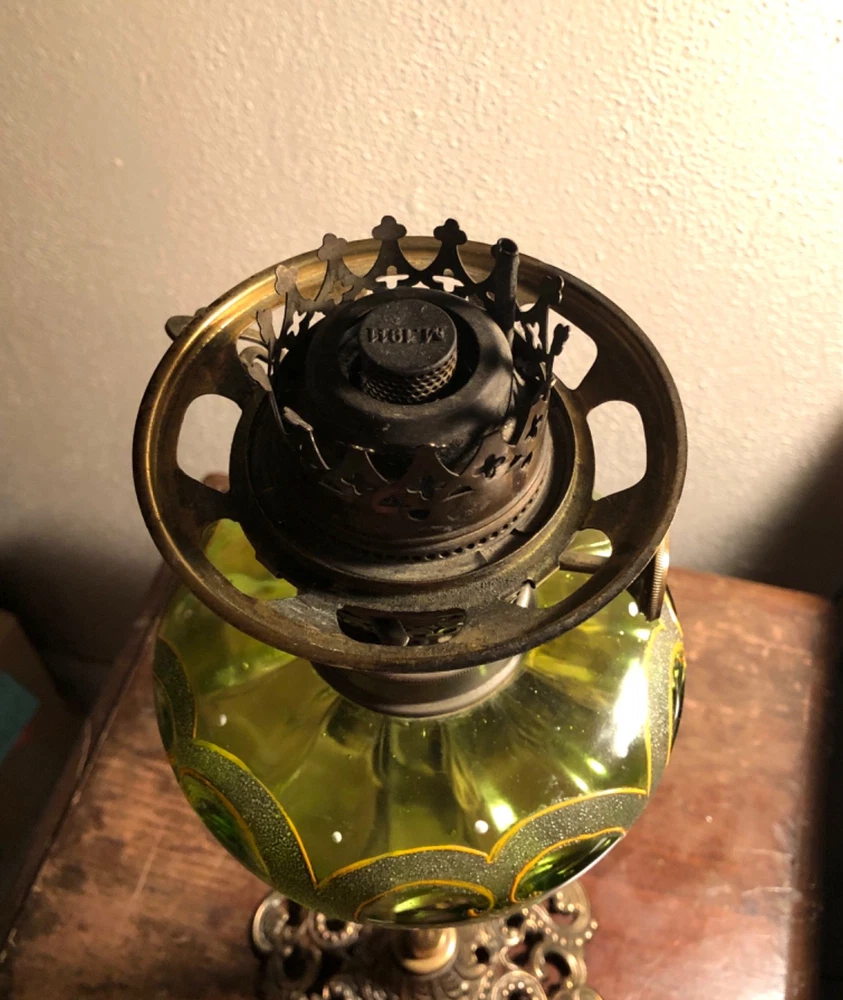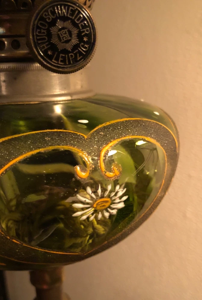The Antique Victorian-Art Nouveau Oil Lamp with a green glass base and flower pattern is a vintage piece that exudes elegance and charm. This large-sized lamp features a lantern design with a knob control burner by Hugo Schneider, Leipzig. Made of antique brass with a finish that complements the intricate Victorian Art Nouveau style, this original oil lamp from the late 19th century is a unique and captivating addition to any collection or space. No chimney included. !!!Glass oil bowl is cracked, so lamp is unusable unless bowl replaced or repaired. See description and photos. Suitable for decor or collection display. Lamp will be disassembled for shipping. Original unused wick is attached to burner.