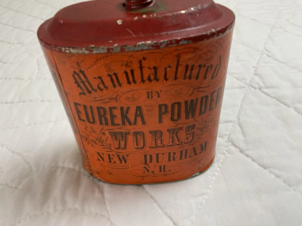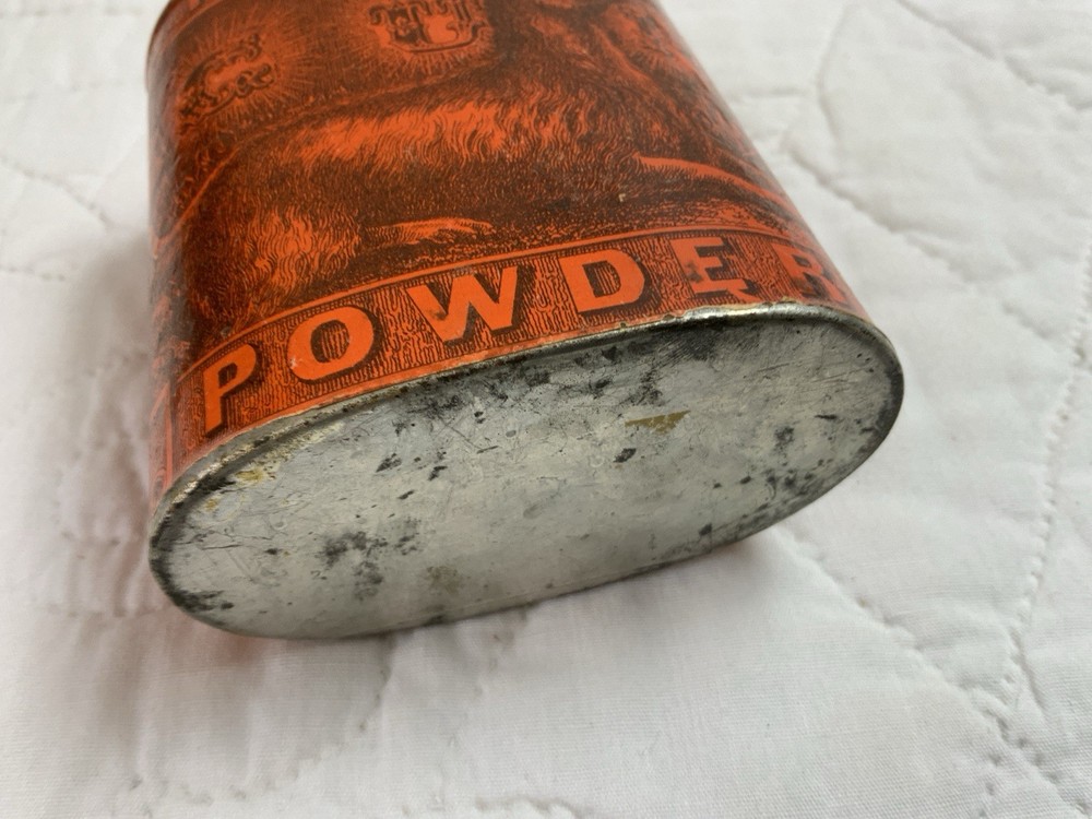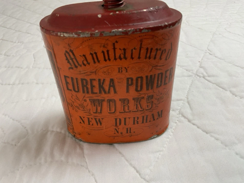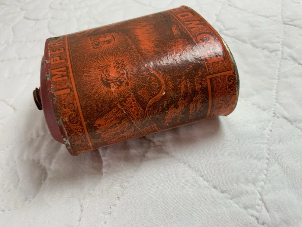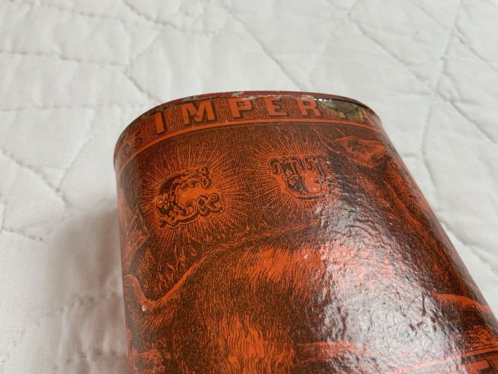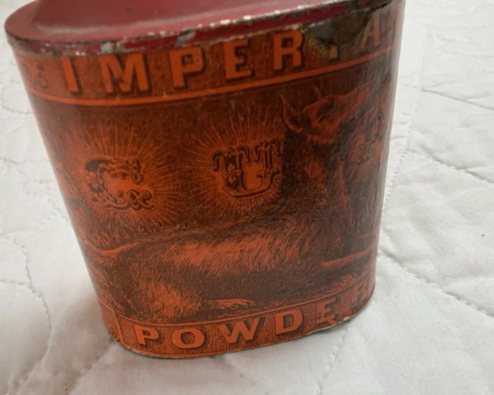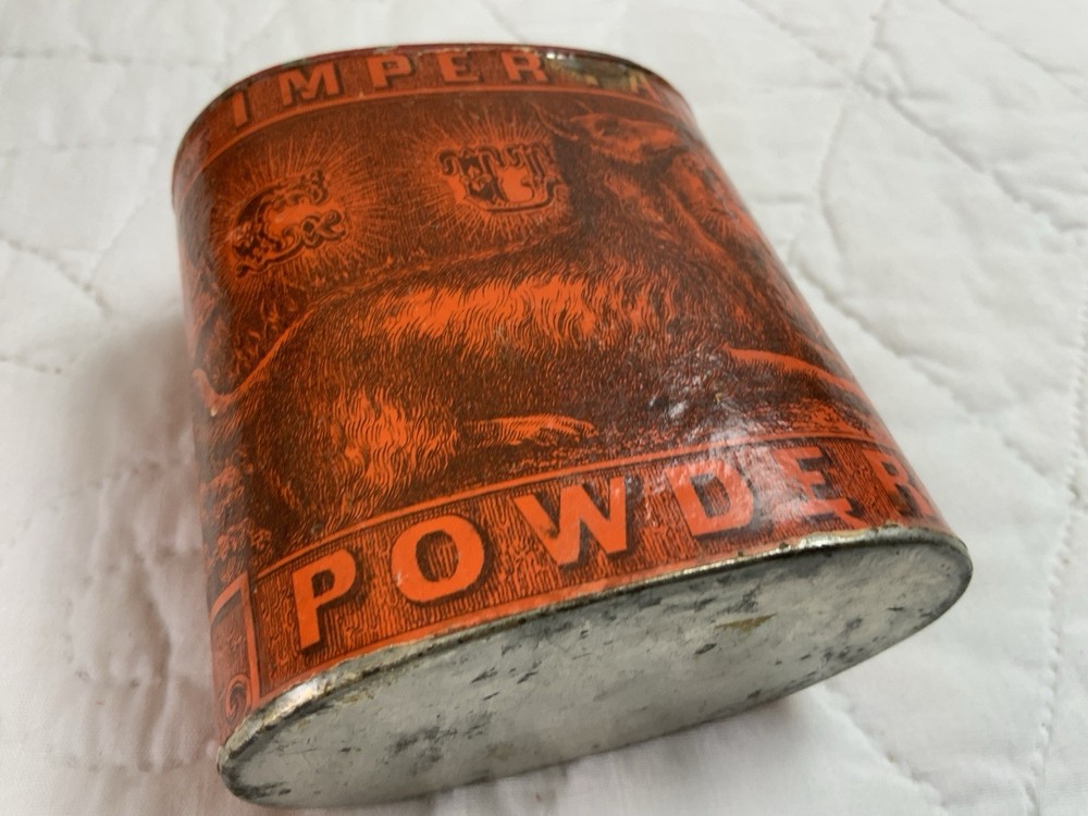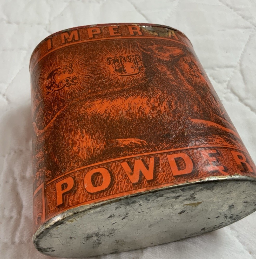 Up for sale is an antique advertising tin. Very rare tin with a dog on one side. Imperial Gun Powder, Manufactured by Eureka Powder. Works New Durham, N. H. No lid. Multi colors with orange and black. Very good condition. Some scratches. Some wear. Minor wear on the i in Imperial. Great graphics. Sold as is. Refer to all pictures. Measures 3 1/4” by 2” by 4” tall. Very clean bottom. Antique powder tin from the early 1900’s. Made in USA. From the country store era. Thanks and happy shopping. I will combine shipping charges. Smoke free home. Please make payment in three days. ~~~~🌻🌷🌺Please visit my eBay store: 🇺🇸webbsamericancountry1🇺🇸 for over 2000 vintage and collectible items.~~~~🌹🌻🌷
