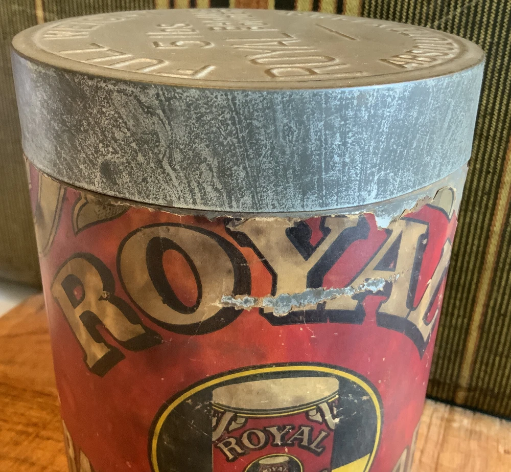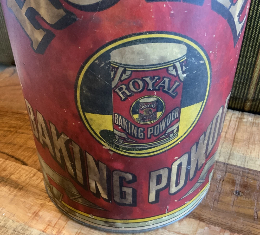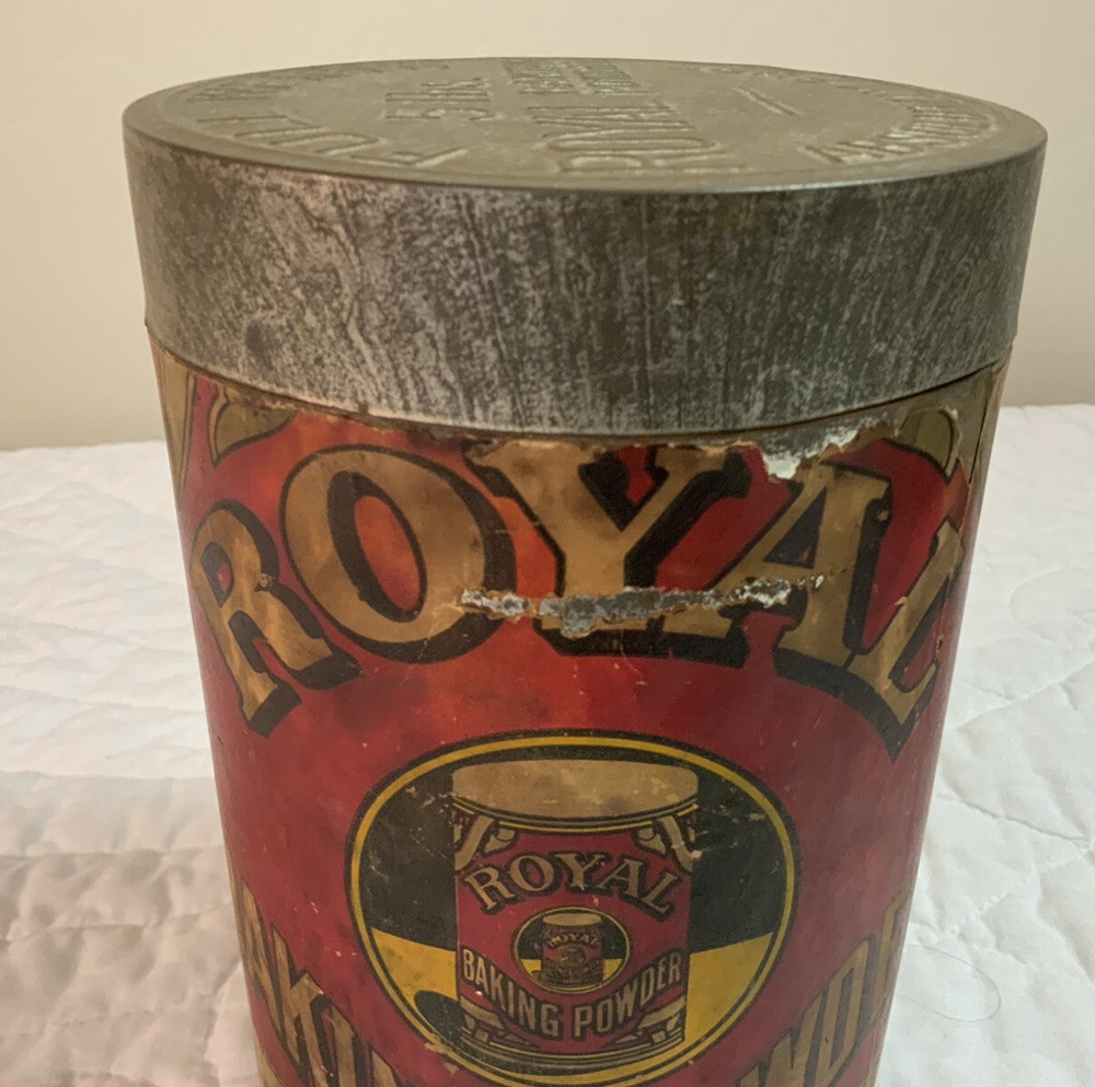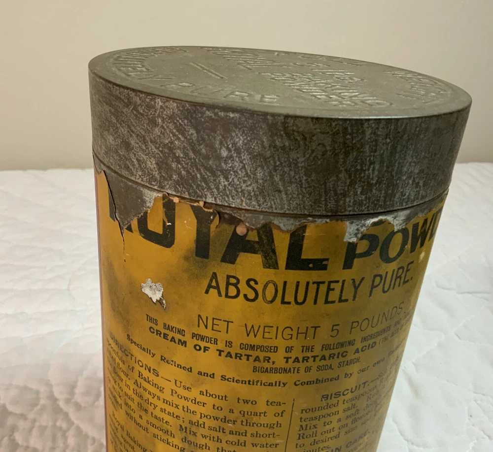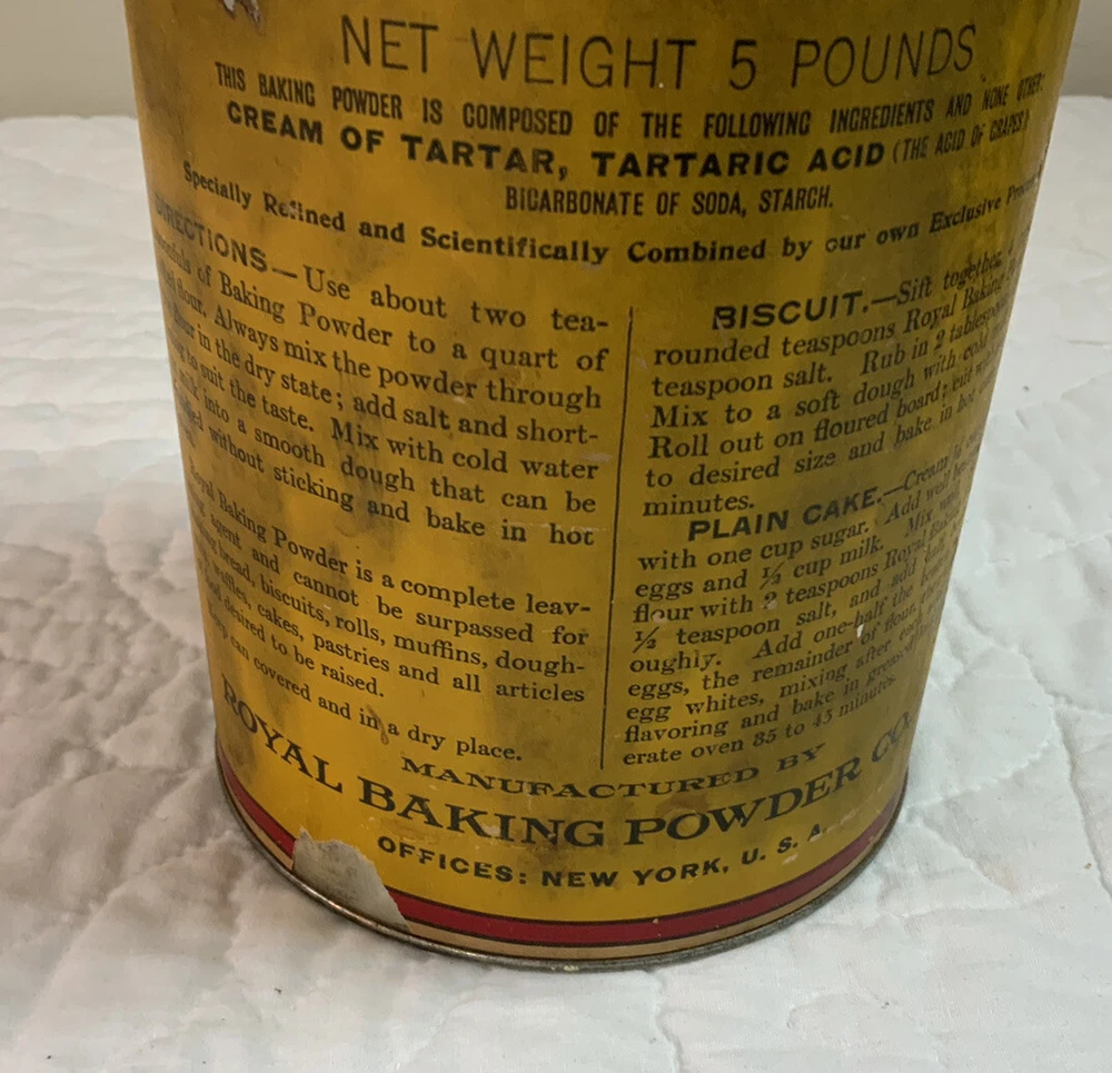 Up for sale is an antique advertising tin. Royal Baking Power, absolutely pure. Five pound size. The top has written: Full Weight 5 lbs. Royal Baking Power Absolutely Pure. Paper label applied to the tin can. Original. The colors are red, gold, yellow, black. Some of the paper has peeled away, scratched. But, not too bad. The back has recipes. Manufactured in NY. USA. I could not easily get top off. Refer to all pictures as they are part of the description of this item. No major dents. Measures 8 1/4” tall by 6 1/2” round diameter. Antique tin from the late 1800’s era. This is one of a large collection just purchased of an antique country store collection of antique tins. Made in USA. Thanks and happy bidding. I will combine shipping charges. Smoke free home. Please make payment in three days. ~~~~🌻🌷🌺Please visit my eBay store: 🇺🇸webbsamericancountry1🇺🇸 for over 2000 vintage and collectible items.~~~~🌹🌻🌷