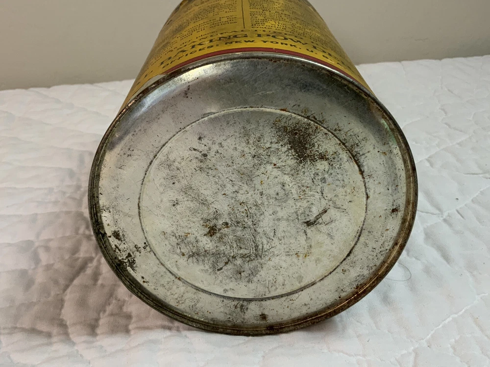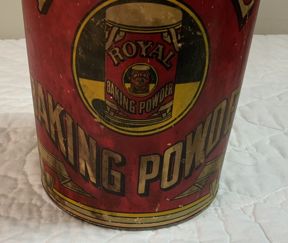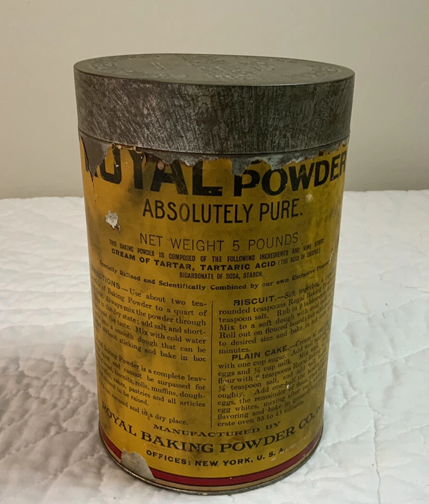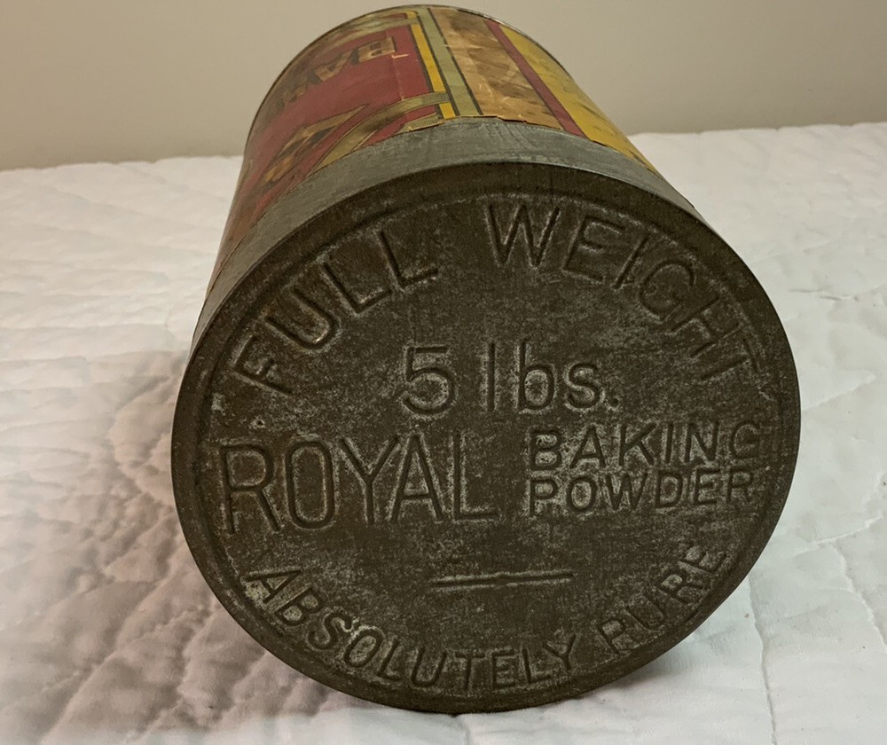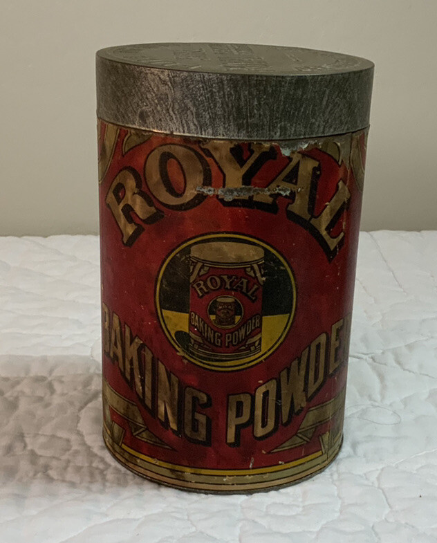 Up for sale is an antique advertising tin. Royal Baking Power, absolutely pure. Five pound size. The top has written: Full Weight 5 lbs. Royal Baking Power Absolutely Pure. Paper label applied to the tin can. Original. The colors are red, gold, yellow, black. Some of the paper has peeled away, scratched. But, not too bad. The back has recipes. Manufactured in NY. USA. I could not easily get top off. Refer to all pictures as they are part of the description of this item. No major dents. Measures 8 1/4” tall by 6 1/2” round diameter. Antique tin from the late 1800’s era. This is one of a large collection just purchased of an antique country store collection of antique tins. Made in USA. Thanks and happy bidding. I will combine shipping charges. Smoke free home. Please make payment in three days. ~~~~🌻🌷🌺Please visit my eBay store: 🇺🇸webbsamericancountry1🇺🇸 for over 2000 vintage and collectible items.~~~~🌹🌻🌷