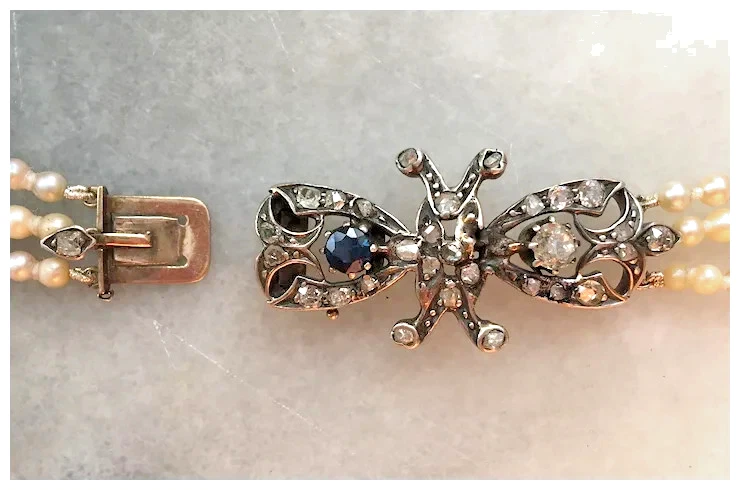 A unique antique Diamond and natural unheated blue Sapphire set claspon a triple row of Japanese Akoya Saltwater Pearls. Theclasp is 19th century and hand crafted from sterling silver with agold wash underside. The stylised Butterfly is unique in itsformation and has been set with natural white diamonds and a natural,untreated naturally mined blue Sapphire stone. The AkoyaSaltwater Pearls date from 1920s and recently restrung onhand-knotted silk. Natural diamonds - 1 x 4.2mm rounddiamond and 29 old mixed cut white diamonds. Natural Corundum(Deep Blue Sapphire), Round Mixed Cut, Transparent, Eye Clean, noevidence of heat treatment 4.27 x 3.36mm Pinctada Fucata(Akoya) Saltwater Cultured Pearls, round-near round, pink and greenovertones, very good lustre, 3.2mm - 8.2mm The clasp isunmarked sterling silver, tested. Length: 1.65 inches (4cm) Width: 20mm Necklace: Length (longeststrand): 19.5 inch (50 cm) Shortest strand length of pearls:17.3 inch (44cm) Shortest strand to end of clasp: 18.7 inch(48cm) Weight: 55.87g The Antique clasp is aged -the gold wash has mostly rubbed, there is a small break to thesterling silver with a small diamond deficit, unnoticeable when worndue to its location being surrounded by other diamonds. Please viewthe enlarged photographs of the area which is clearly visible on theright hand side. In addition to this, two diamonds are chipped,but still firm in settings, as are all the stones. If you have any questions, please let me know. NOTE: International delivery is DHL which is the only insurable option.