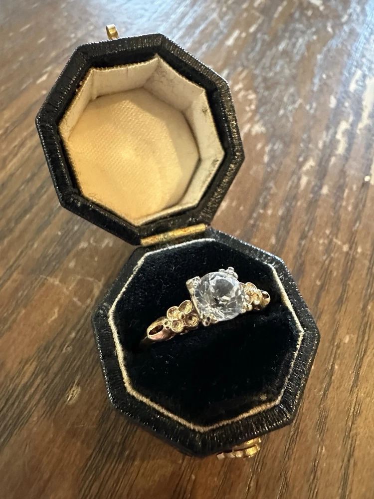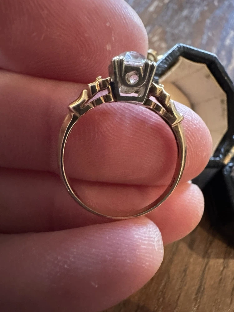 Beautiful authentic antique green. White sapphire. I’m not sure the exact carrot weight but it looks to be approximately one carat.