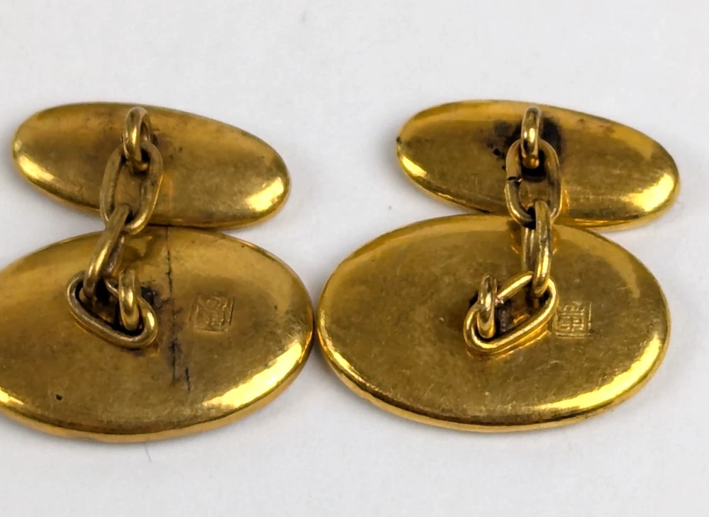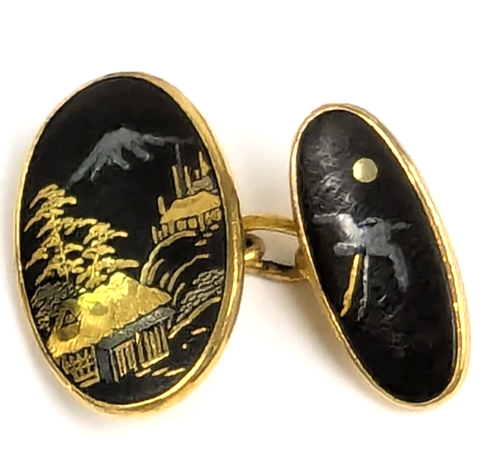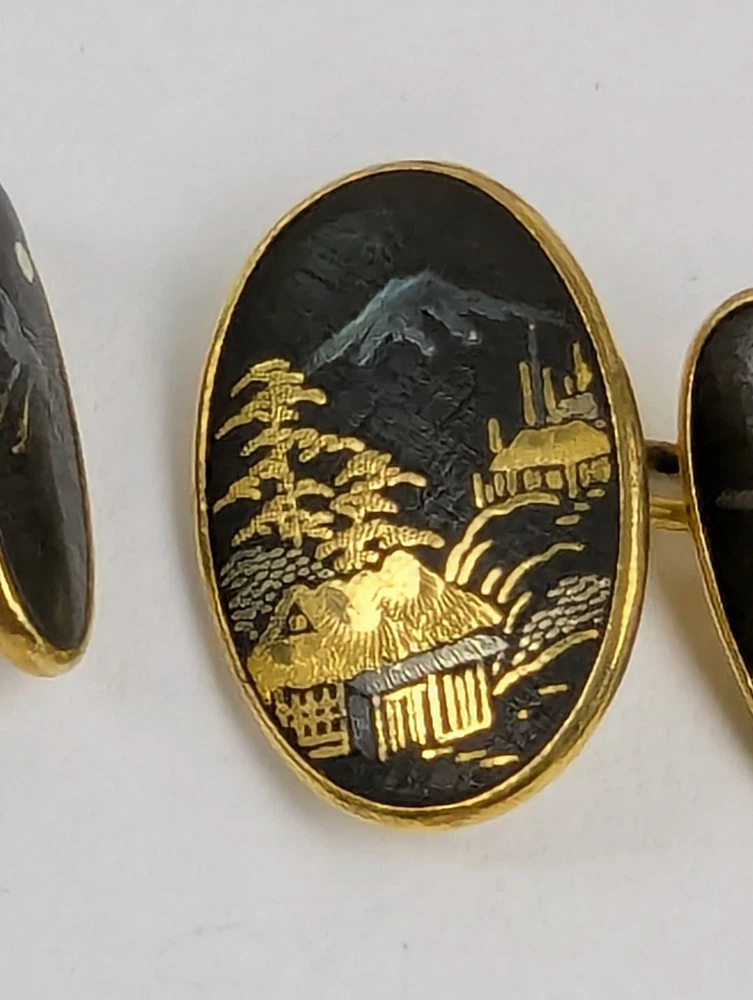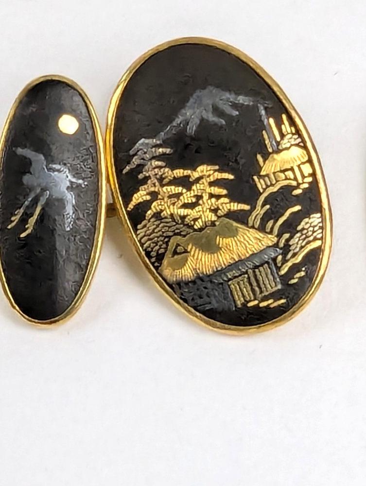 Antique Japanese Sterling Silver and Yellow Gold Damascene Inlay Cufflink Buttons. Beautifully crafted with inlay silver and gold featuring a village scene with Mt. Fuji, Pagodas and trees with a Moon and Phoenix bird on the other side. Hallmarked with a Japanese mark on the backside. Lovely Intricate Inlay Cufflinks in excellent estate condition. No faults 5302
