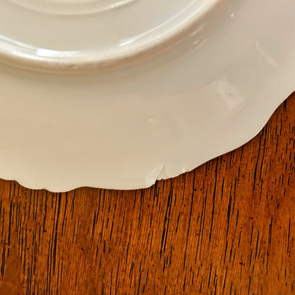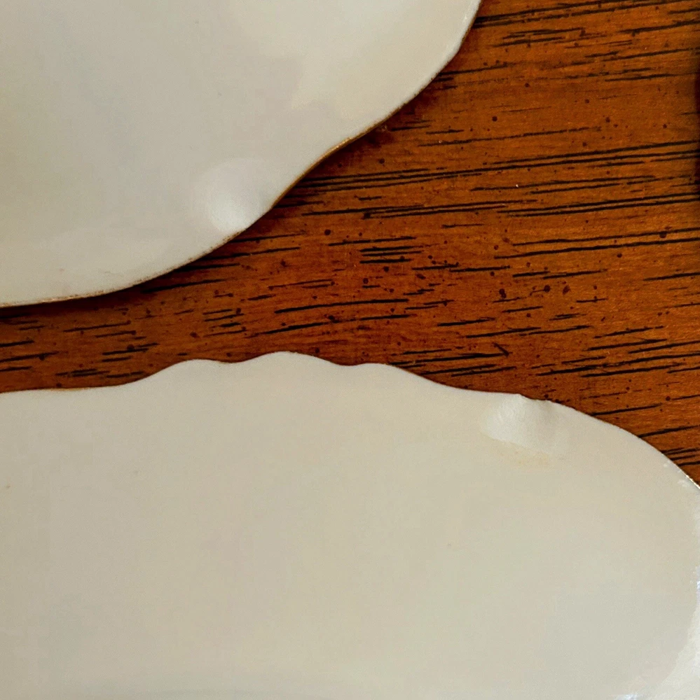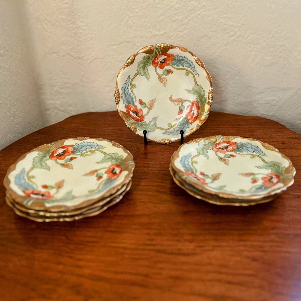 Stunning Antique Art Nouveau Limoges France decorative plates. Beautiful gilded poppy design. These plates were made in France by Limoges for Elite Works Saint Martial. Elite Works S.M. had established a factory near Limoges to decorate the blank porcelain plates that Limoges manufactured, so these plates bear two backstamps, the "Elite L France" (used from 1896 - 1920) and the red "Elite Works SM Limoges France Stamp" (used from 1920 - 1932). We can say with certainty that these plates were made in 1920. For even more history, a NYC firm called Bawo & Dotter (founded 1860) likely had these plates commissioned for import to the United States. These plates are hand painted and are signed by the artist. There are some condition issues with chips and some rubbing on the paint, see details below. These plates are STUNNING works of gilded age art and while not perfect, I think they will make someone very happy. Measurements: 7.25" Diameter Condition: All of the plates show light loss of color from improper storage (in the form of rubbing - so tragic, always store your hand painted plates properly!). This is fairly minor and exist to varying degrees on the plates. I do not think it significantly detracts from the design but they are not perfect. One of the plates has no chips, three have small chips on the backside that are not visible from the top, and two plates have chips that are visible from above - although one of these plates has literally one chip that is the size of a pinhead (I like to be forthcoming and honest in my descriptions!). Please message me if you would like more photos, I'd be happy to do so.