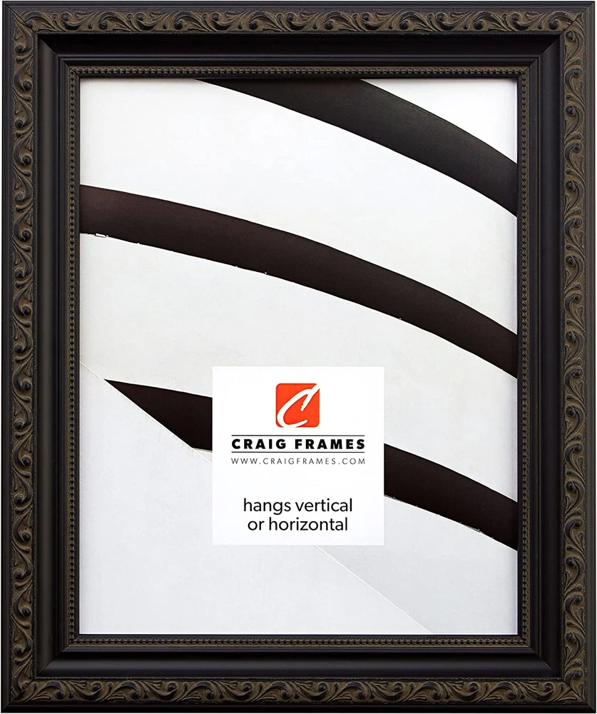 Ornate style; black with gray tones; embossed finish Frame includes: acrylic facing, cardboard backing and wire hanging kit (assembly required) Frame holds a 16 inch by 20 inch photo/print/poster (viewable area reduced by .25" on each side due to frame lip) Frame moulding is 1.25 inches wide; solid wood core; composite exterior Composite profile encases a solid wood core; smooth finish with embossed ornate features Product Description Craig Frames American-made & Trusted for Over 30 years Craig Frames offers hundreds of styles and sizes. Our products include picture frames, poster frames, photo frames, collage frames, document frames, framed maps, matting, bulletin boards, & more. A Trusted Brand & US Manufacturer Offering a Vast Selection of High Quality Home Décor Products Enjoy a vast selection of highly rated, affordable, professional quality picture frames and poster frames for wall hanging or table top use. Craig Frames also offers 2-Packs & 4-Packs for gallery wall sets, large art projects, or wholesale purchases. Styles include Modern, Rustic, Farmhouse, Boho (Bohemian), Ornate, Metallic, Weathered & Distressed, and more. Most frames are available in 30+ popular sizes, and many are available in 500+ custom frame sizes. With more than 45,000 Seller Ratings, thousands of customers continue to enjoy our American-made picture frames for their home décor projects. Living room, bathroom, kitchen, bedroom, nursery, or office; we're confident you'll find the perfect style and size for your decorative project or business needs. Visiting our Brand Store provides a simple, well organized, way to discover framing solutions for every project or occasion. (Click 'Visit the Craig Frames Store' above) Exceptional Value, Selection, Quality, and Service Styles Available Modern, Farmhouse, Contemporary, Rustic, Boho, Antique, Ornate, Weathered, Distressed, Metallic, Natural, & More Sizes Available Most frames are available in 30 or more popular picture frame sizes. 500+ custom frame sizes available in some styles.. Occasions Birthday, Mother's Day, Father's Day, Christmas, Graduation, Baby Shower, Home Renovation, Off to School, & More. Quality American-made in Michigan by professional framers with materials sourced primarily in the USA. Reputation More than 45,000 seller reviews supporting our quality craftmanship and service. Service US based support team providing real-time service & solutions What Customers are Saying "Excellent service, safe packaging." "Actually arrived ahead of estimated delivery date" "Perfect frames for my antique posters! Very nice." "Amazing, better than I had envisioned." "Well packaged and arrived on time in perfect condition" "Sturdy, very well made frames." "Thank you for sending this so fast! It is just what I wanted."